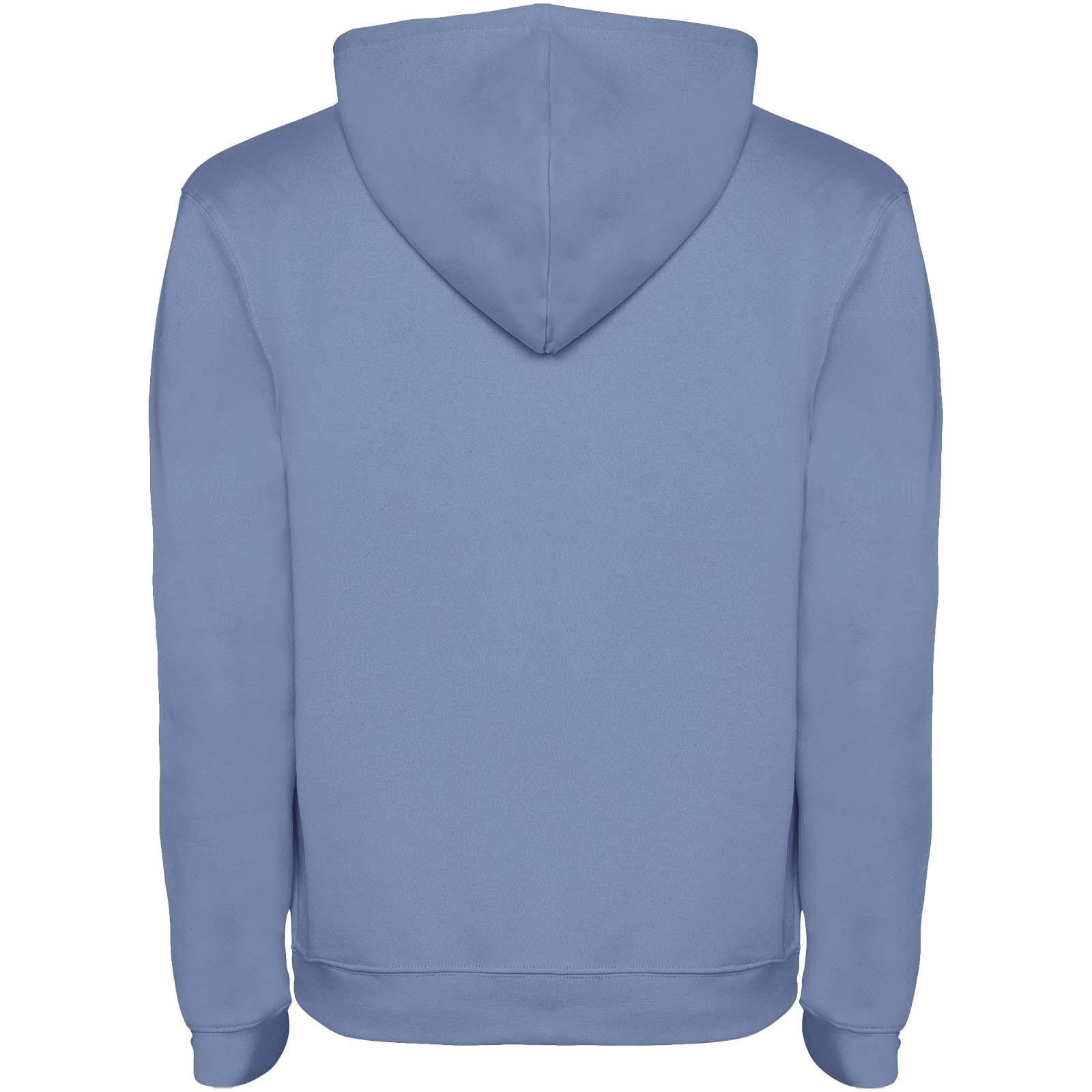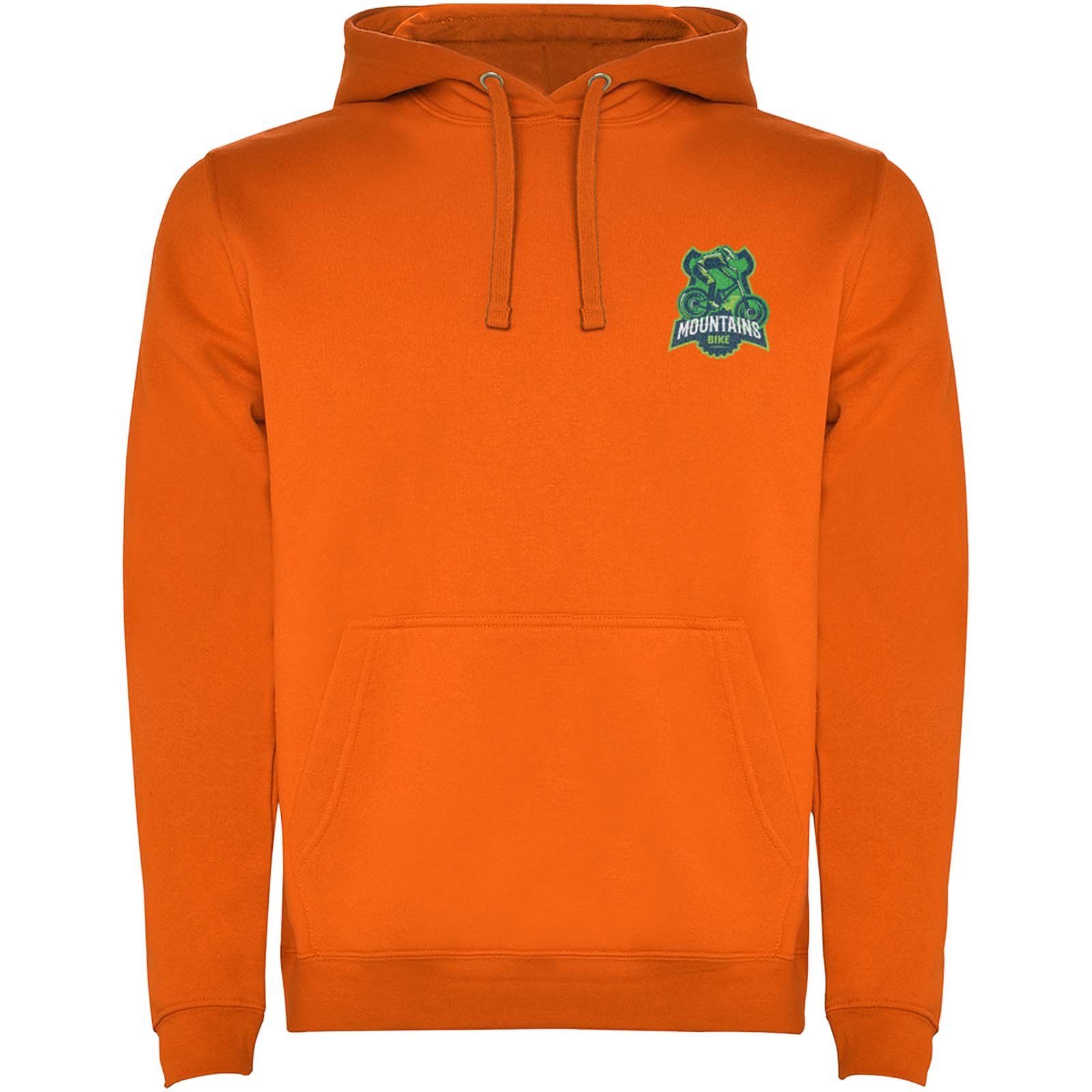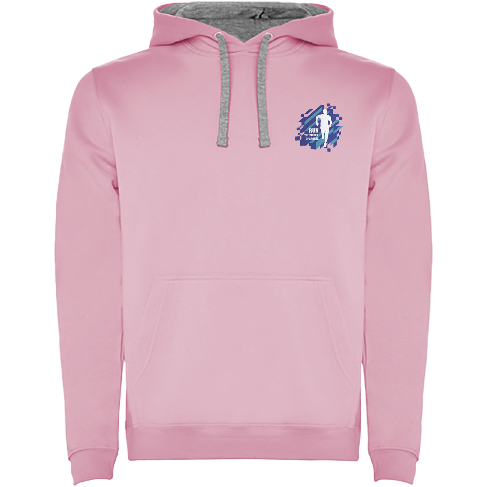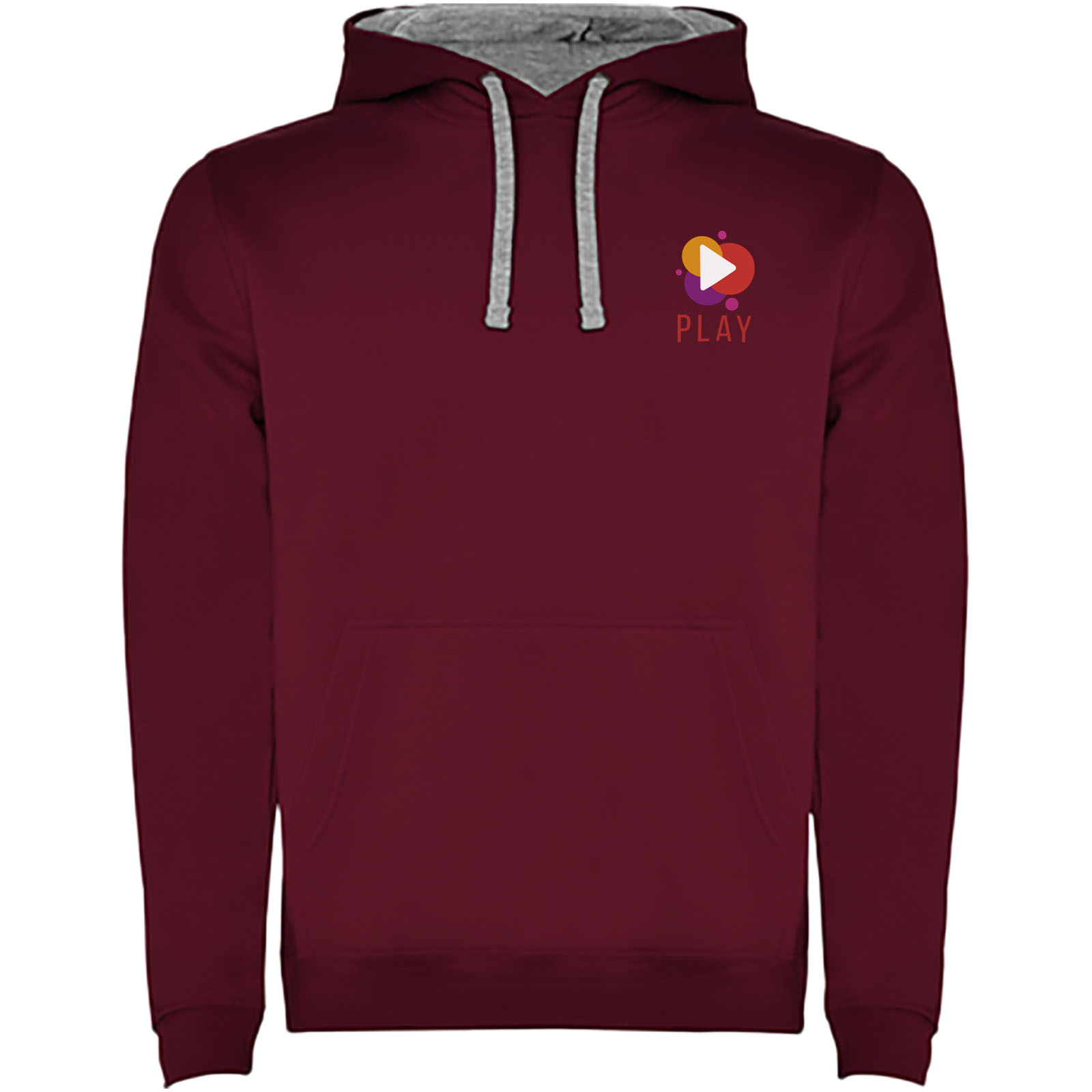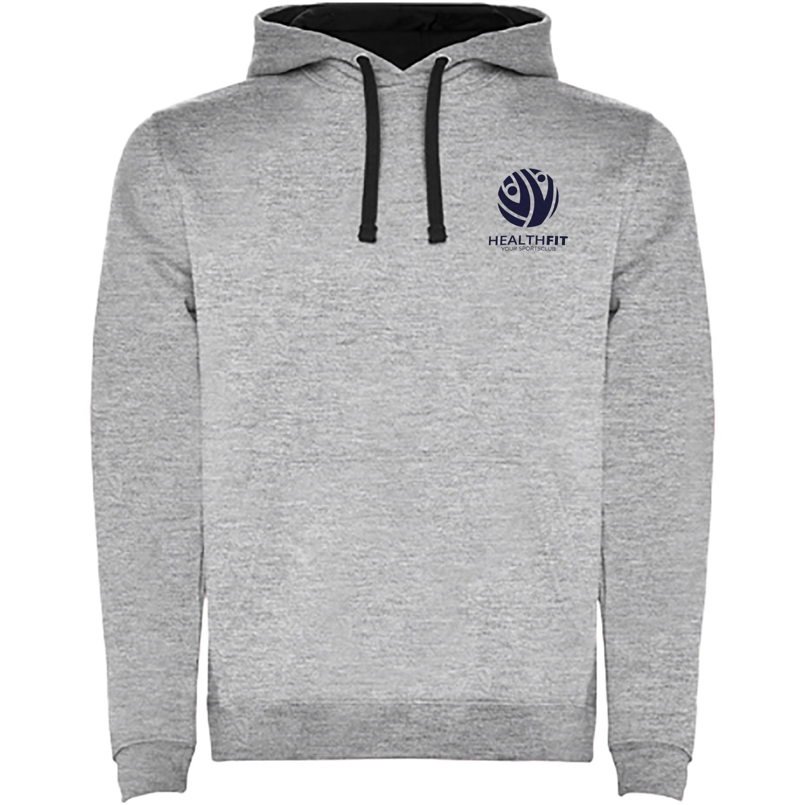 Dwukolorowa bluza z kapturem z podwójnego materiału, kontrastowym regulowanym sznurkiem, wzmocnionymi krytymi szwami w kołnierzu i kieszenią typu kangurka. Ściągacze 1×1 z elastanu w mankietach i pasie. Usuwalna metka.