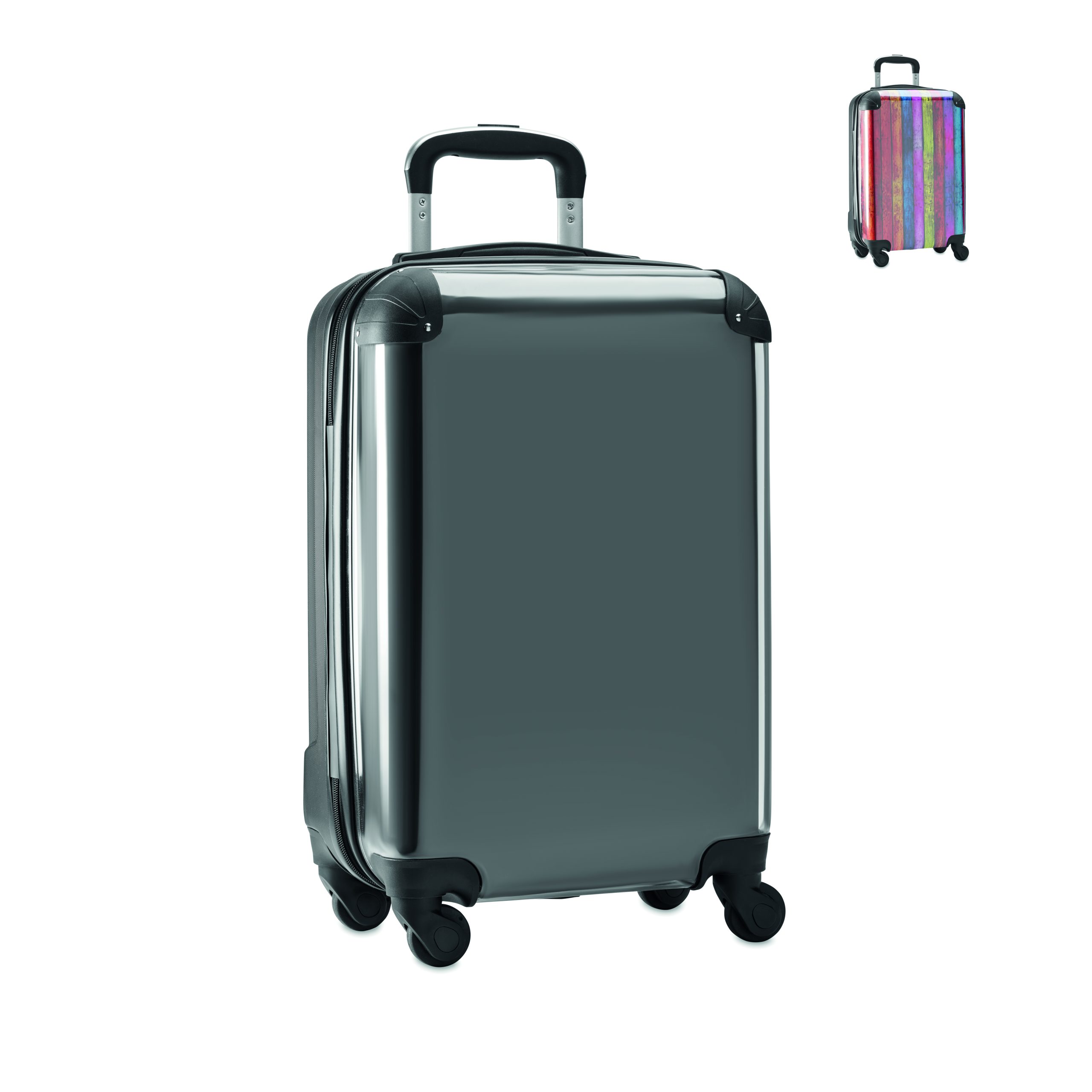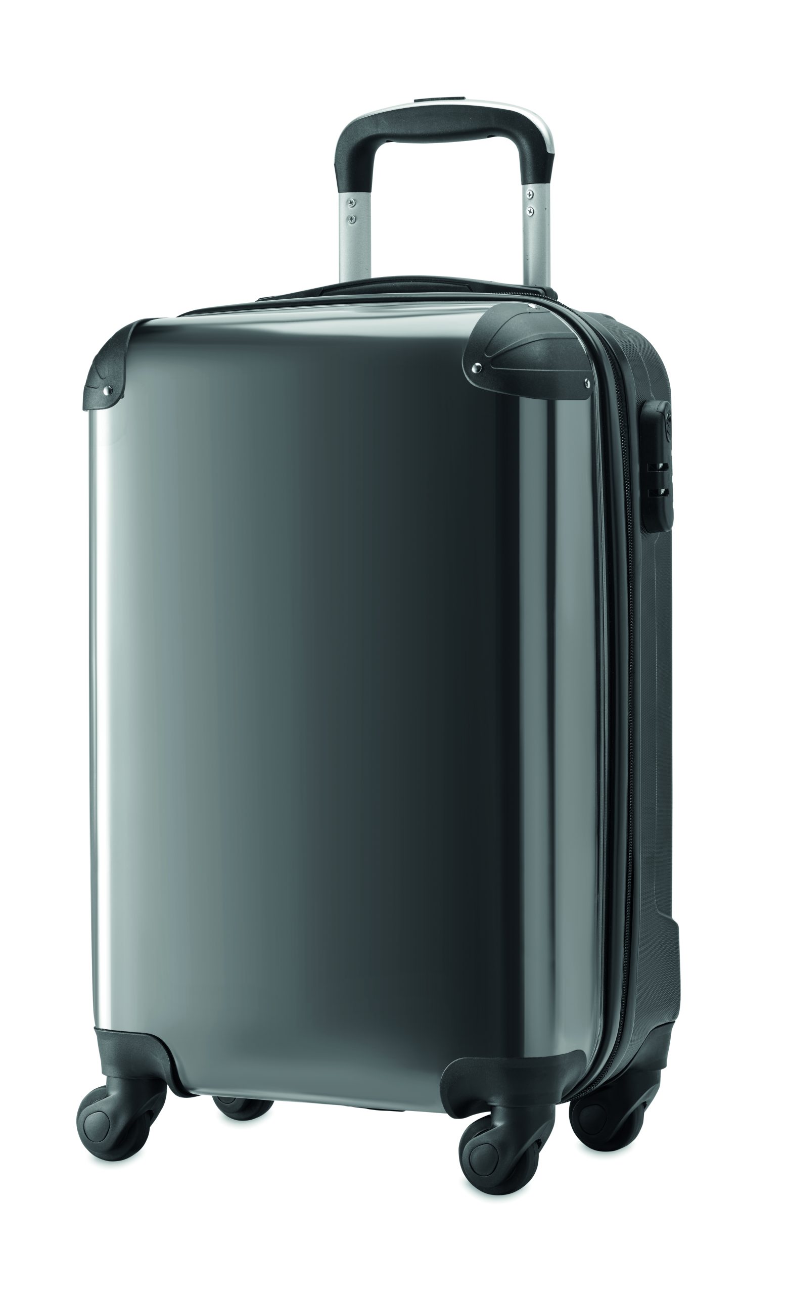 Walizka na kółkach z PC i ABS z możliwością umieszczenia grafiki. Posiada górną komorę zapinaną na zamek błyskawiczny i dolną komorę z tasiemkami. Zamek szyfrowy.