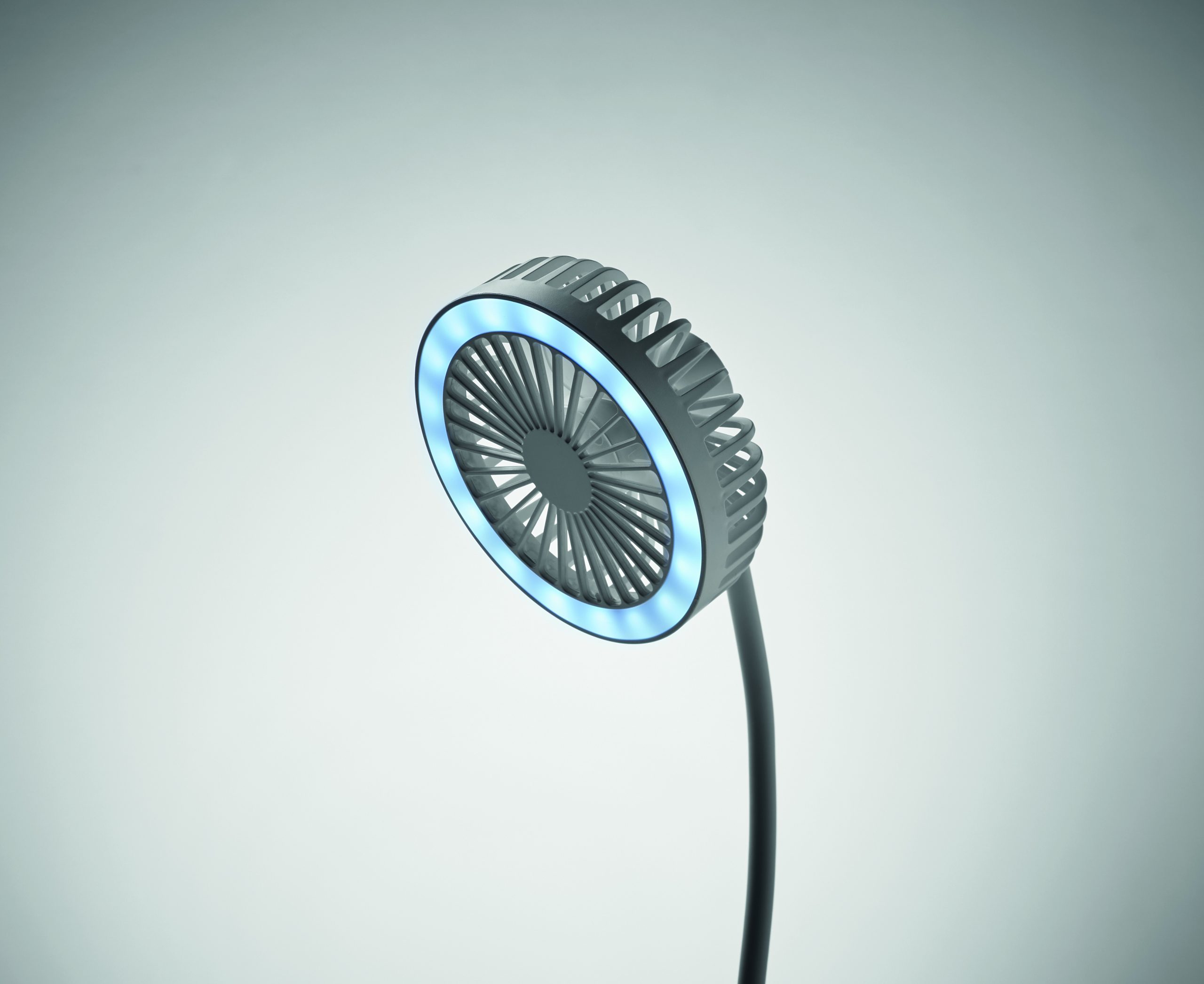 Biurkowy wentylator z ABS z 3 poziomami prędkości, z lampą LED (80 lumenów) i z bezprzewodową ładowarką 10W. Wyjście: DC 9V/1.1A (10W) do szybkiego ładowania.