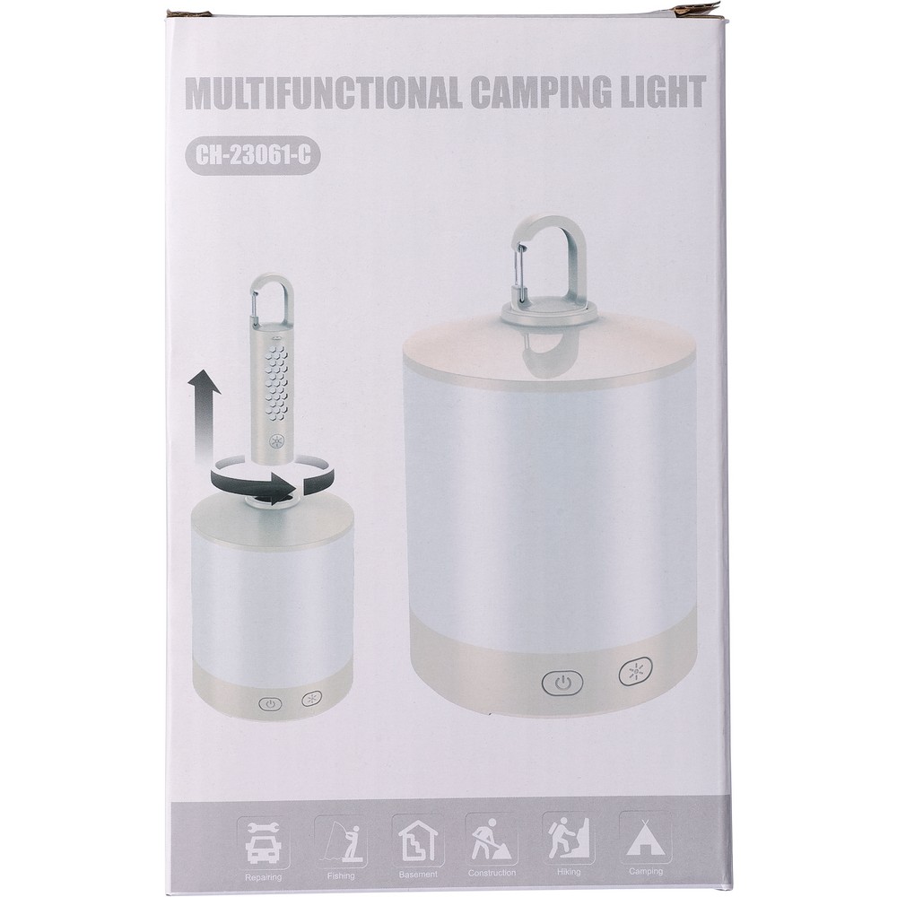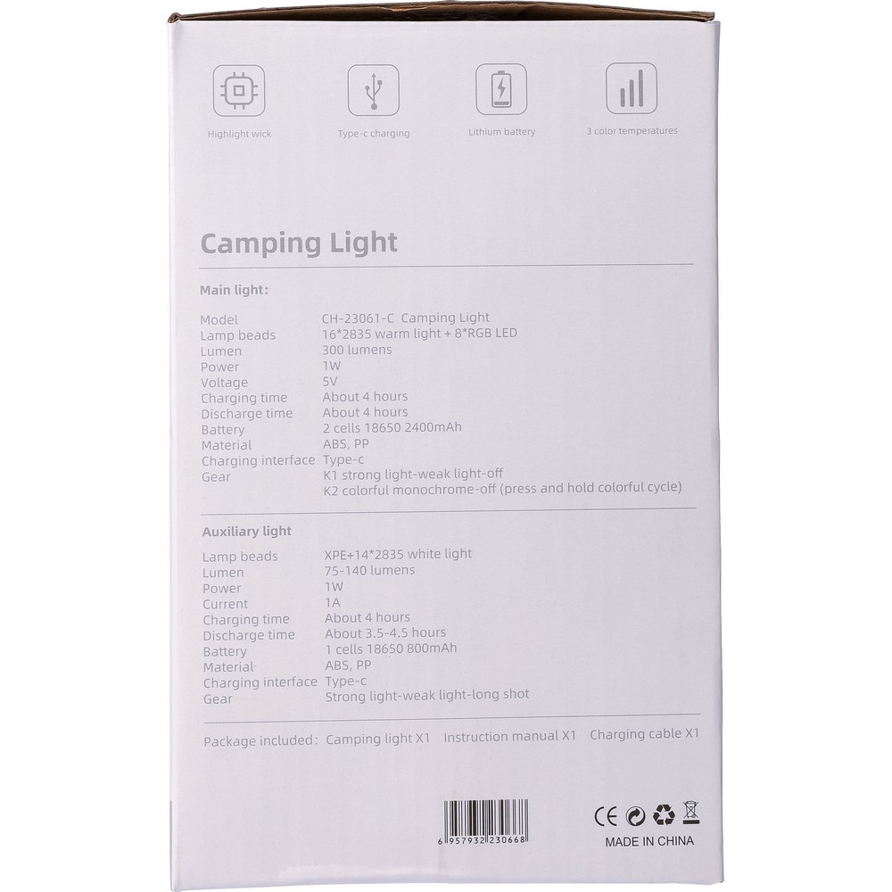 Wielofunkcyjna lampka kempingowa z funkcją RGB, odłączana latarka z karabińczykiem i 4 trybami oświetlenia, oferuje 8 kolorów, przy czym biały ma 2 tryby światła, pozostałe 7 kolorów można ustawić w trybie zmiany barw poprzez przytrzymanie przycisku, latarka posiada baterię 800 mAh, a lampka kempingowa 2 400 mAh, wyposażona w ładowanie przez USB typu C, indywidualnie pakowana w kartonowe pudełko, produkt wykonany z ABS