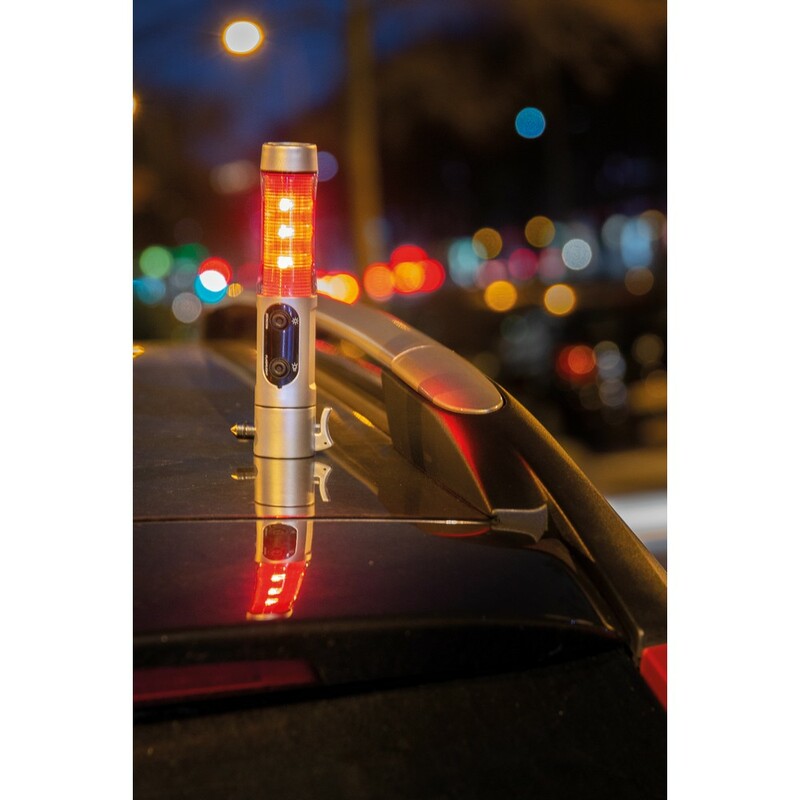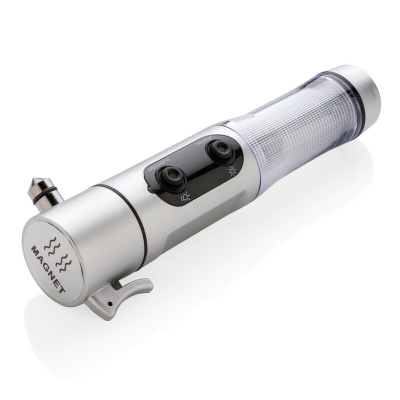 Latarka bezpieczeństwa, obudowa wykonana z ABS, 1 biała dioda LED oraz 9 czerwonych migających na boku, przecinak do pasów, młotek bezpieczeństwa, magnetyczna podstawka do przymocowania do karoserii samochodu, ślad węglowy produktu: 1,29 kg CO2