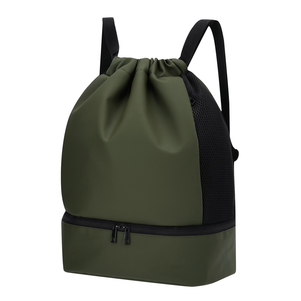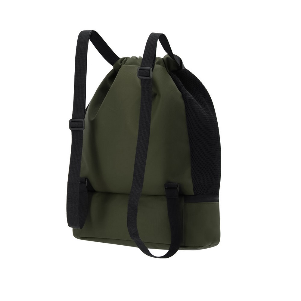 Worek z szerokimi paskami i 4 przegrodami, posiada dedykowaną przegrodę na buty, główna przegroda z siateczkowymi bokami, produkt wykonany z PU