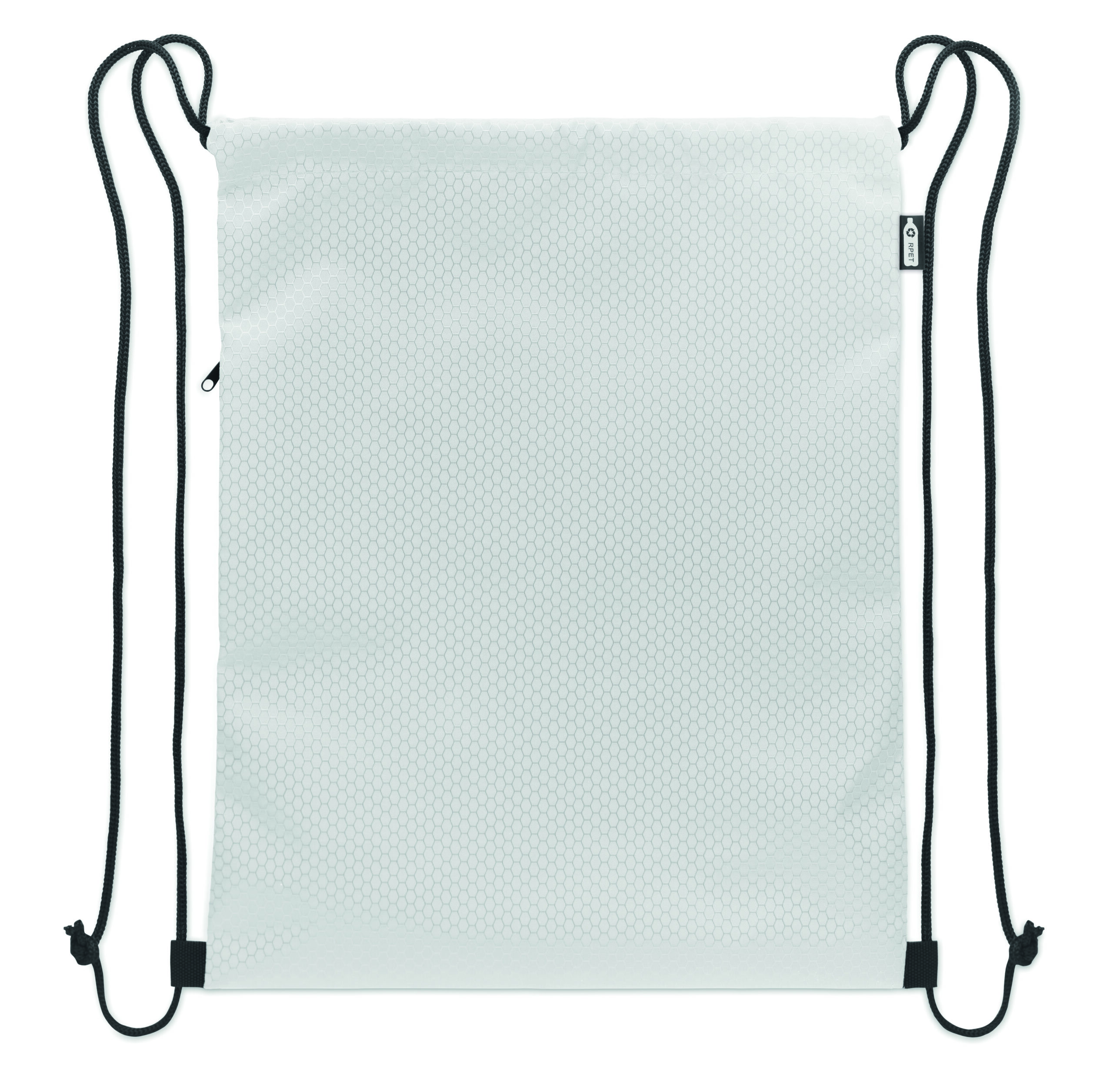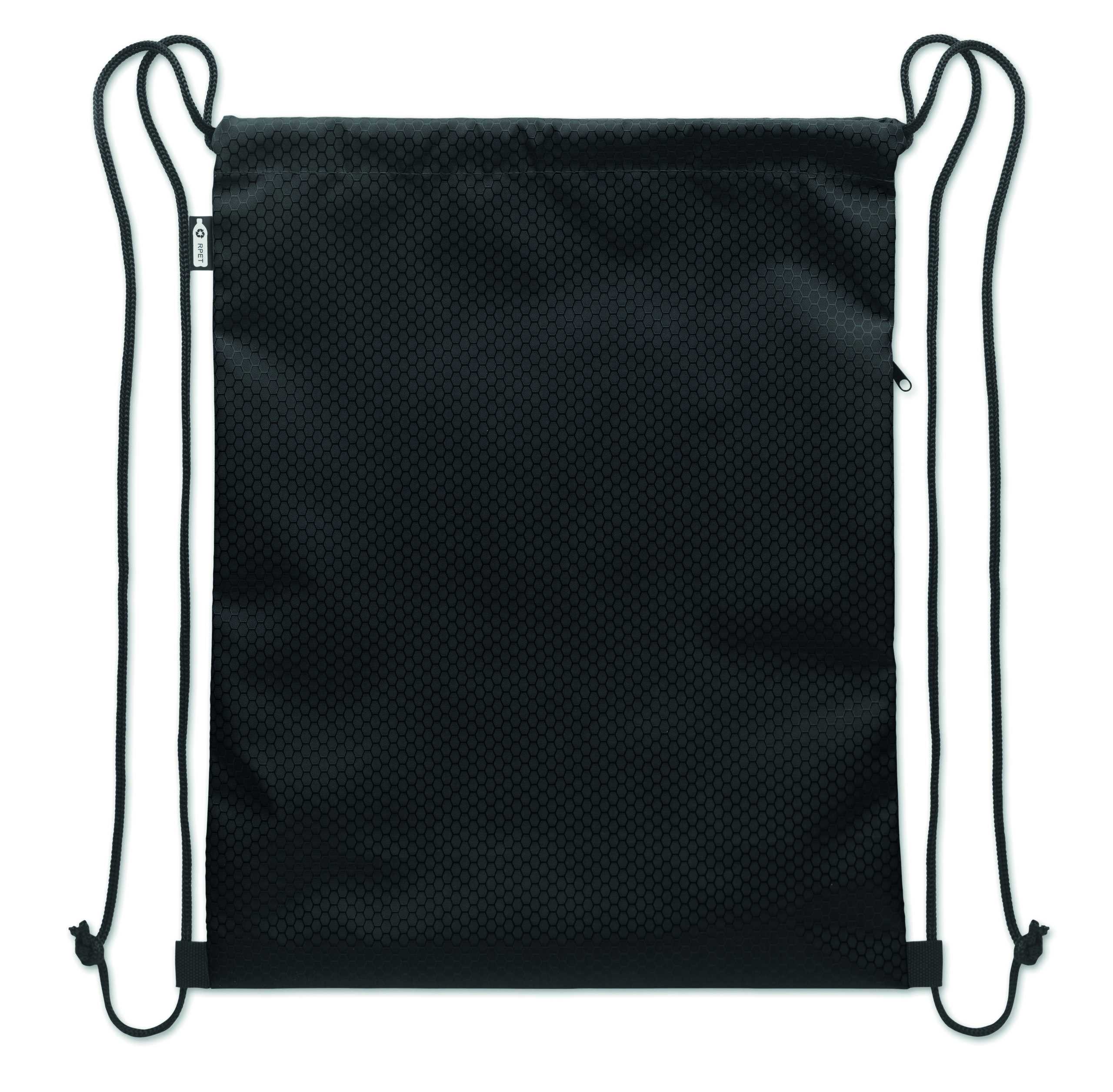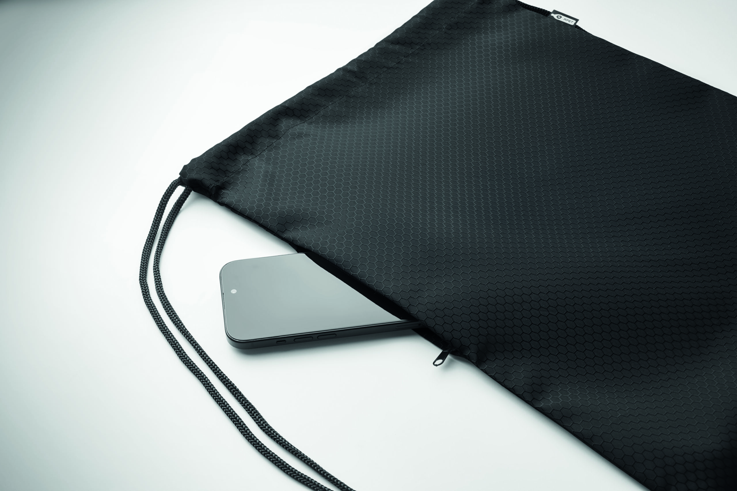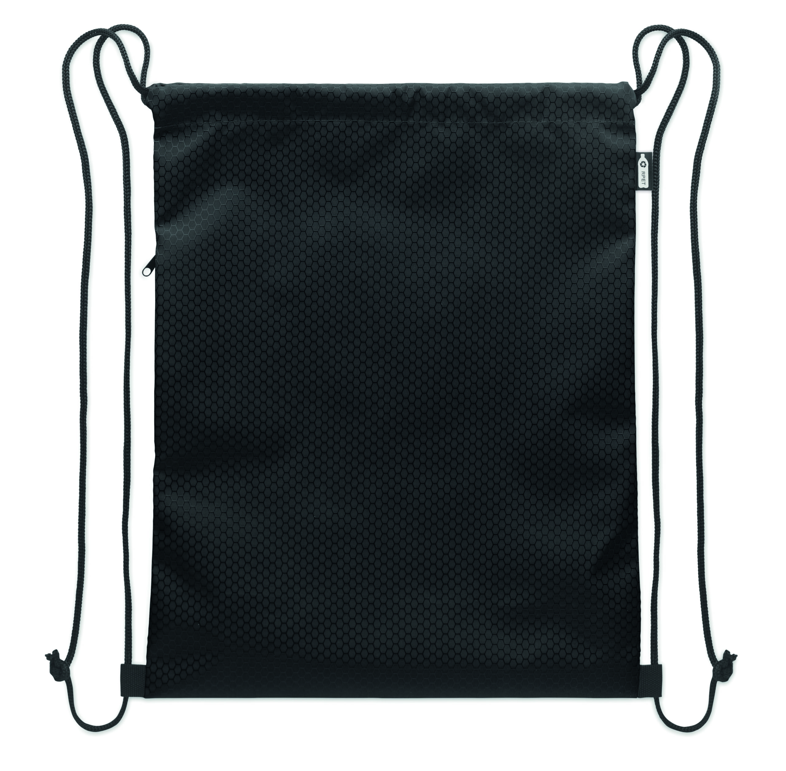 Worek ze sznurkiem wykonany z poliestru RPET 420D z pionową boczną kieszenią na zamek błyskawiczny i podszewką RPET 210D. Ma wytrzymałe sznurki. Pojemność 4,5 l, maksymalne obciążenie 5 kg.