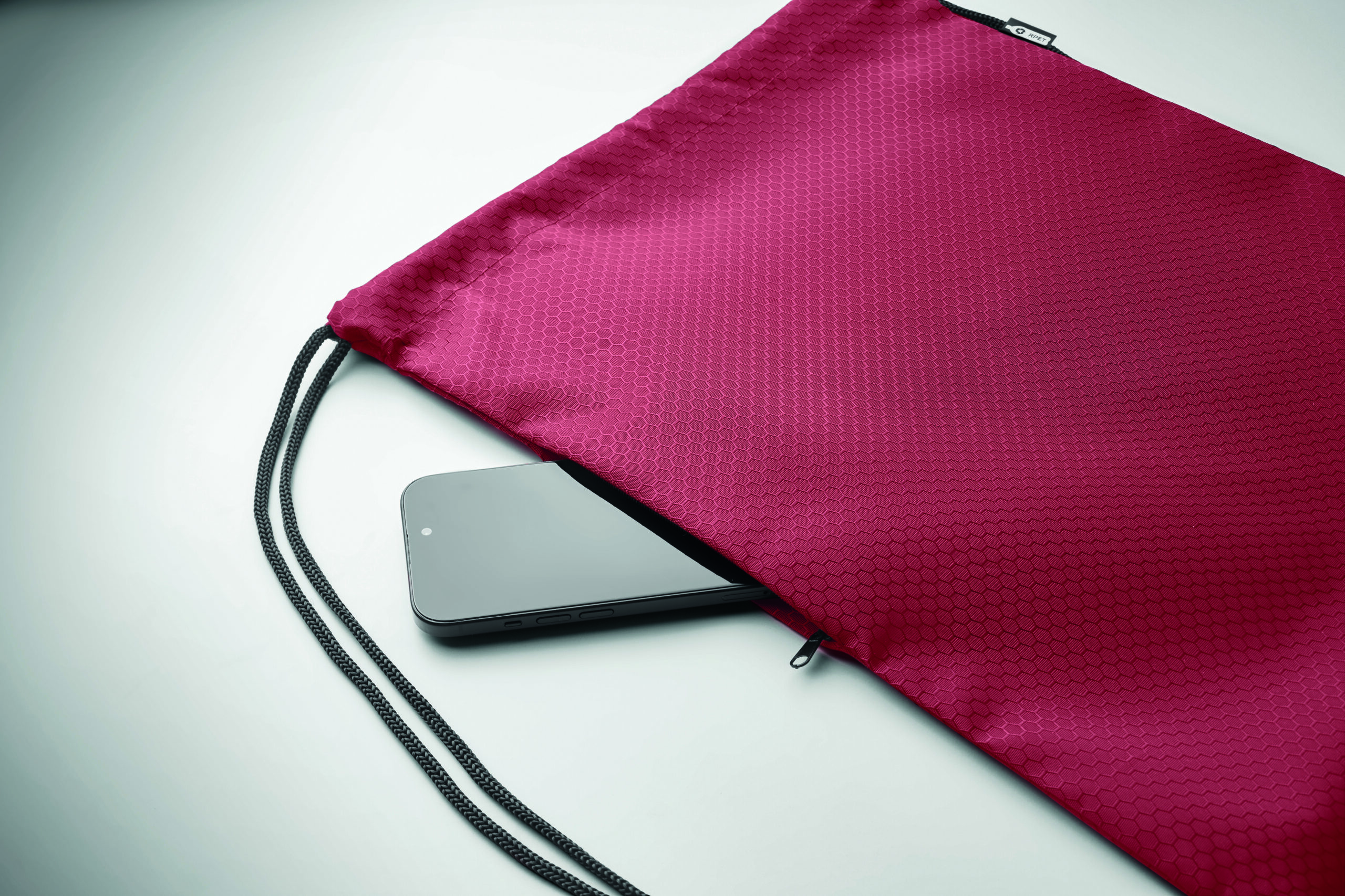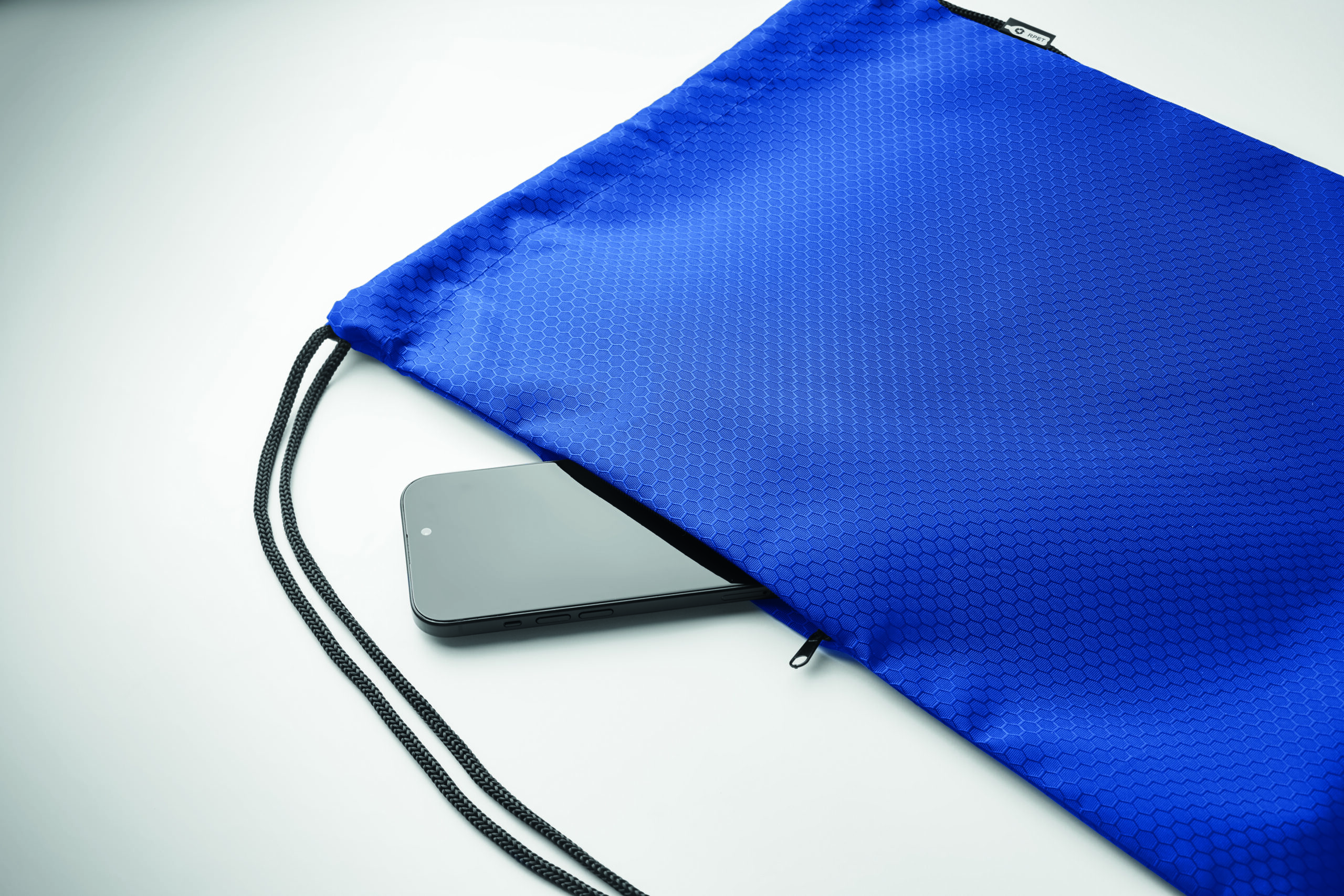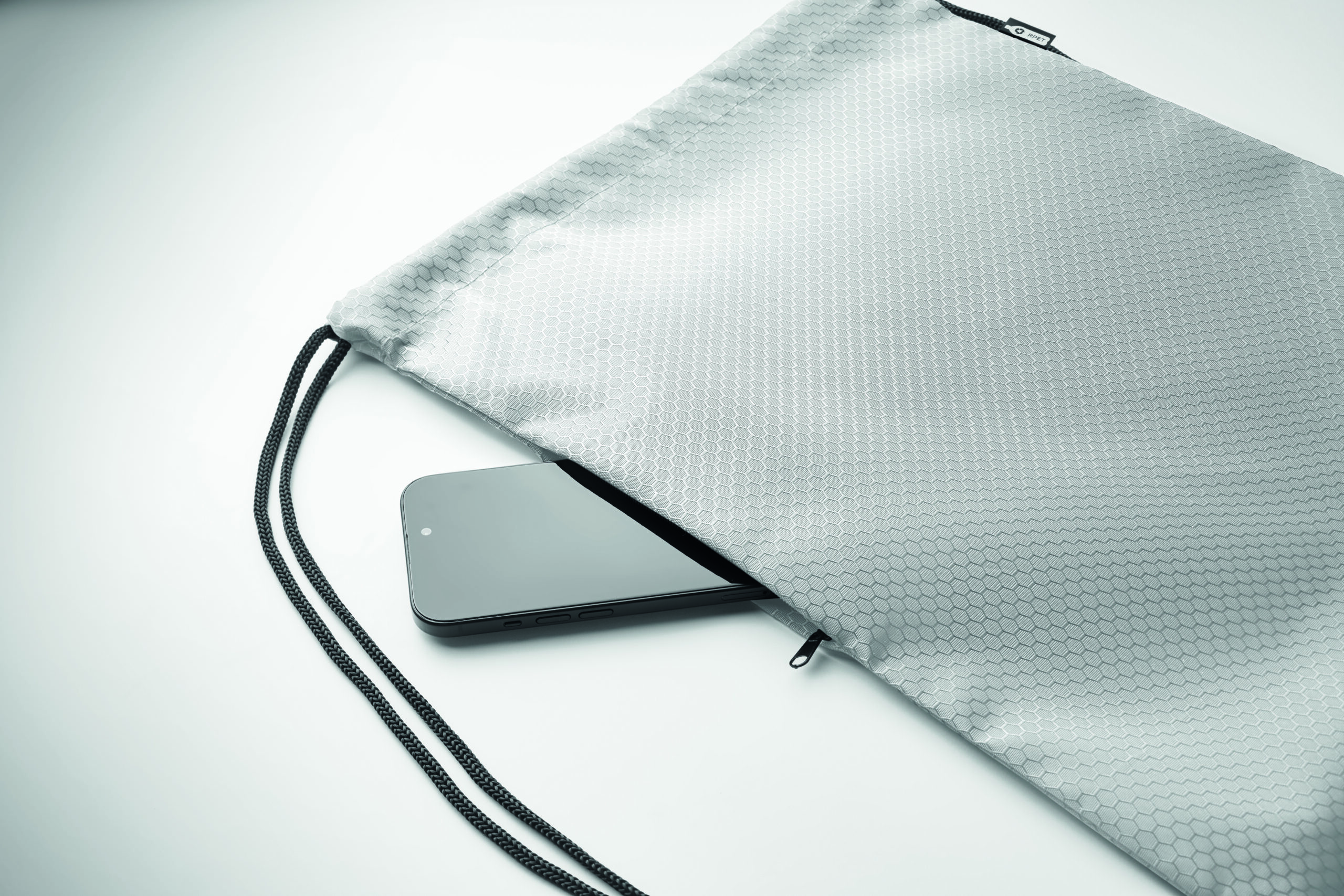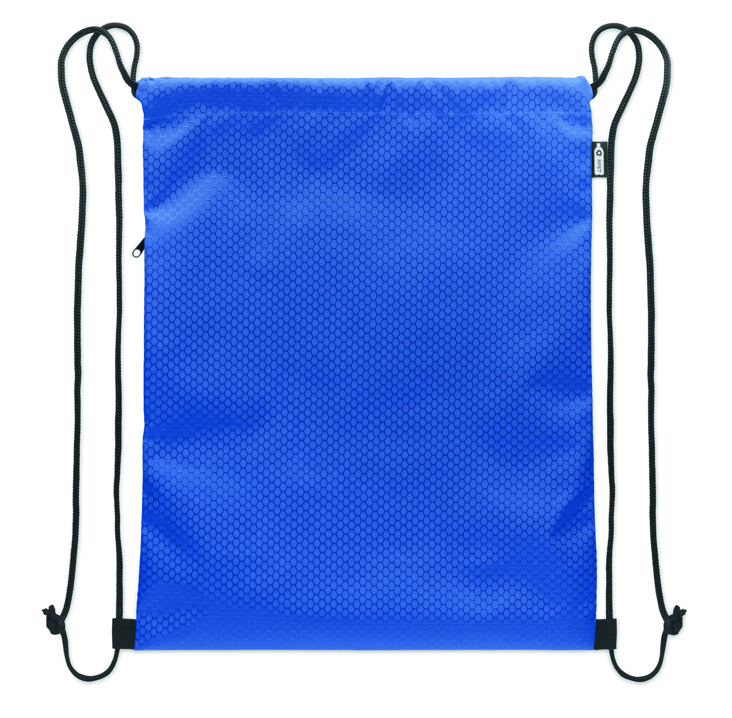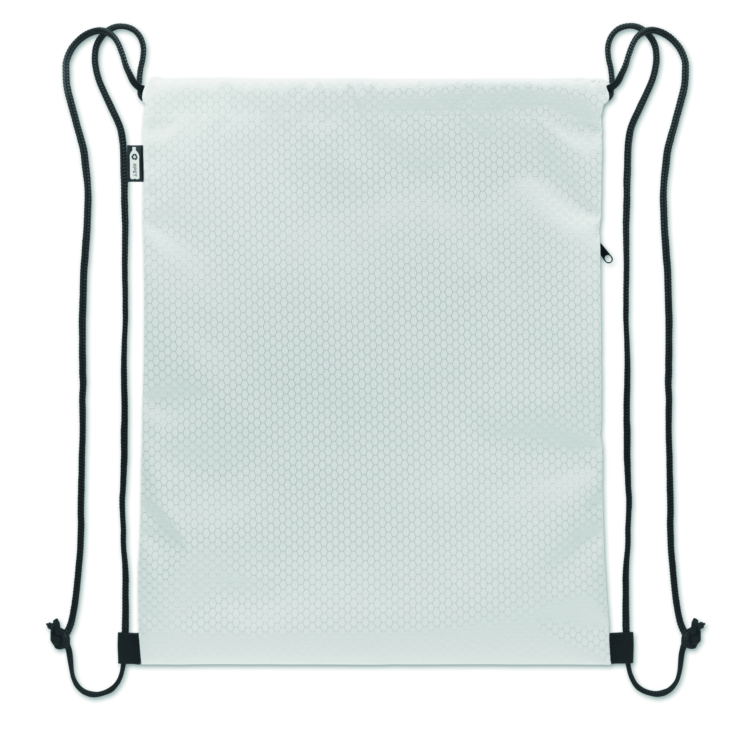 Worek ze sznurkiem wykonany z poliestru RPET 420D z pionową boczną kieszenią na zamek błyskawiczny i podszewką RPET 210D. Ma wytrzymałe sznurki. Pojemność 4,5 l, maksymalne obciążenie 5 kg.