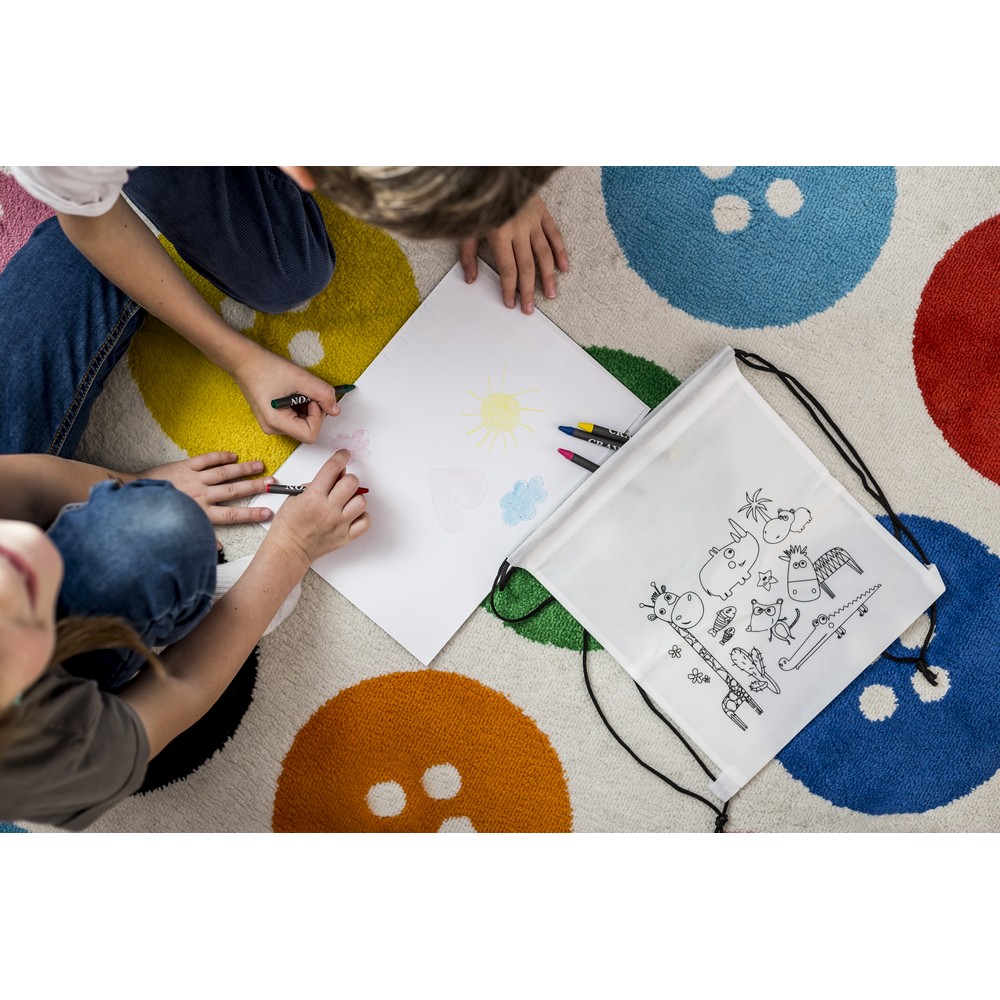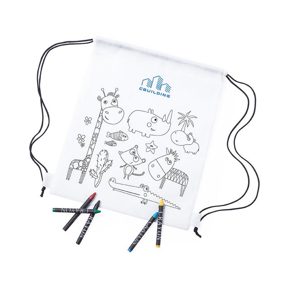 Worek ze sznurkiem umożliwiającym noszenie na plecach, kolorowanka z motywem zwierząt na froncie, 5 kredek świecowych w komplecie, produkt wykonany z materiału non-woven 80 g/m2