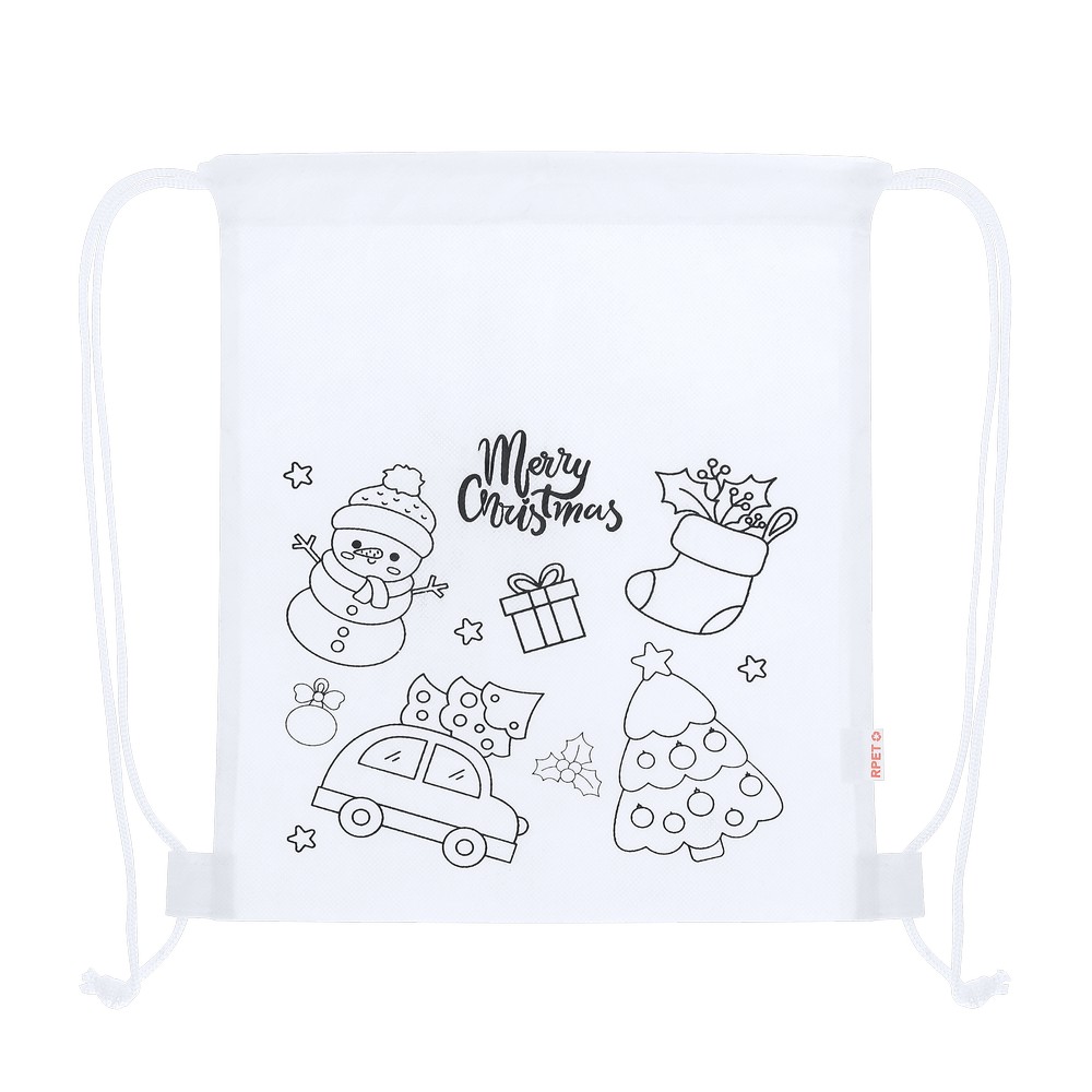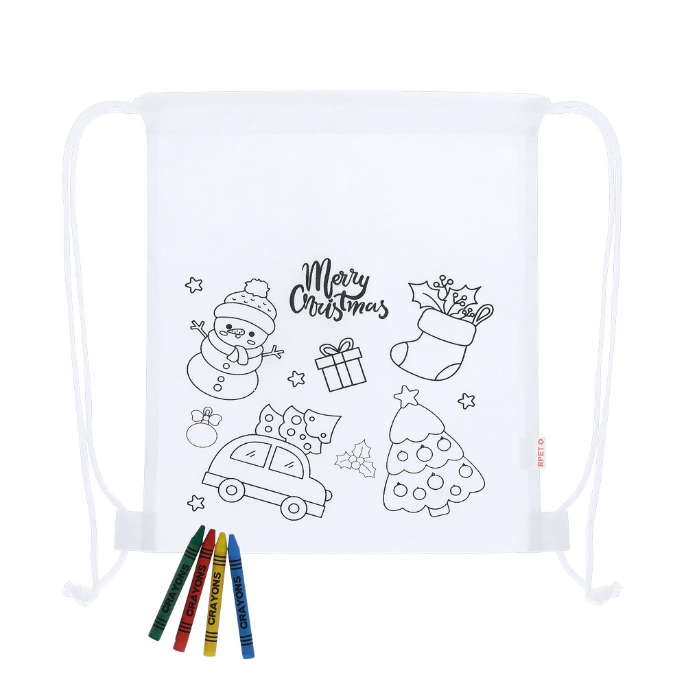 Worek ze sznurkiem umożliwiającym noszenie na plecach, kolorowanka z motywem świątecznym na froncie, 4 kredki świecowe w komplecie, ikona RPET na metce, produkt wykonany z materiału non-woven RPET