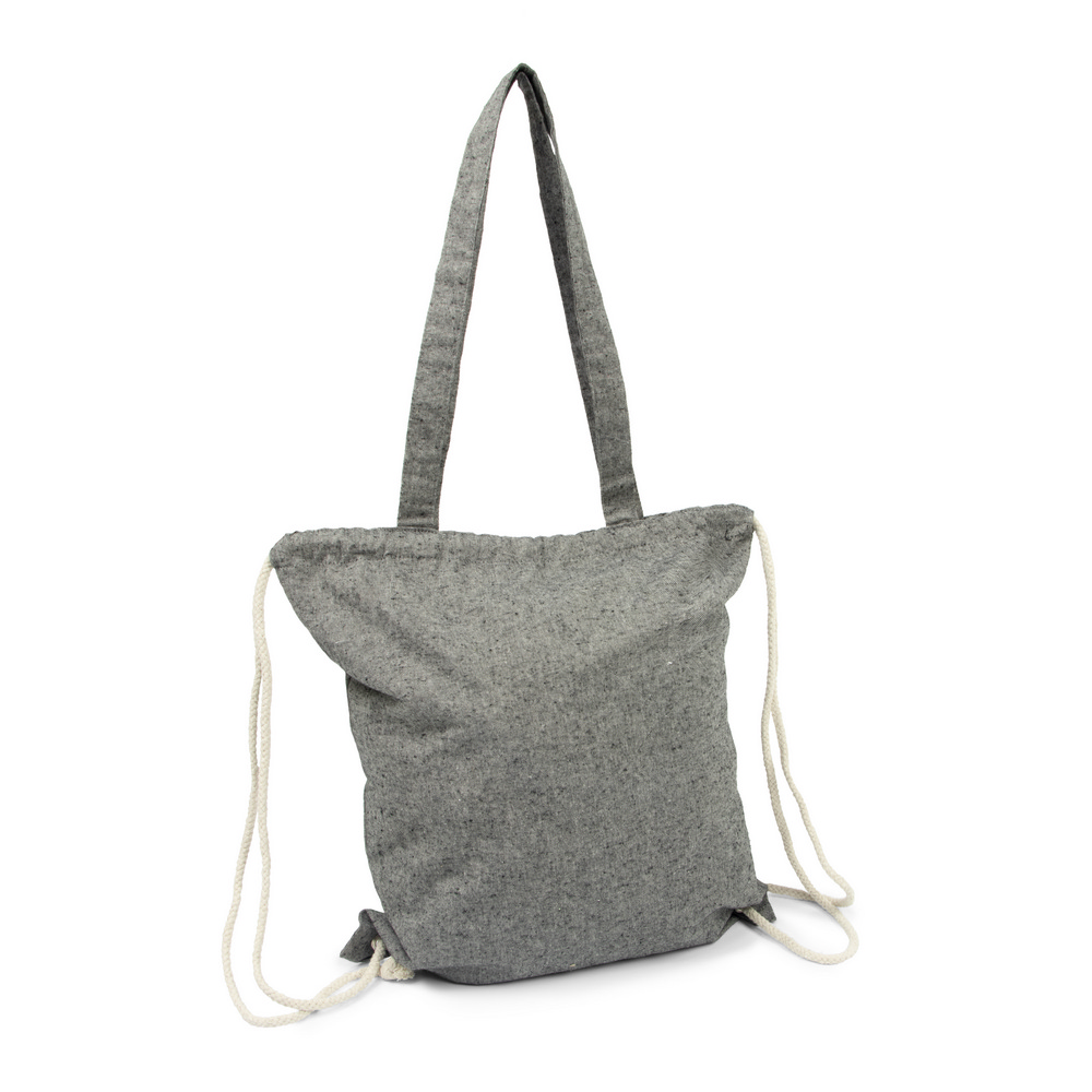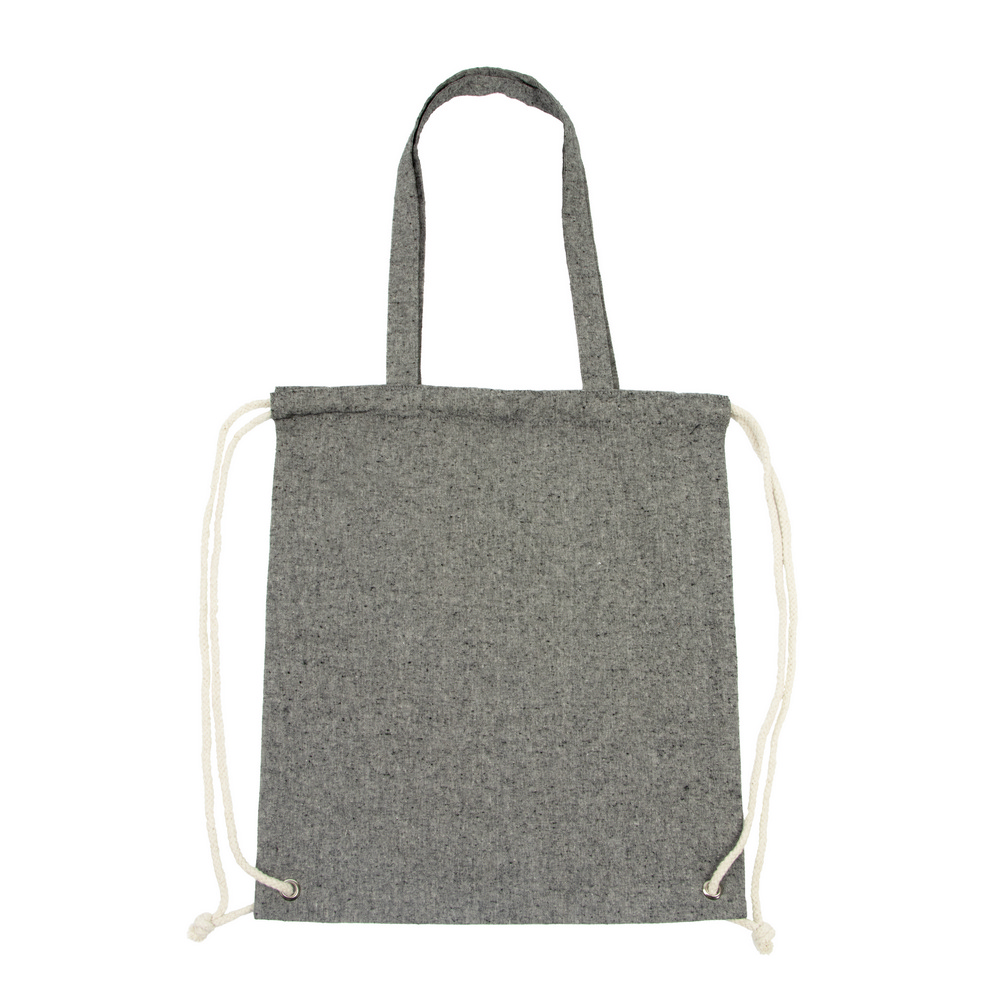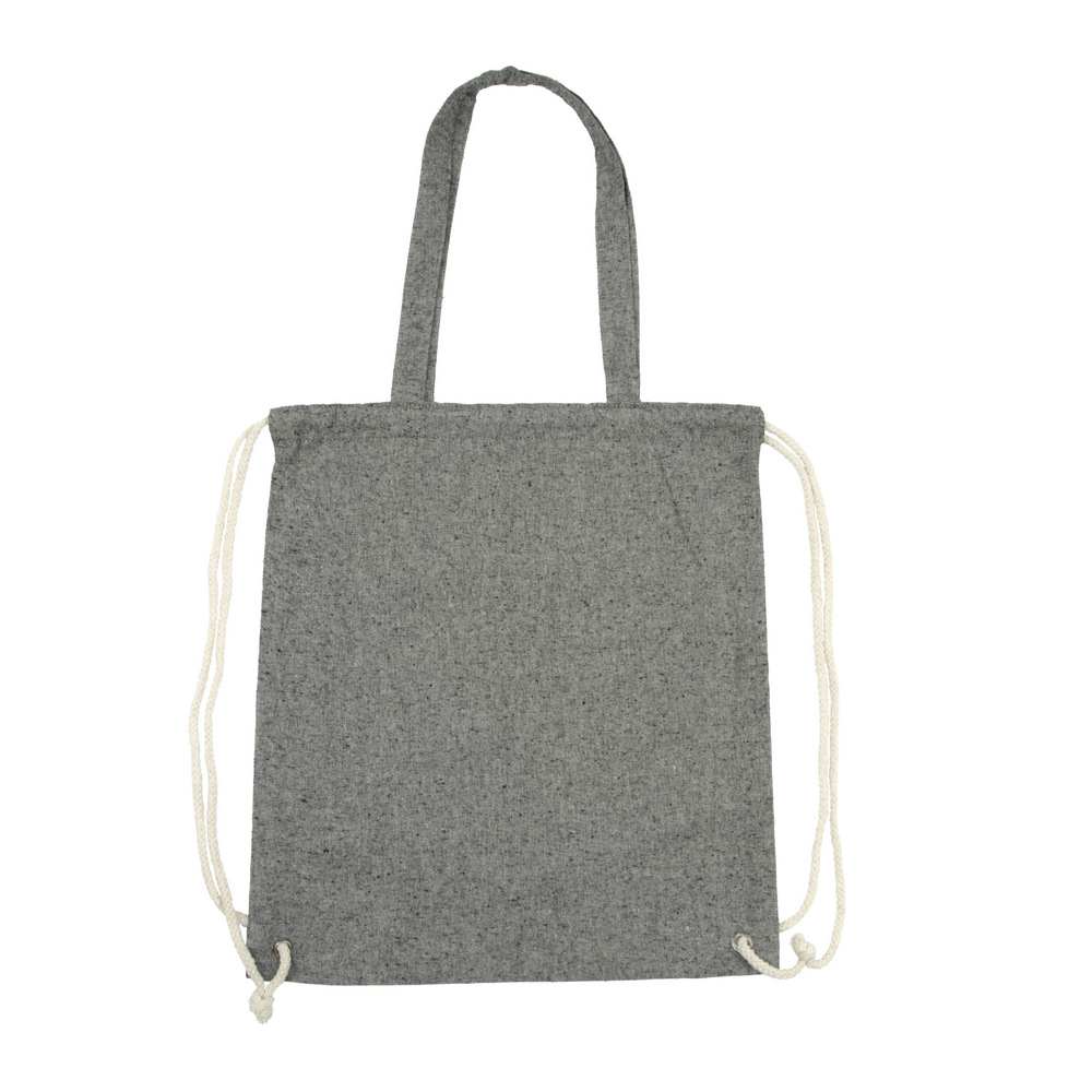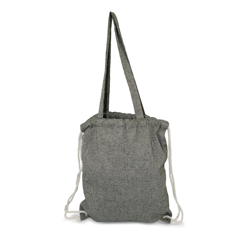 Worek ze sznurkiem i torba na zakupy 2 w 1, sznurki umożliwiają noszenie na plecach a długie uchwyty pozwalają nosić worek na ramieniu, pomieści drobne zakupy lub strój sportowy na siłownię, produkt wykonany z bawełny z recyklingu o gramaturze 140 g/m2