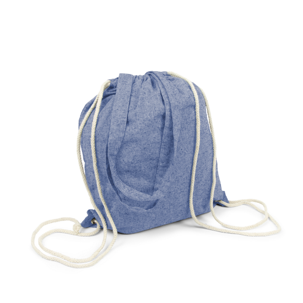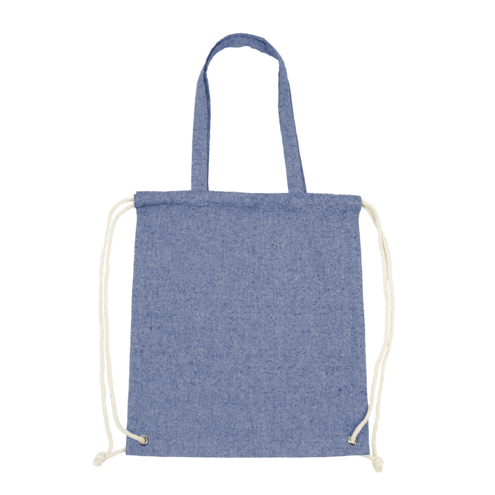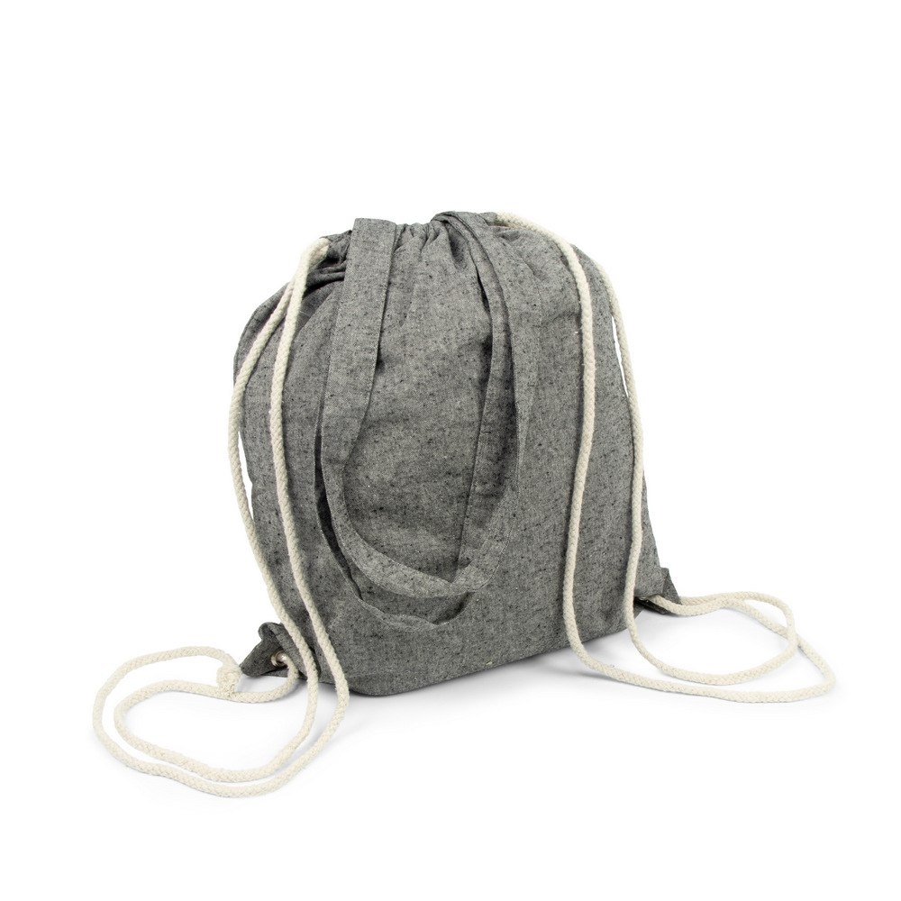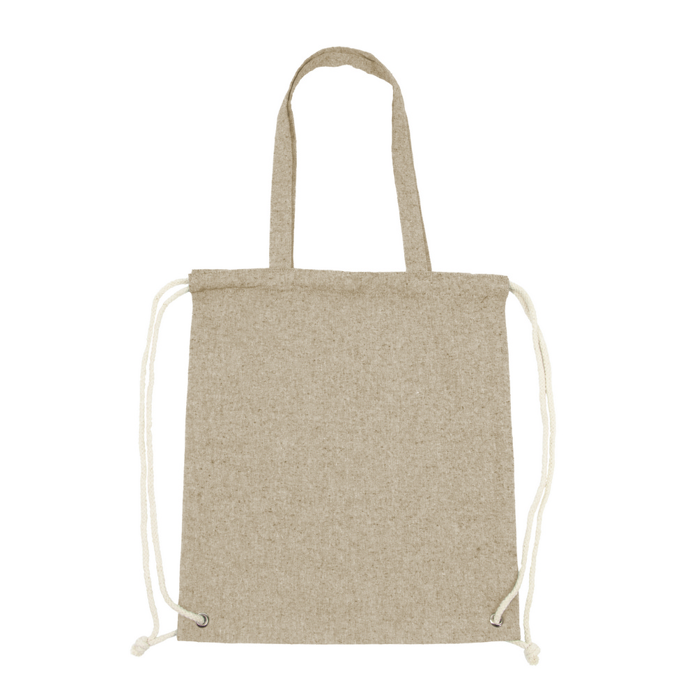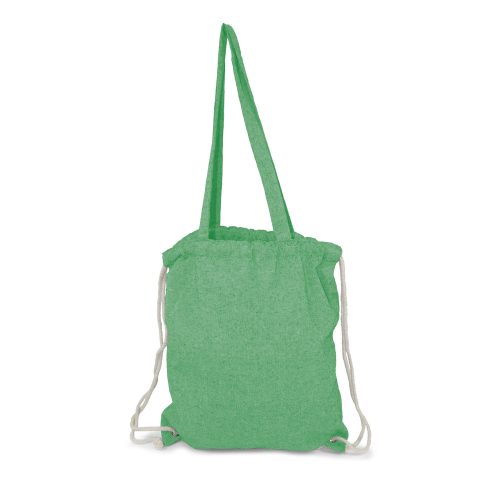 Worek ze sznurkiem i torba na zakupy 2 w 1, sznurki umożliwiają noszenie na plecach a długie uchwyty pozwalają nosić worek na ramieniu, pomieści drobne zakupy lub strój sportowy na siłownię, produkt wykonany z bawełny z recyklingu o gramaturze 140 g/m2