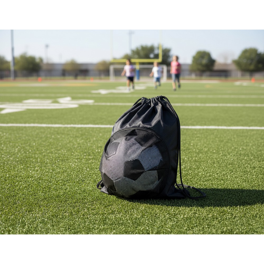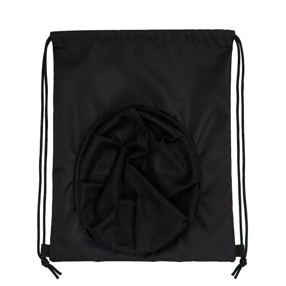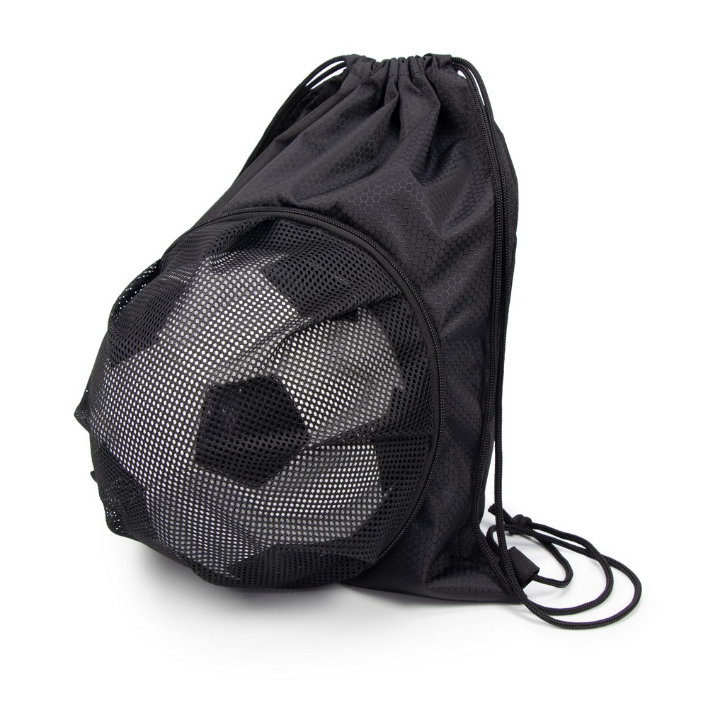 Worek ze sznurkiem, posiada zewnętrzną kieszeń z siatki na piłkę w rozmiarze 5, produkt wykonany z poliestru 300D o gramaturze 180 g/m²
