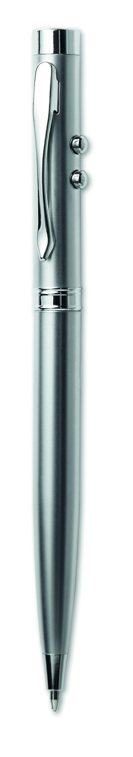 Wielofunkcyjny metalowy długopis. Niebieski wkład. Latarka z białym światłem LED. Czerwony wskaźnik laserowy. 3 baterie zegarkowe dołączone. Drewniane pudełko. Klasa bezpieczeństwa: II.