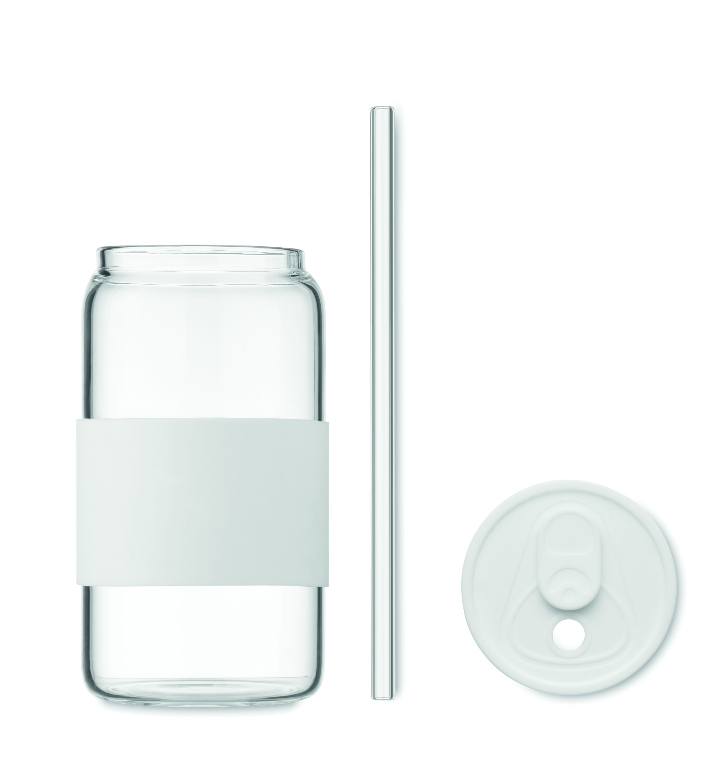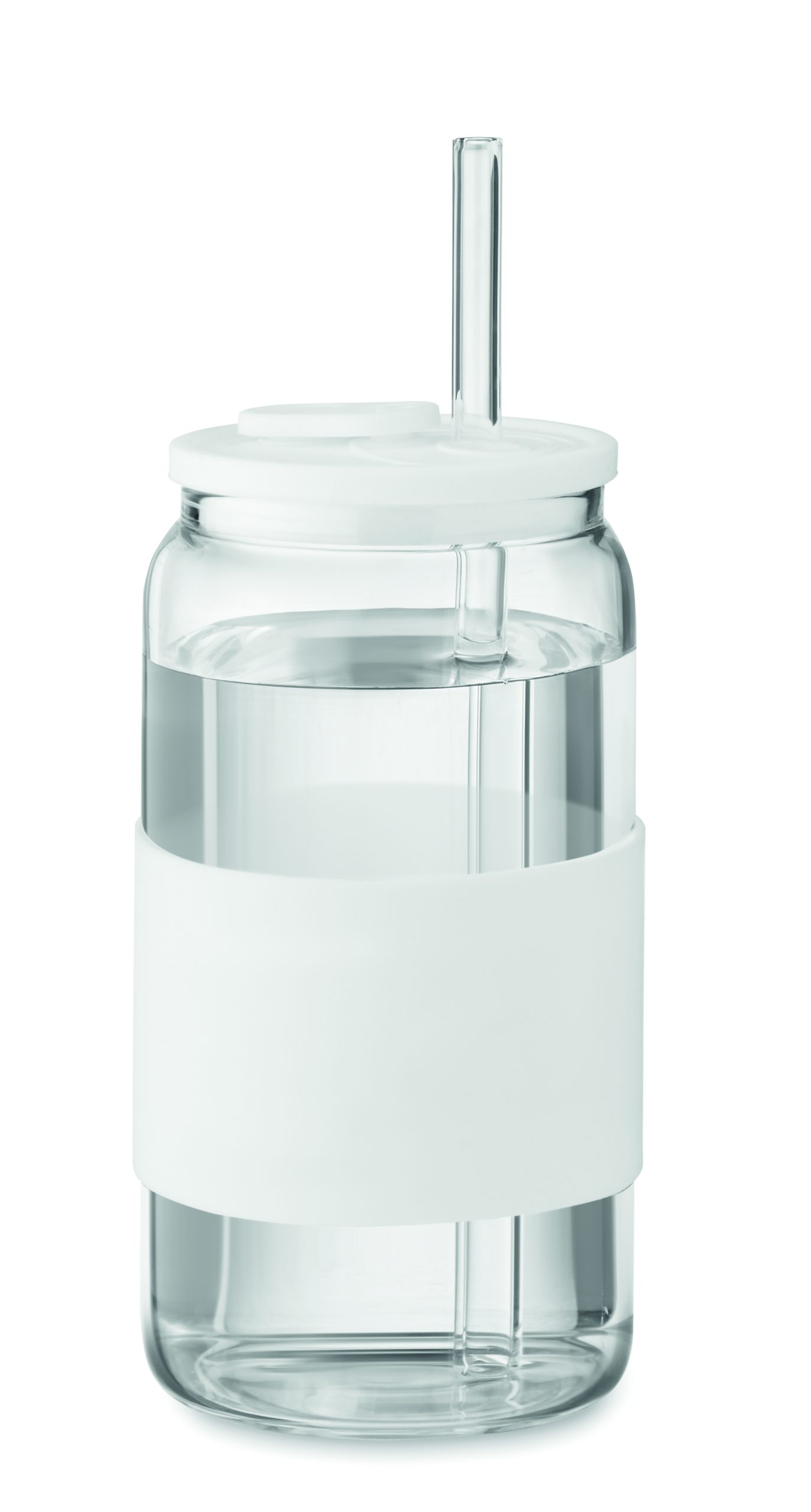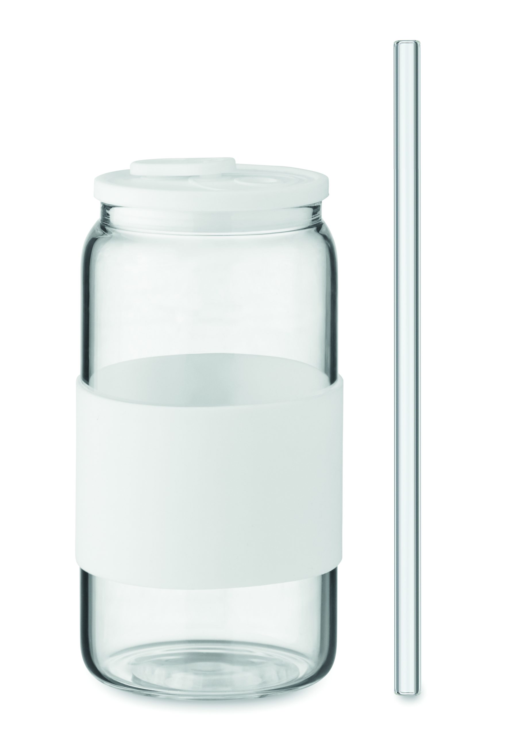 Wysoki kubek ze szkła borokrzemowego z silikonową pokrywką i uchwytem. Zawiera słomkę ze szkła borokrzemowego. Pojemność: 550 ml.