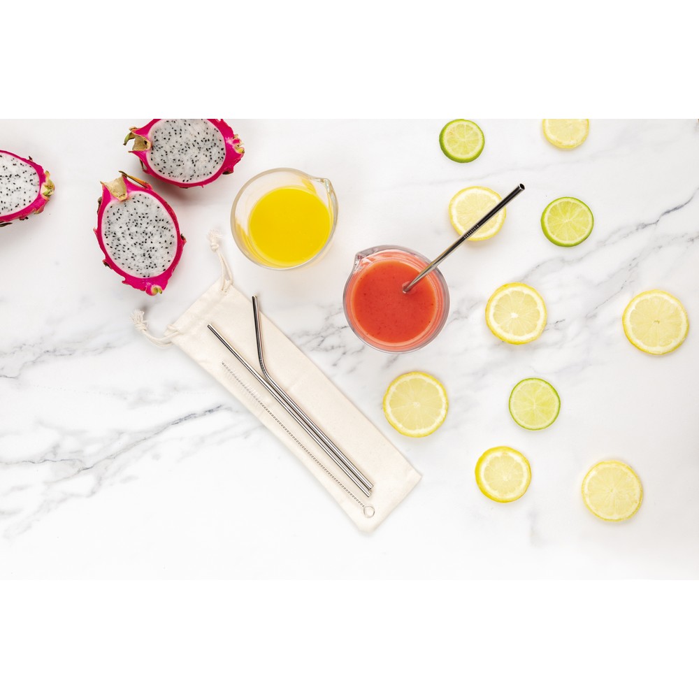 Zestaw 3 słomek wielokrotnego użytku, w komplecie: 2 słomki proste, 1 wygięta i czyścik, wykonane ze stali nierdzewnej 304, w bawełnianym etui, można myć w zmywarce, nie zawiera BPA, ślad węglowy produktu: 0,55 kg CO2
