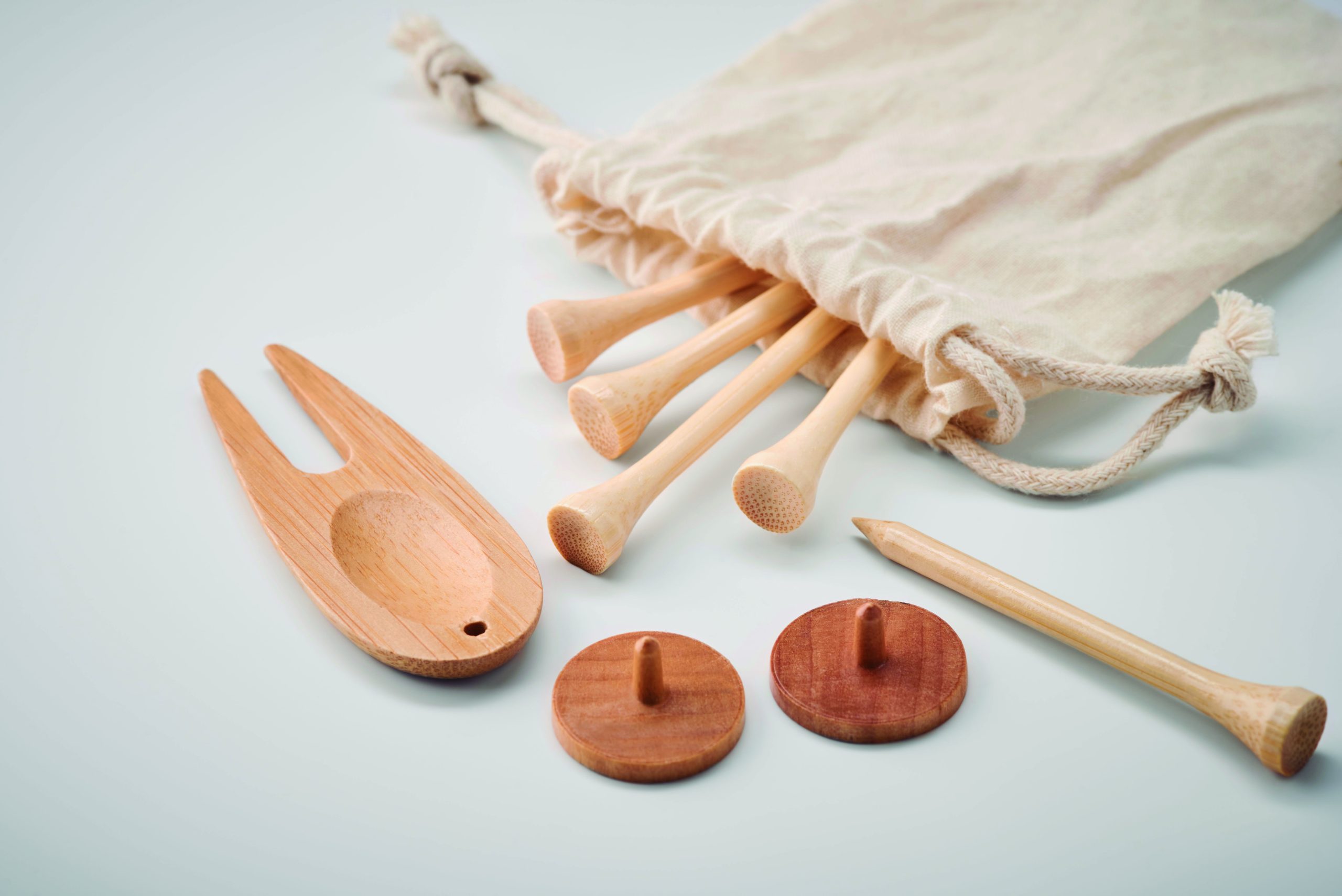 Akcesoria golfowe wykonane z bambusa, w tym 6 tees golfowych, 1 golf divot i 2 drewniane markery do piłkek, wszystko prezentowane w organicznej bawełnianej torebce drawstring. Bambus jest produktem naturalnym, dlatego mogą wystąpić nieznaczne różnice w kolorze, wzorze i rozmiarze.