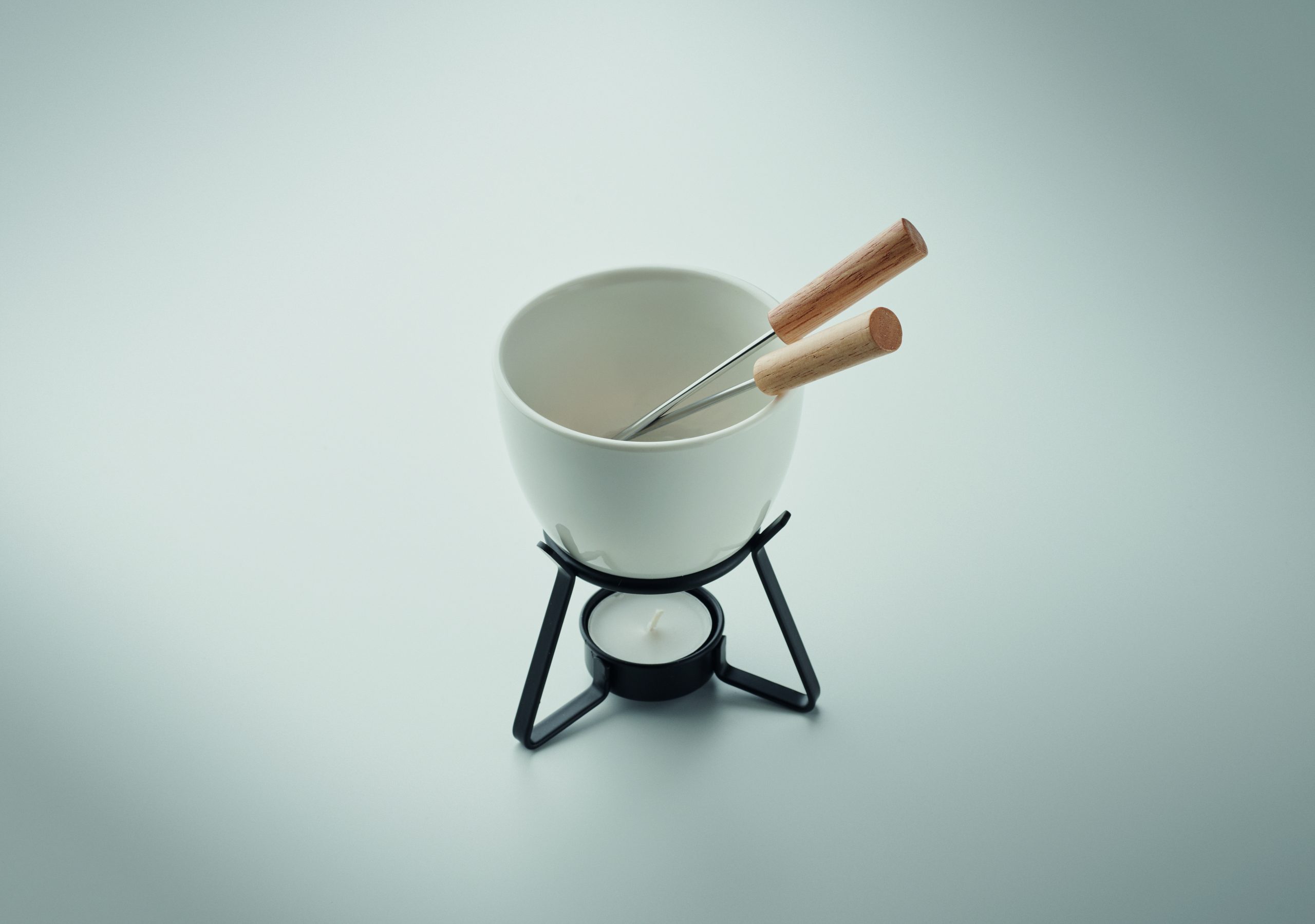 Mały ceramiczny zestaw do fondue dla dwóch osób. Zawiera dwa metalowe widelce z drewnianymi uchwytami. Tealight nie wchodzi w skład zestawu. Pojemność: 240 ml.
