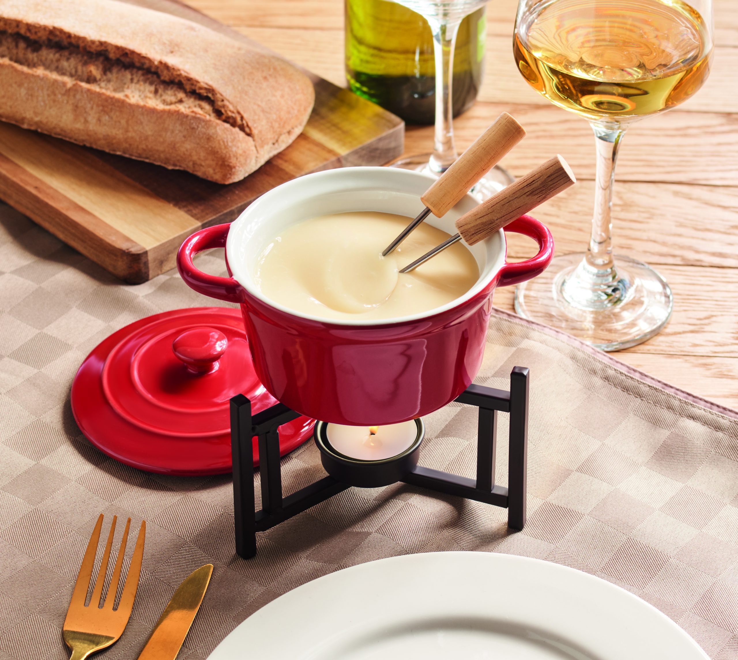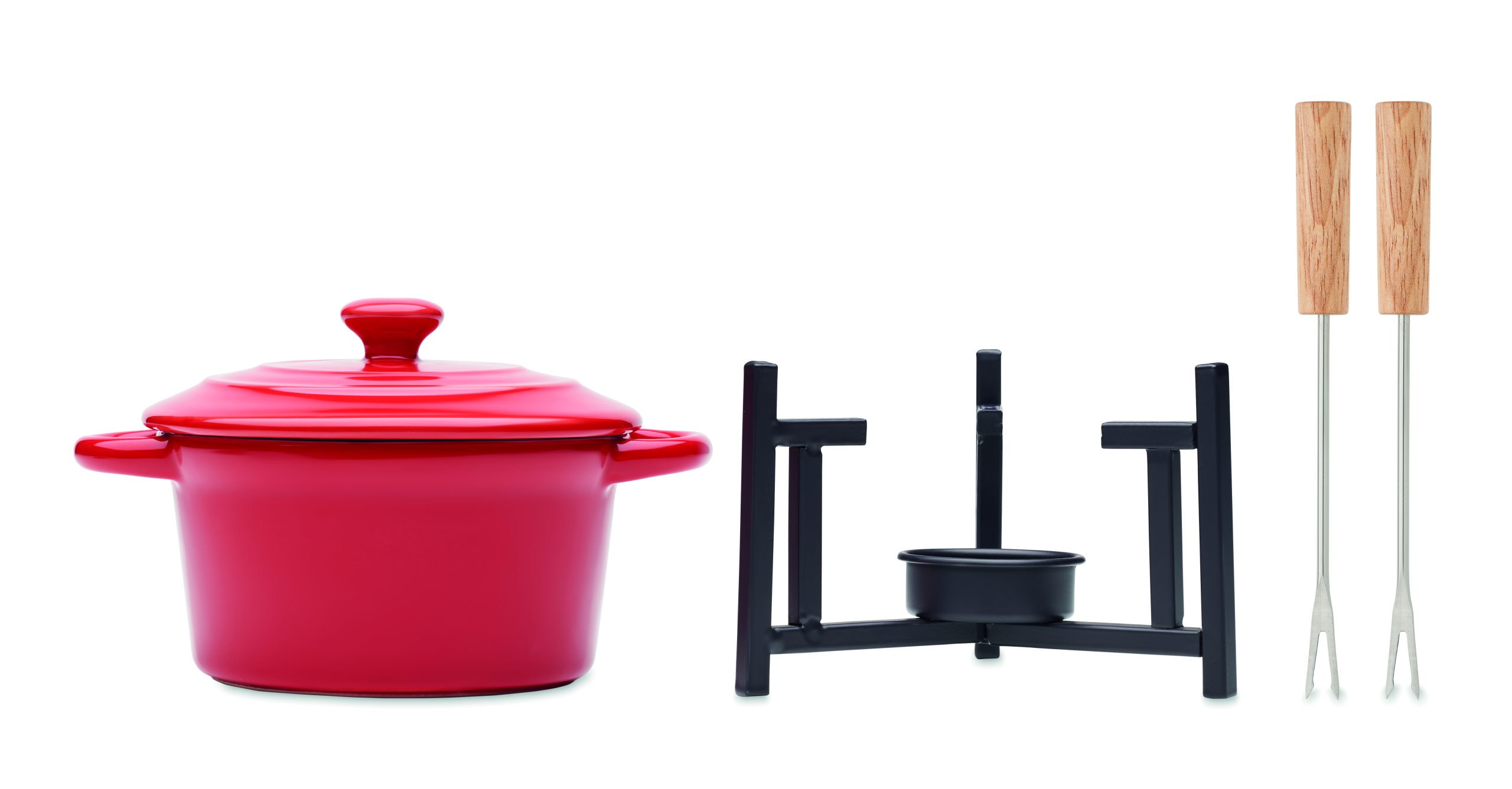 Mały ceramiczny zestaw do fondue dla dwóch osób. Zawiera 2 metalowe widelce z drewnianymi uchwytami. Tealight nie wchodzi w skład zestawu. Pojemność: 300 ml.
