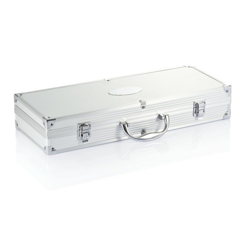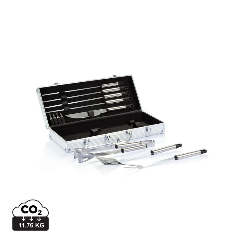 Zestaw akcesoriów do grilla ze stali nierdzewnej, 12 el., w komplecie: 4 szpikulce, nóż do krojenia, 4 sztućce do kukurydzy, szpatułka, widelec z pokrywą ochronną i para szczypiec, czarne uchwyty ze stali nierdzewnej, w aluminiowym pudełku z uchwytem, ślad węglowy produktu: 12,14 kg CO2