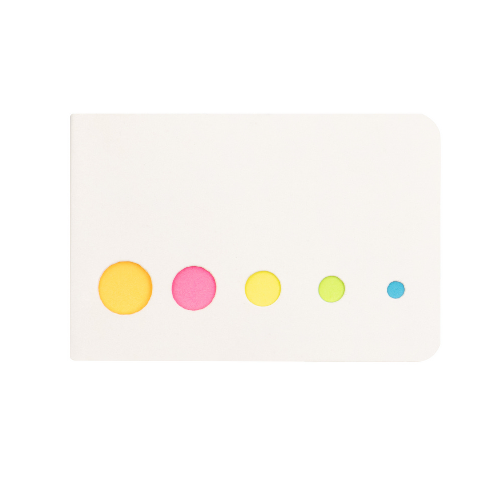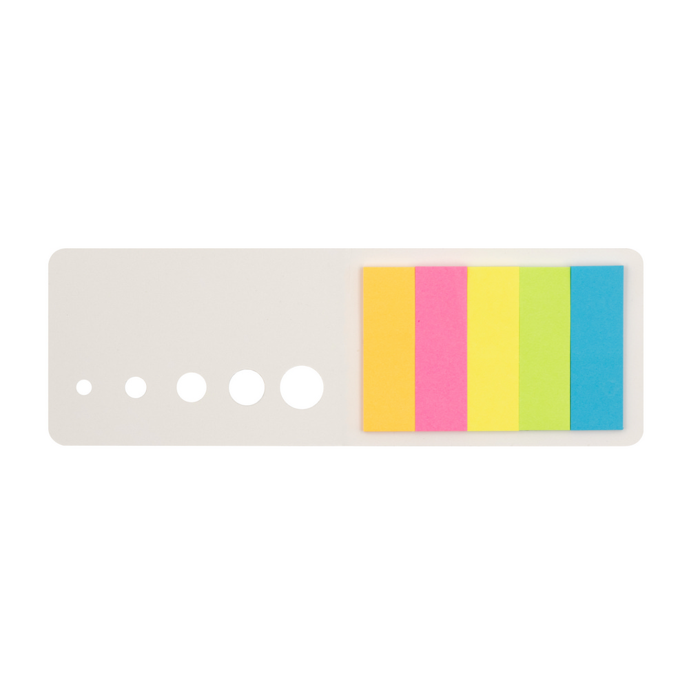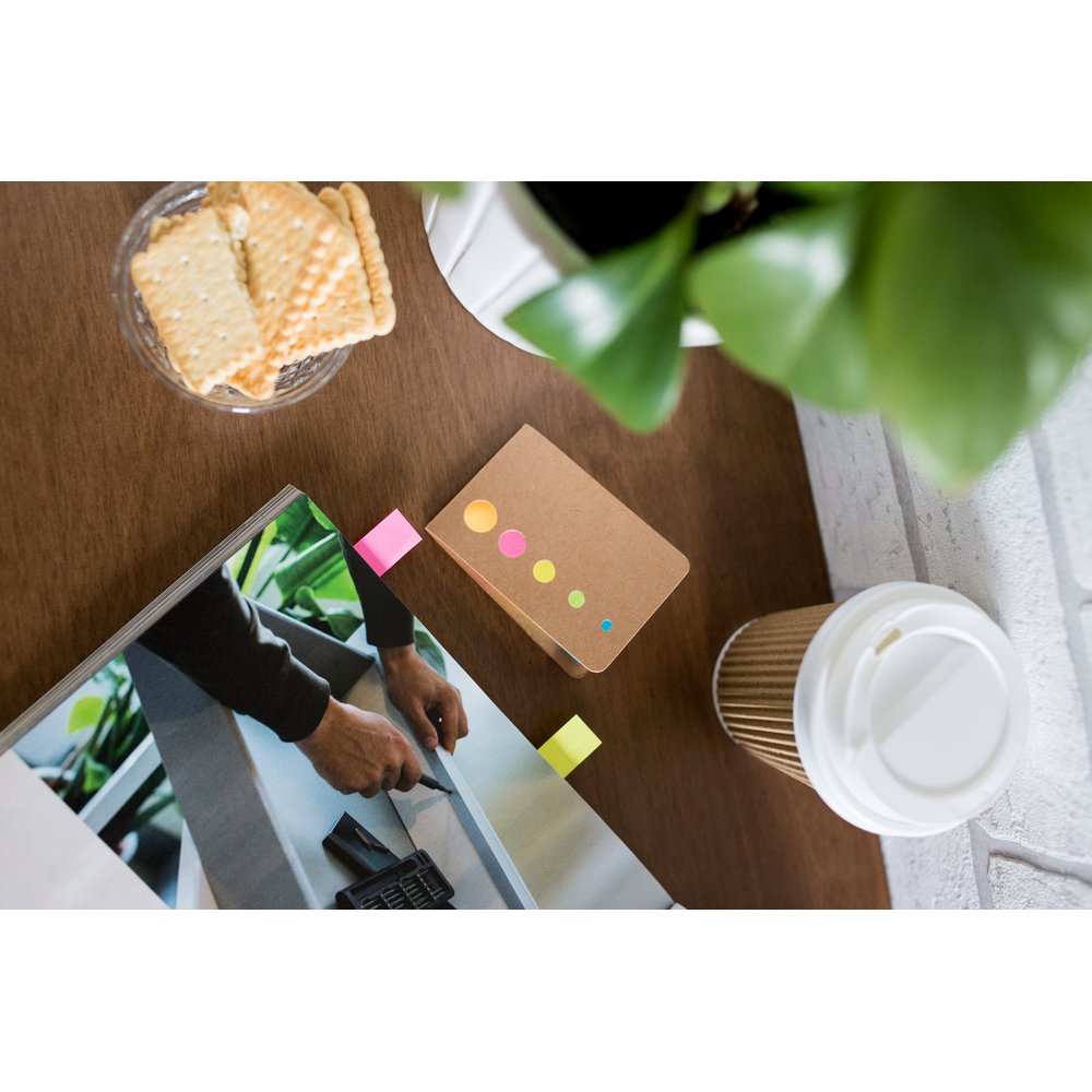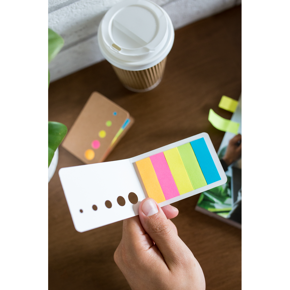 Zestaw karteczek samoprzylepnych, 5 kolorów po 20 szt. (kolory: pomarańczowy, różowy, żółty, zielony, niebieski), karteczki służą do naklejania na stronach książki, zeszytu albo notesu, produkt wykonany z kartonu i papieru
