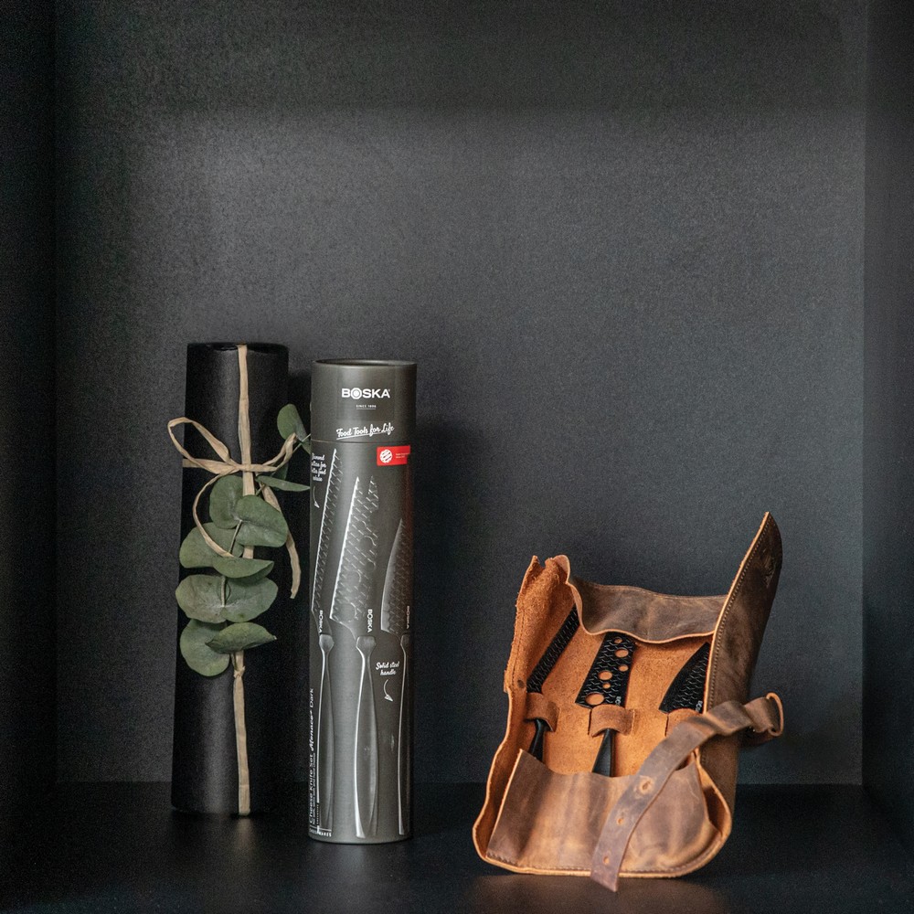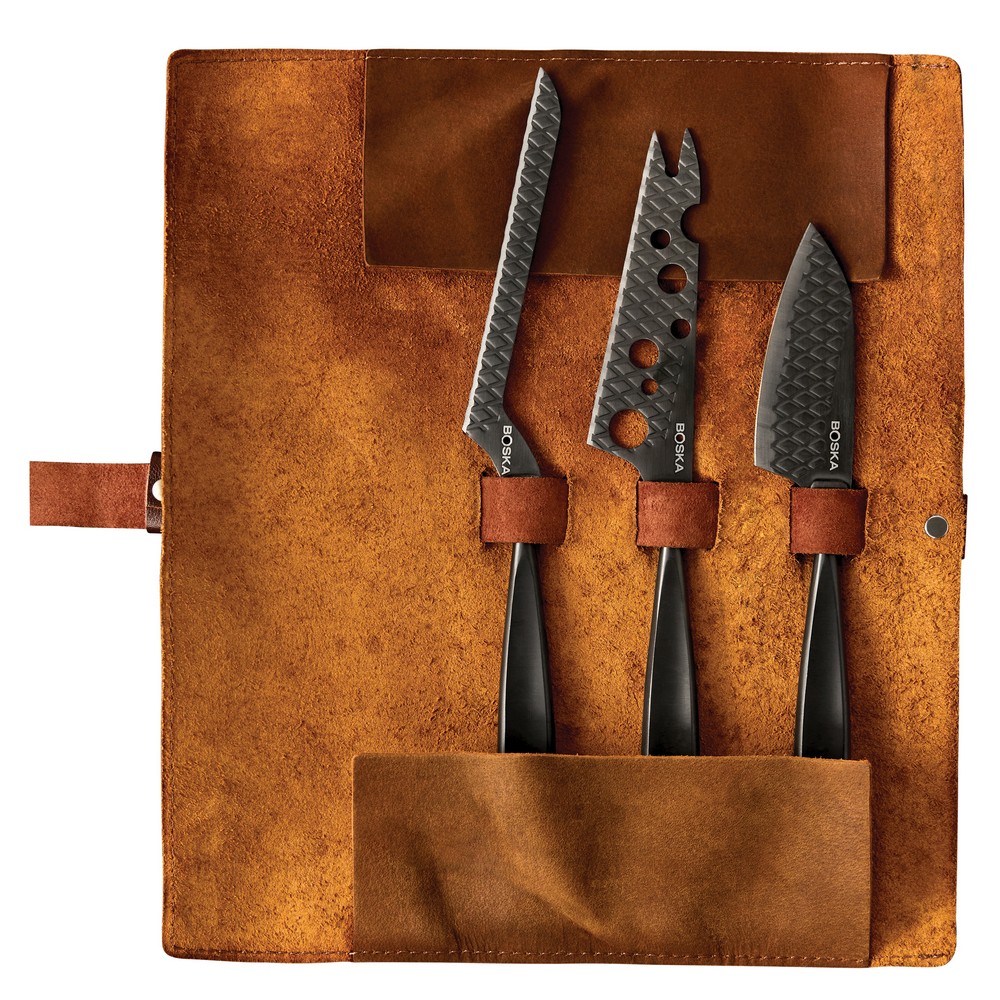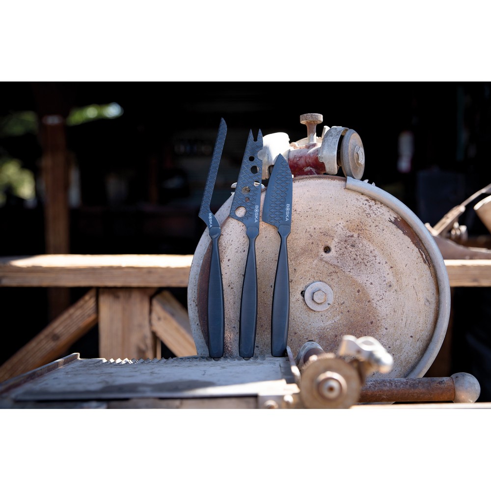 Zestaw do sera, wykonany ze stali nierdzewnej, unikatowy wzór w kształcie diamentów zapobiega przywieraniu sera, skórzane etui w komplecie, posiada 10-letnią gwarancję, wyłącznie mycie ręczne