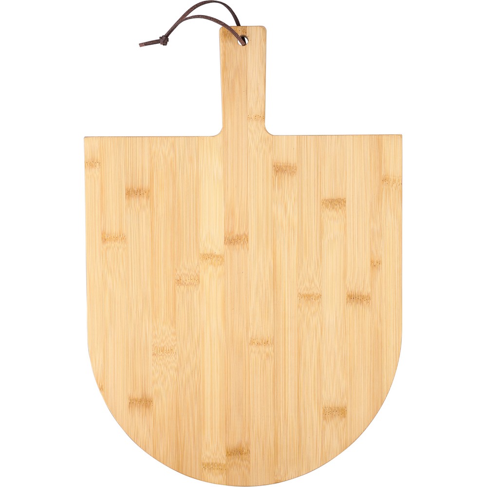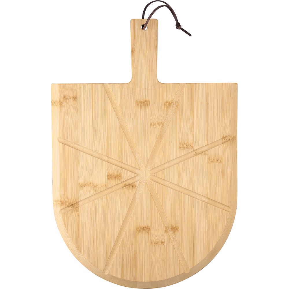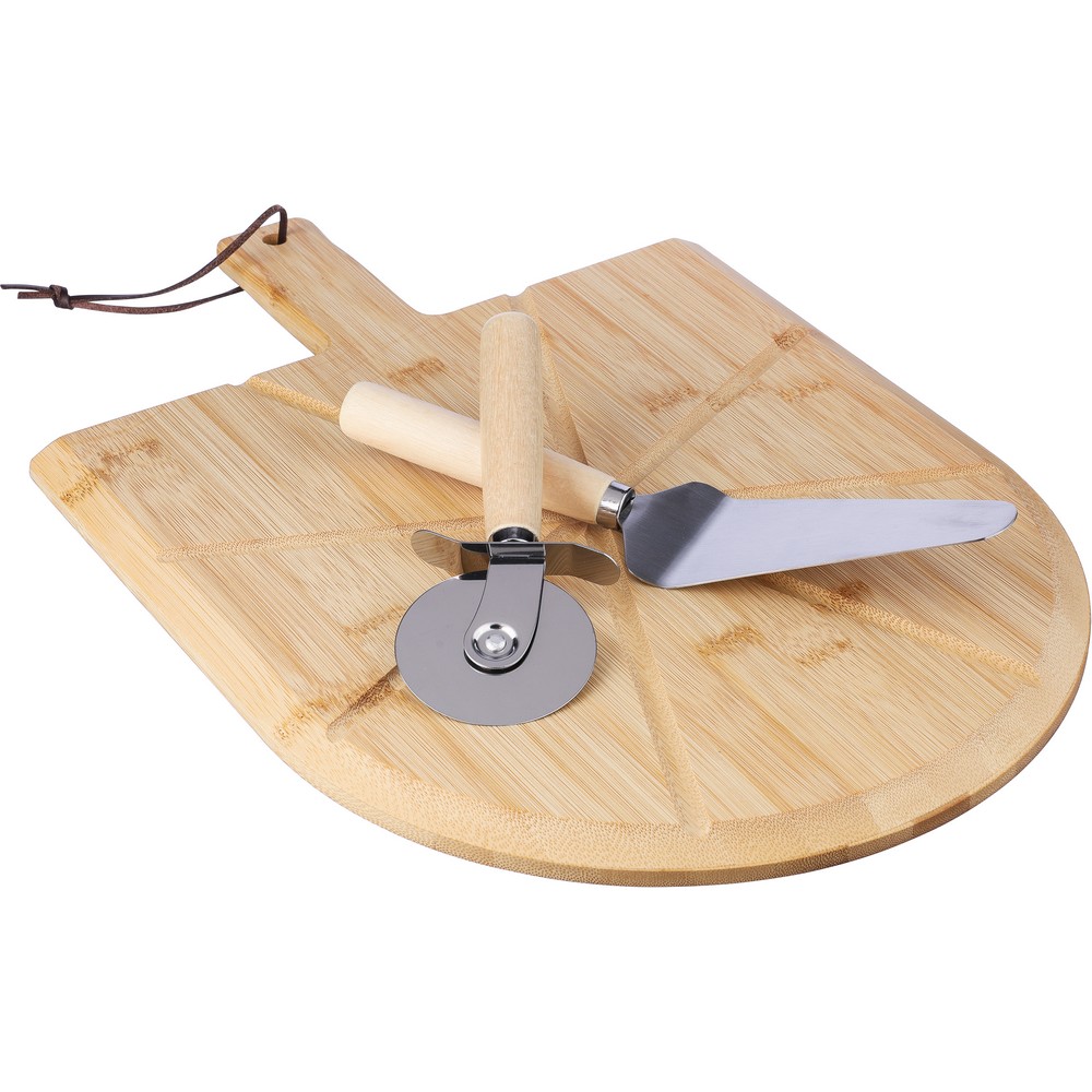 Zestaw do serwowania pizzy, deska do krojenia pizzy ze sznurkową zawieszką i wcięciami ułatwiającymi serwowanie, nóż do pizzy i łopatka w komplecie, zapakowany w brązowe kartonowe pudełko produkt wykonany z bambusa i metalu