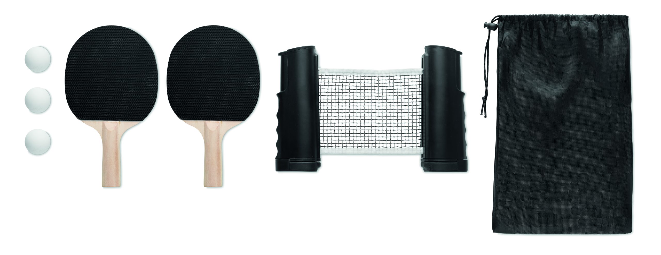 Zestaw do tenisa stołowego / ping ponga z rolowaną siatką. Zawiera 3 piłeczki, 2 paletki i 1 rozsuwaną siatkę, zapakowane w pokrowiec RPET.