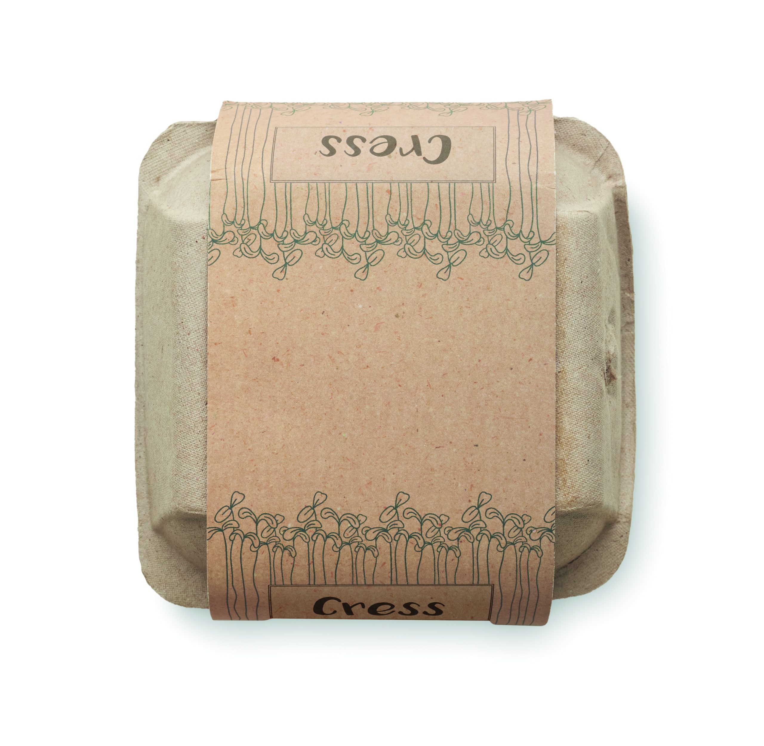 Zestaw 4 glinianych doniczek z terakoty, z nasionami rzeżuchy, w pudełku imitującym karton na jajka. Wyprodukowano w UE. Krążek torfowy w zestawie.