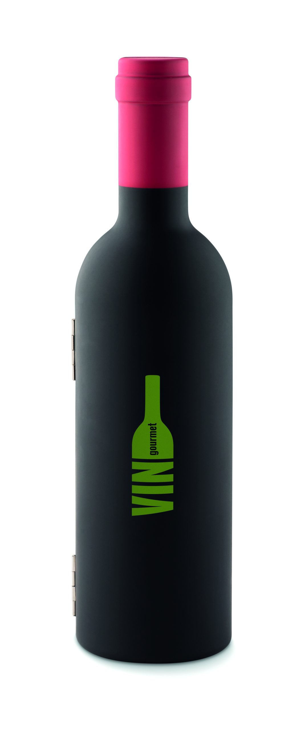 Zestaw do wina zapakowany w pudełko w kształcie butelki, składający się z korka do wina, korkociągu oraz okapnika. Magnetyczne zapięcie.