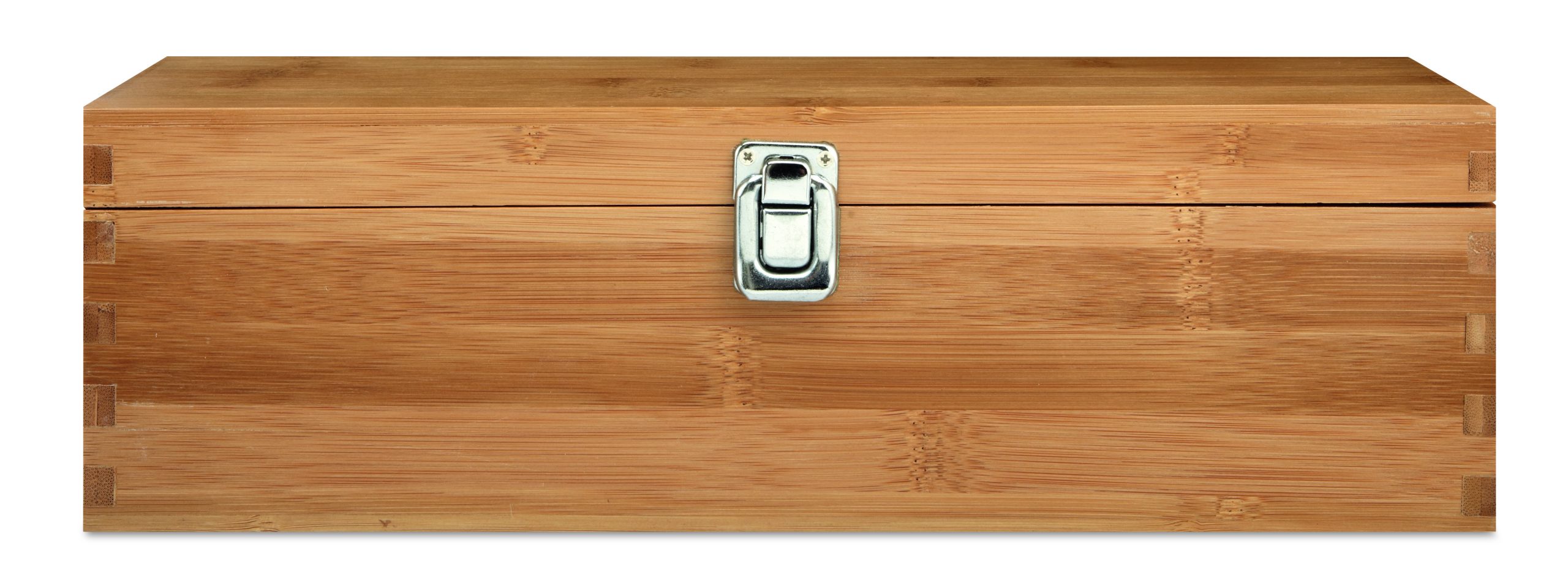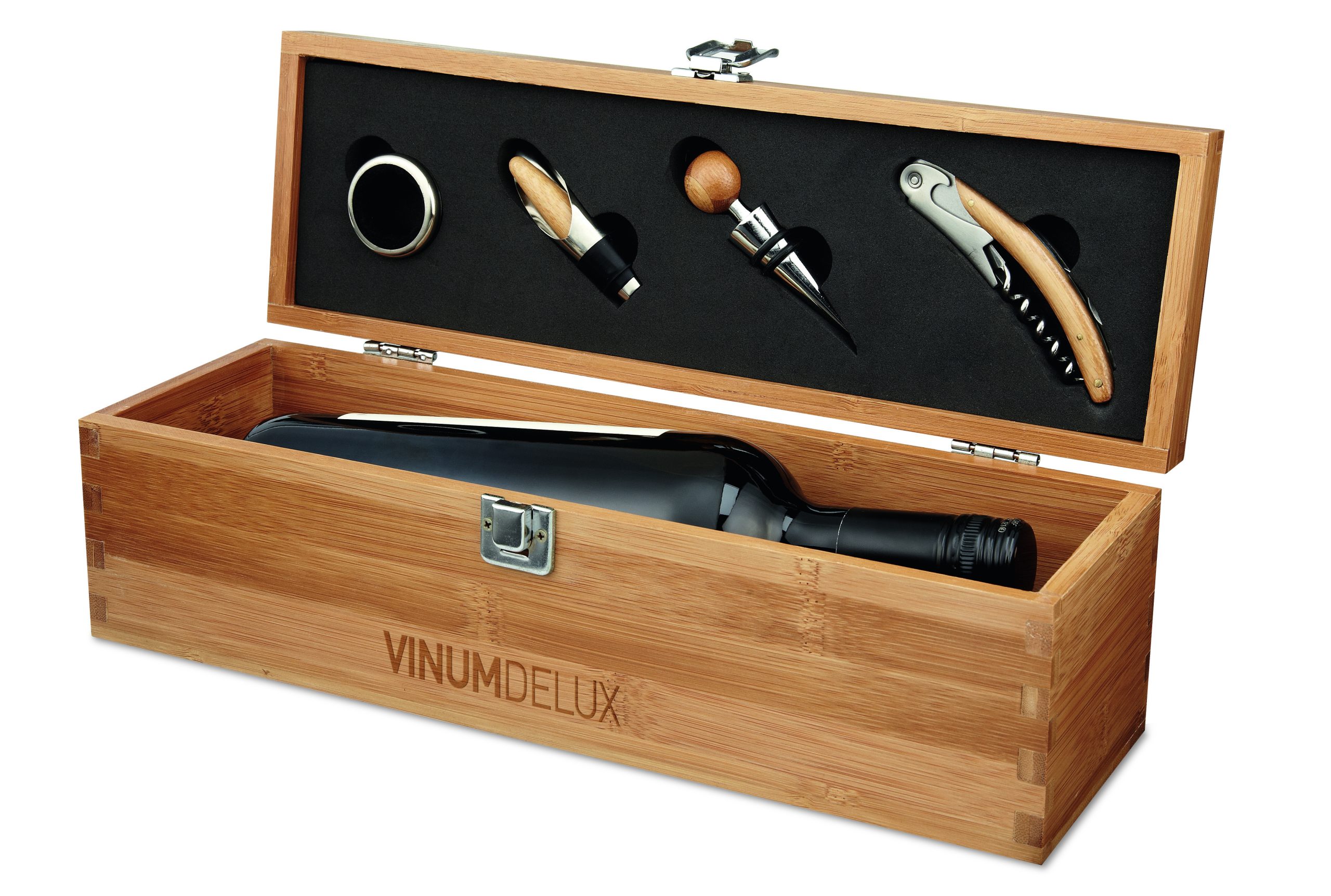 Zestaw do wina w bambusowym pudełku prezentowym z miejscem na jedną butelkę wina. Zawiera kołnierz, nalewak, korek i korkociąg. Butelka wina nie jest dołączona. Bambus jest produktem naturalnym, dlatego mogą wystąpić nieznaczne różnice w kolorze, wzorze i rozmiarze.
