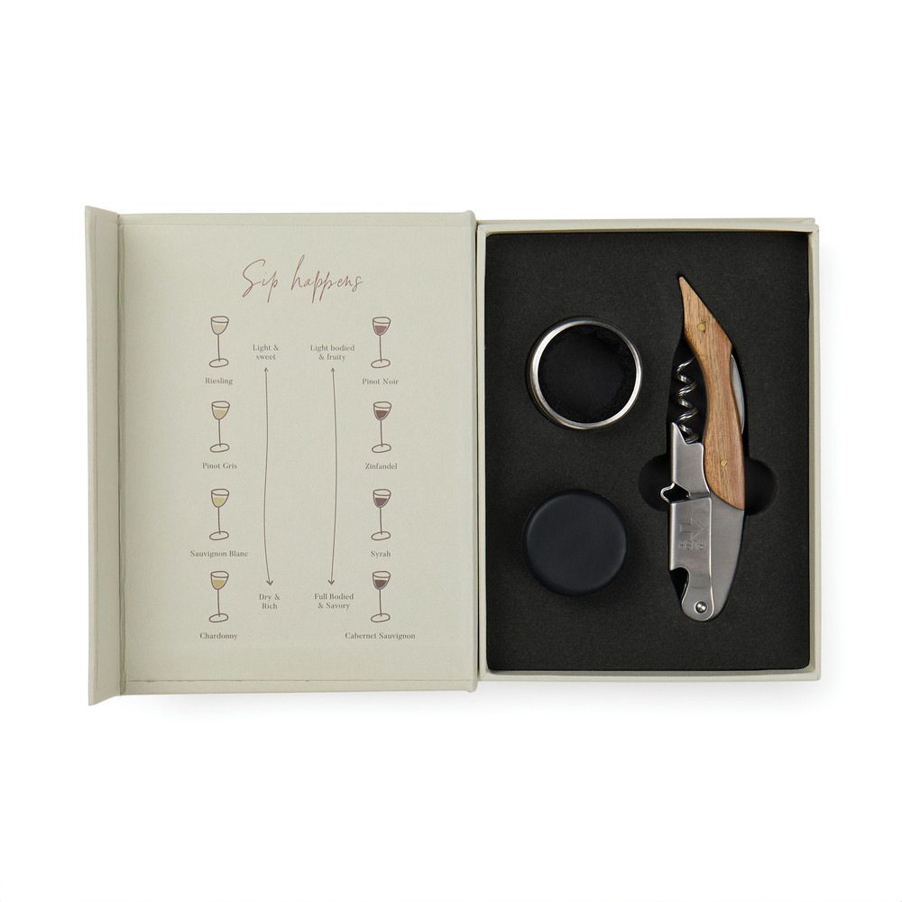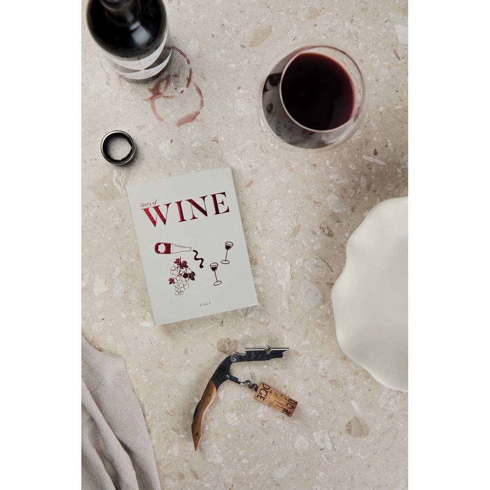 Zestaw do wina, w komplecie: korkociąg, silikonowy korek oraz nalewak, w pudełku przypominającym książkę z historią wina