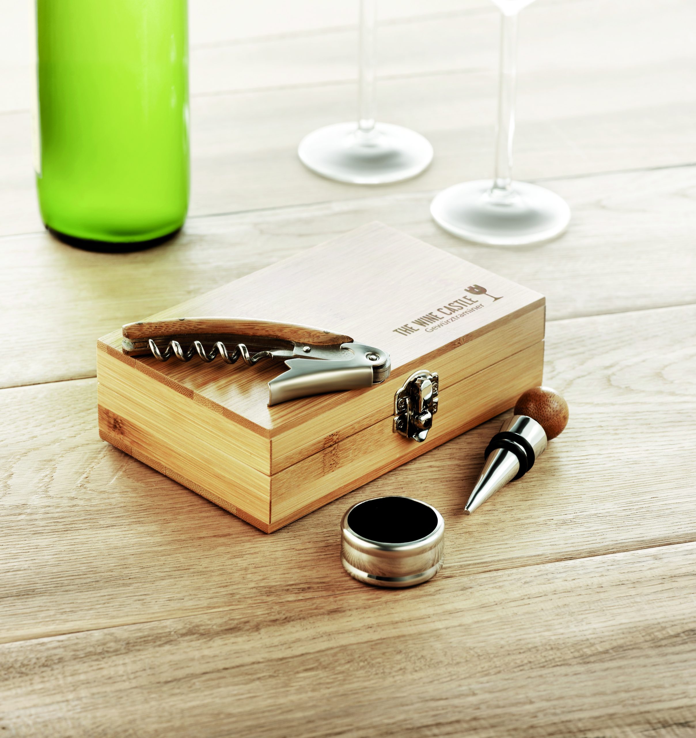 Zestaw do wina w bambusowym pudełku zawiera korkociąg, kołnierz do wina i korek ze stali nierdzewnej i bambusa. Bambus jest produktem naturalnym, dlatego mogą wystąpić nieznaczne różnice w kolorze, wzorze i rozmiarze.