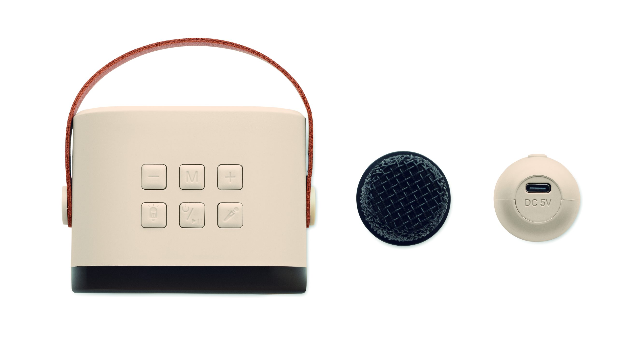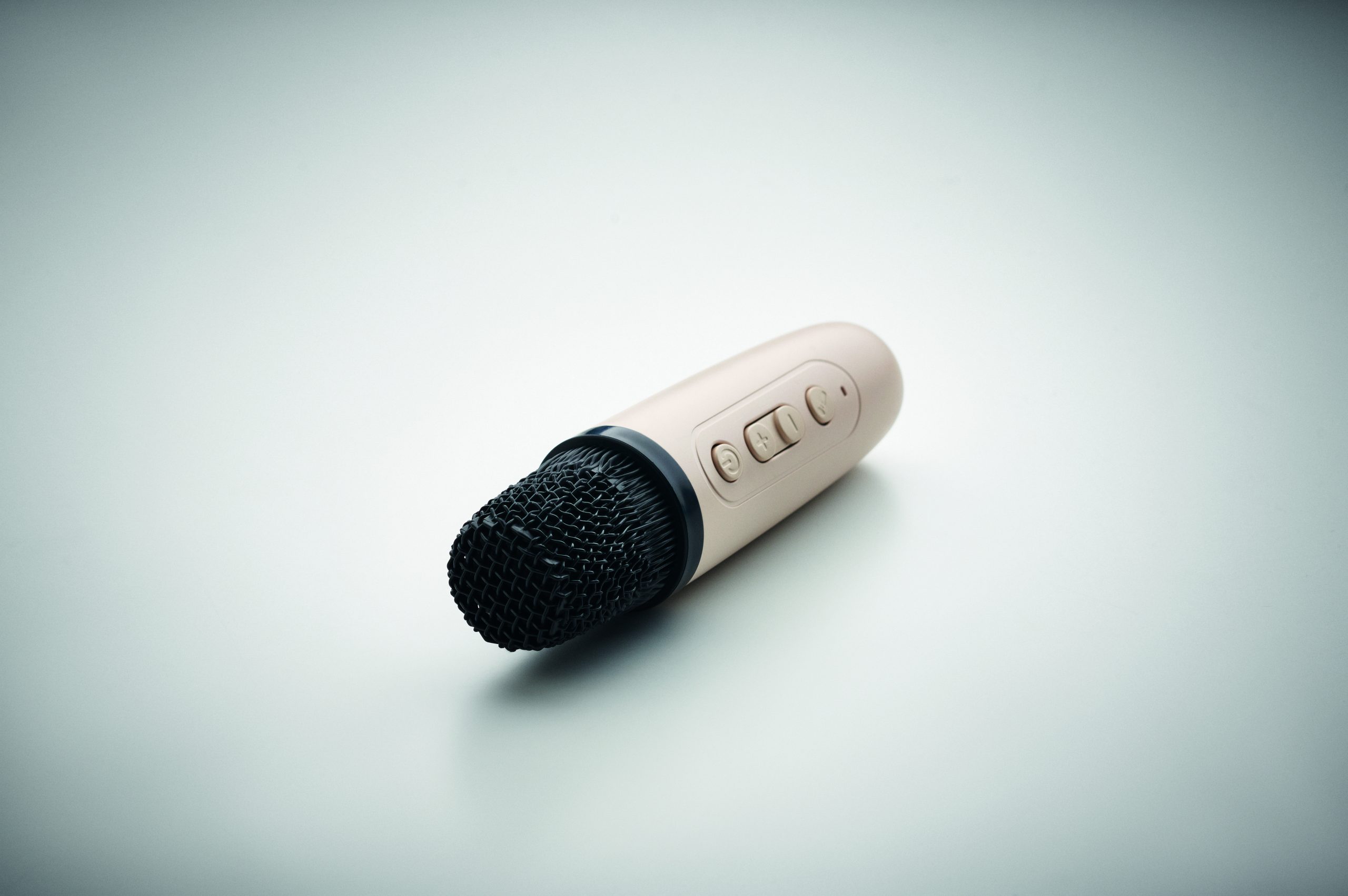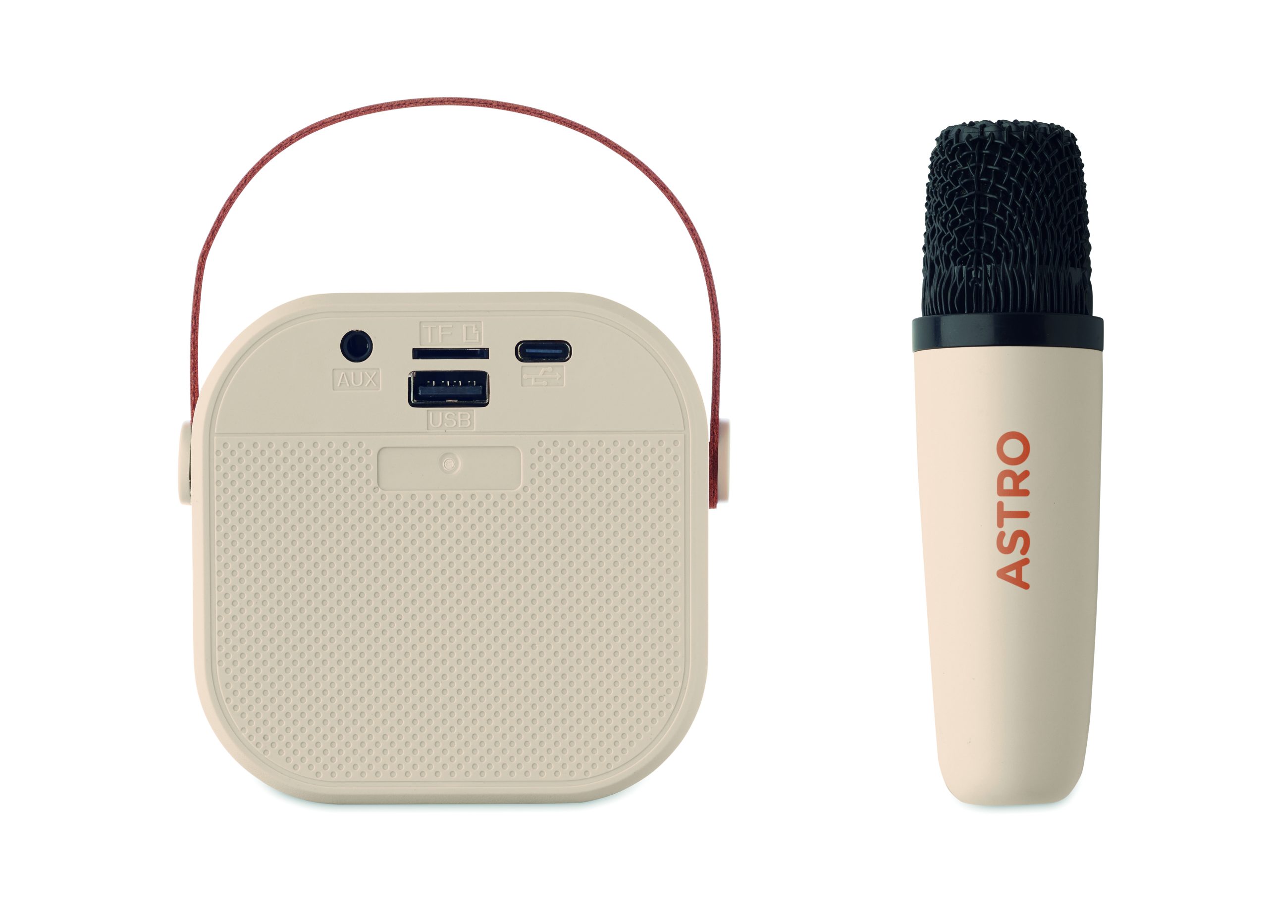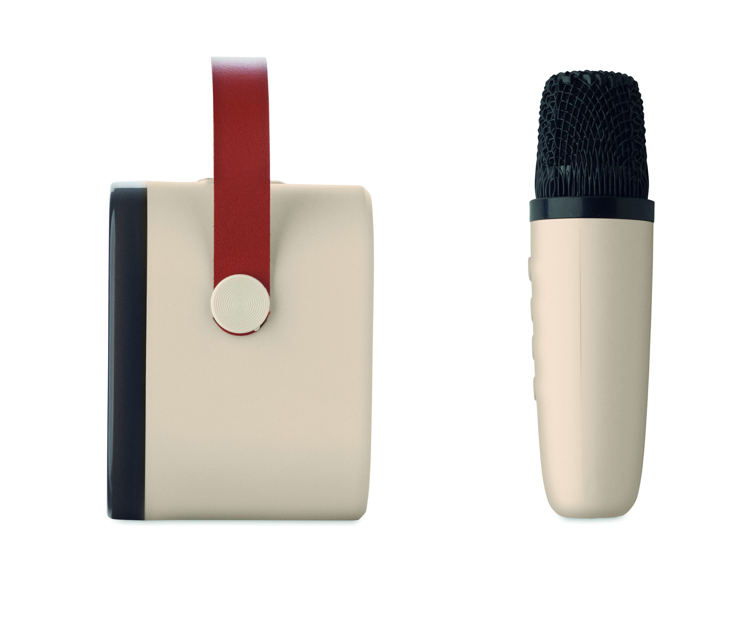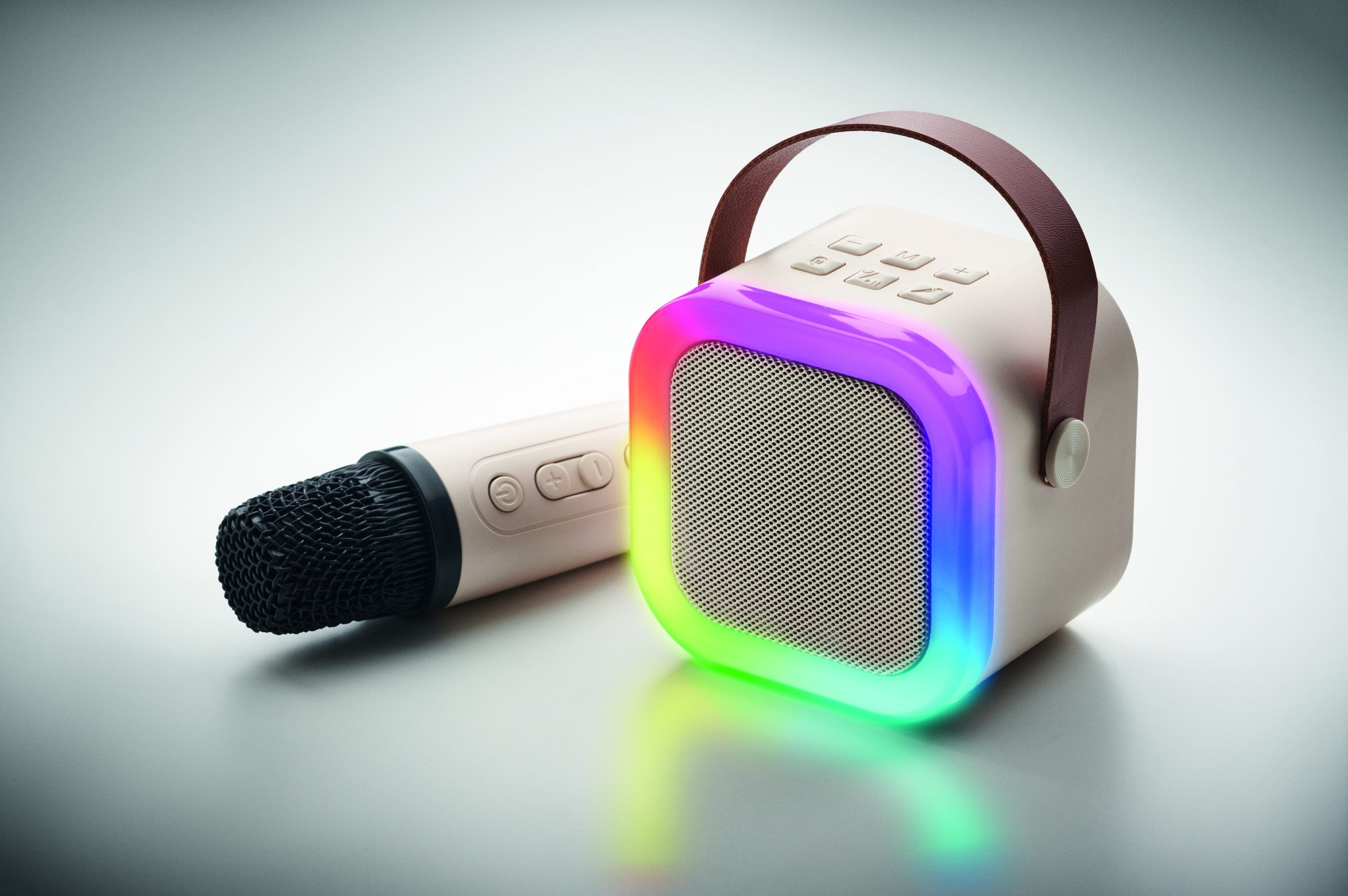 Zestaw karaoke zawierający bezprzewodowy głośnik 5 W z diodami LED zmieniającymi kolory, wykonany z tworzywa ABS z uchwytem z PU i mikrofonem. Wbudowany głośnik z akumulatorem 800 mAh i mikrofon z akumulatorem 400 mAh.