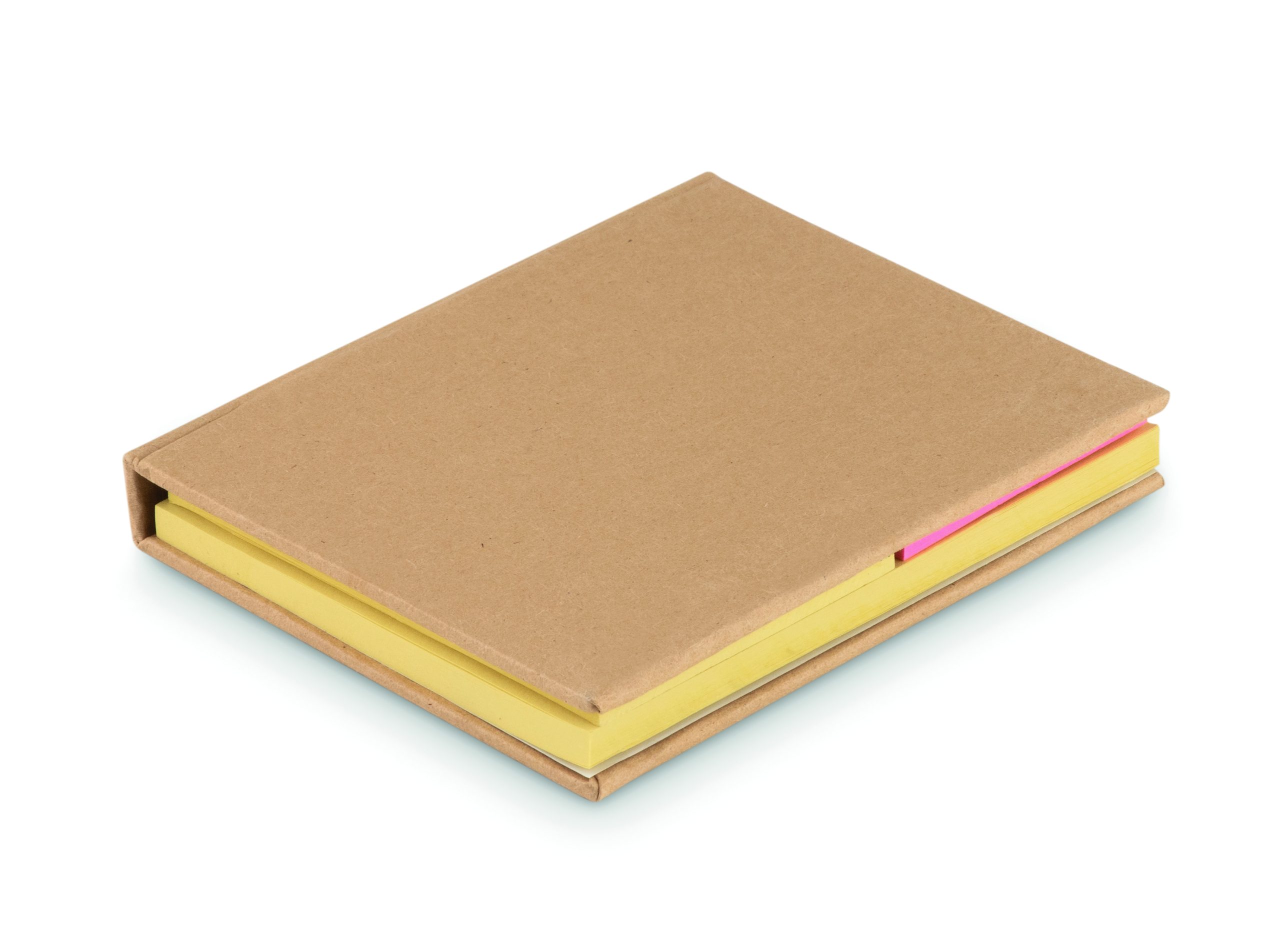 3-częściowy notatnik z karteczkami samoprzylepnymi w okładce z kartonu pochodzącego z recyklingu. Duże i średnie żółte karteczki samoprzylepne oraz 5 znaczników w różnych kolorach.