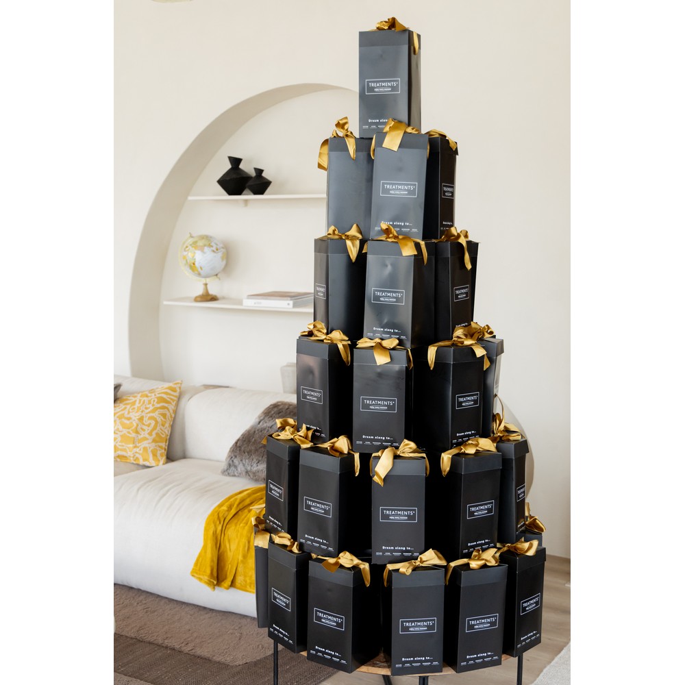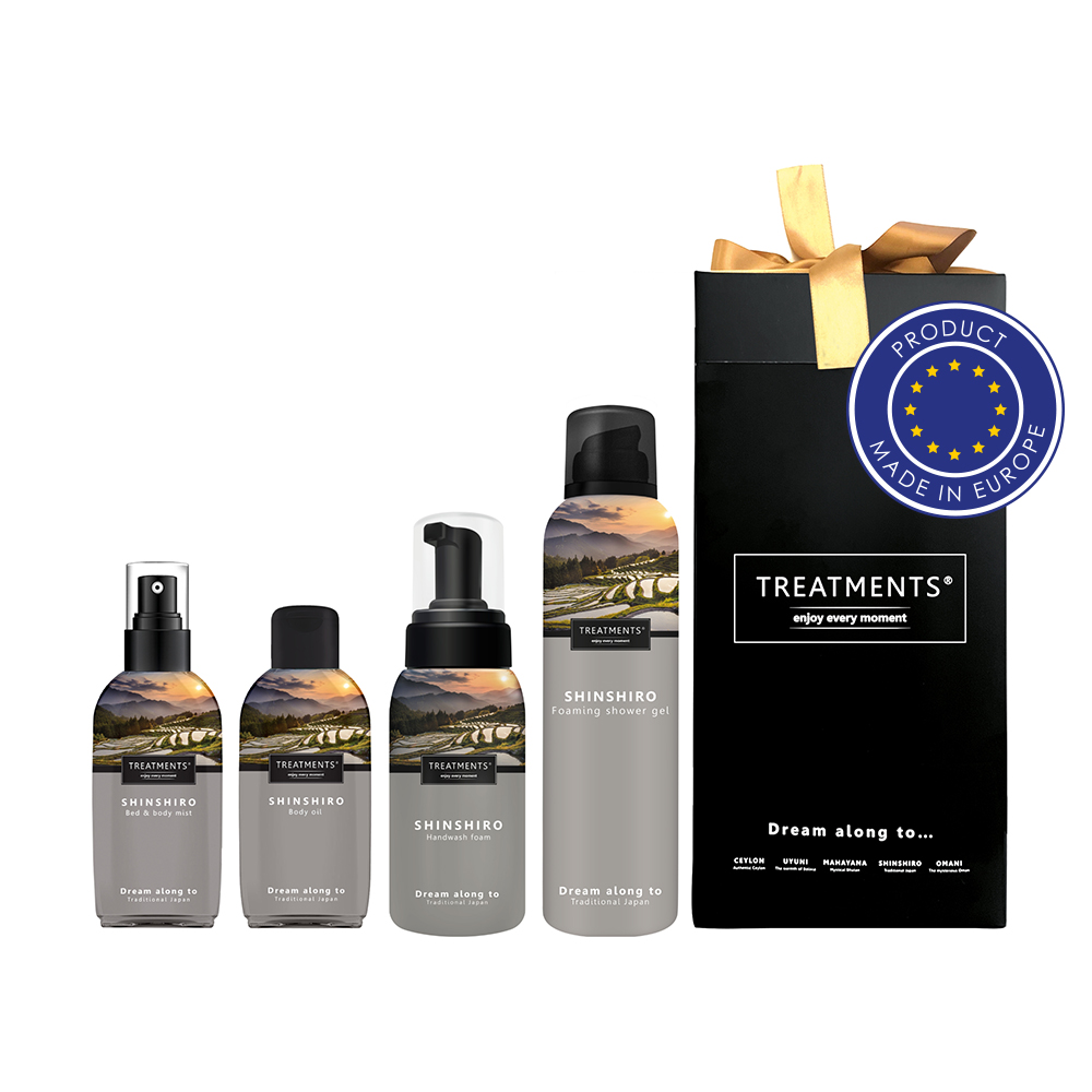 Zestaw kosmetyków Medium TREATMENTS, przeznaczony dla kobiet i mężczyzn, w zestawie znajduje się: mgiełka do ciała i pościeli 50 ml, olejek do ciała 50 ml, pieniący się żel pod prysznic 200ml, pianka do mycia rąk 250 ml, elegancki, papierowy kartonik, w którym zapakowane są kosmetyki, sprawdzą się w codziennej pielęgnacji, dostępne są różne warianty zapachowe: 03 – Ceylon, 06 – Mahayana, 11 – Uyuni, 19 – Shinshiro. Znakowanie produktu jest możliwe tylko na srebrnej lub złotej folii z czarnym nadrukiem albo na czarnej apli ze srebrnym lub złotym nadrukiem.