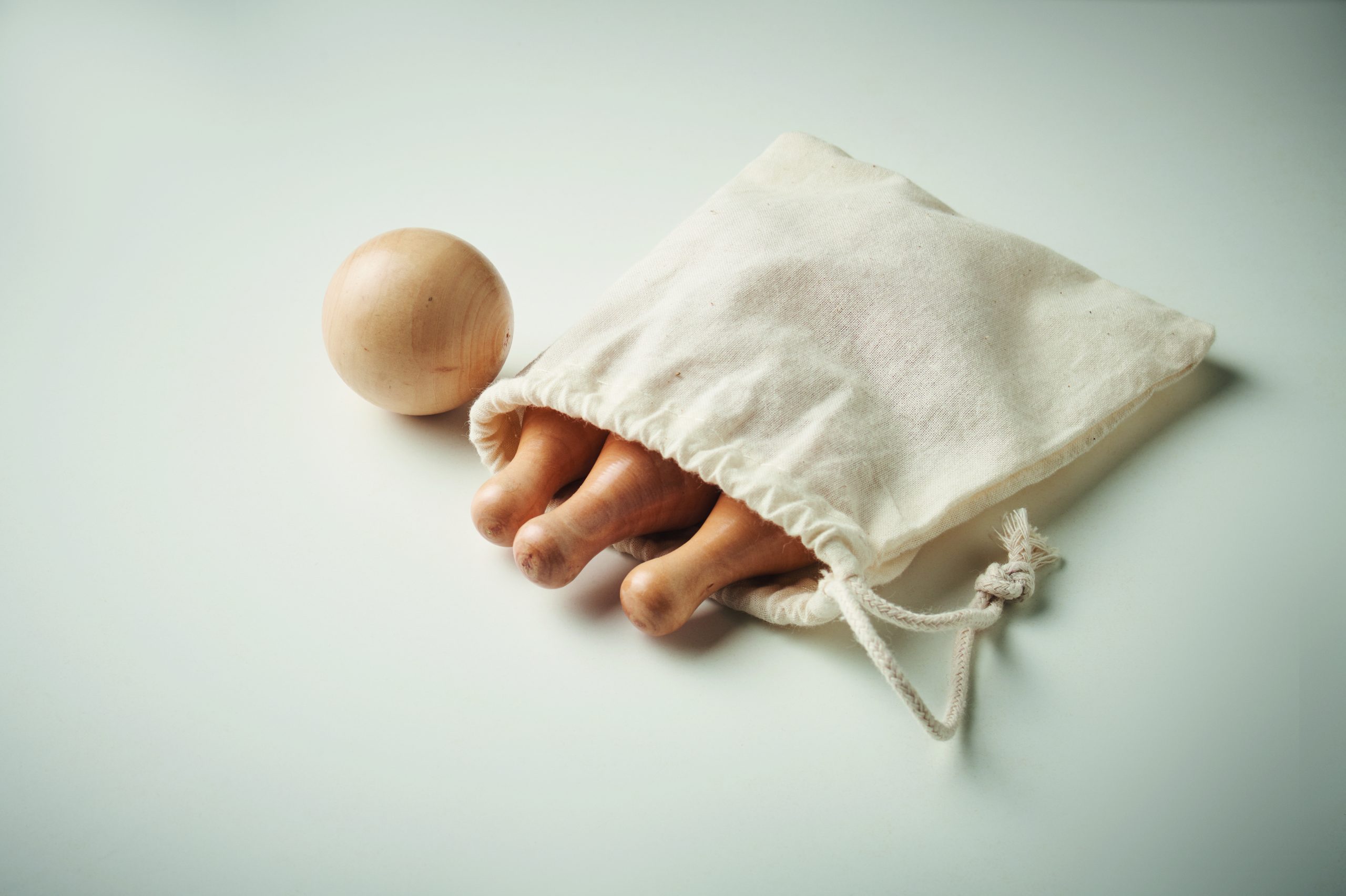 Mini zestaw do gry w kręgle wykonany z drewna sosnowego, zapakowany w bawełniany woreczek ze sznurkiem. Zawiera 6 kręgli i 1 kulę. FSC®-certified | FSC 100%, W15.2, FSC-C213206