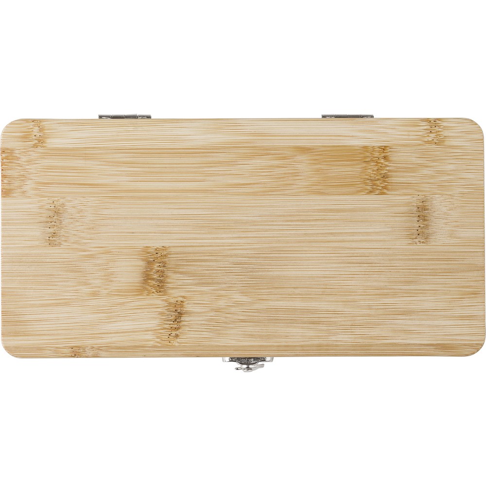 Zestaw narzędzi ze stali węglowej, 20 el., w zestawie: 3 śrubokręty, 10 bitów z uchwytami, adapter, 4 klucze nasadowe, nóż, uchwyt, złącze, w bambusowym pudełku zamykanym na klip