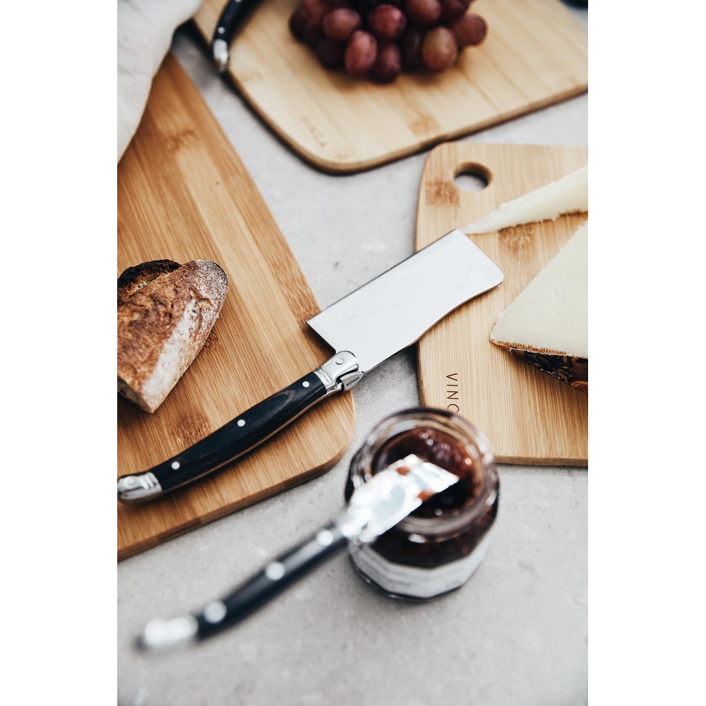 Zestaw noży do sera 3 szt., nóż i tasak do sera, nóż do masła, wykonane ze stali nierdzewnej, uchwyty z drewna pakka, w pudełku upominkowym