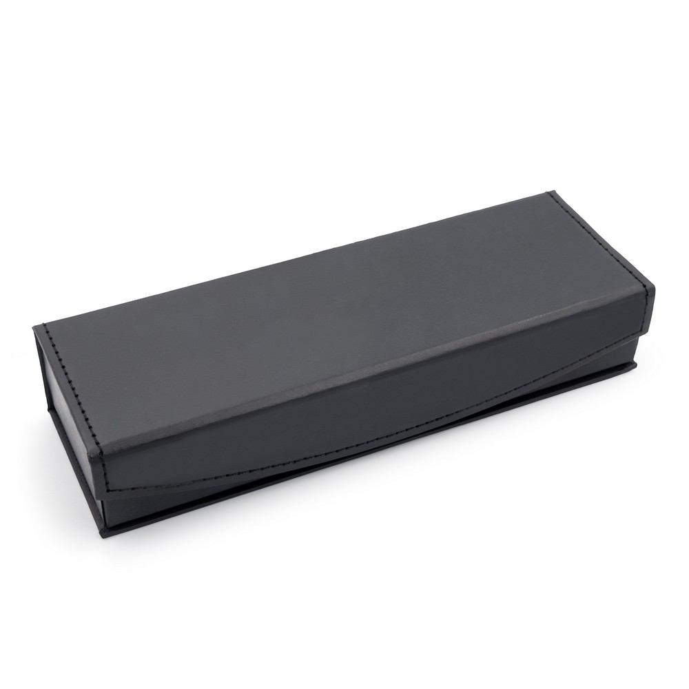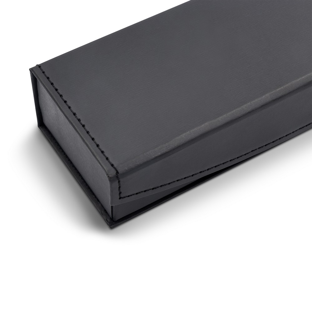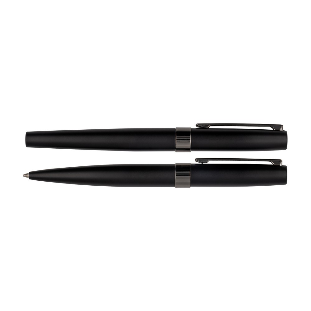 Zestaw piśmienniczy Mauro Conti, długopis oraz pióro kulkowe z czarnym trzonem i błyszczącymi elementami, długopis z mechanizmem obrotowym, piórko kulkowe ze skuwką, wkład długopisu w niebieskim kolorze, wkład pióra kulkowego w czarnym kolorze, czarne pudełko podarunkowe w komplecie, produkt wykonany z metalu