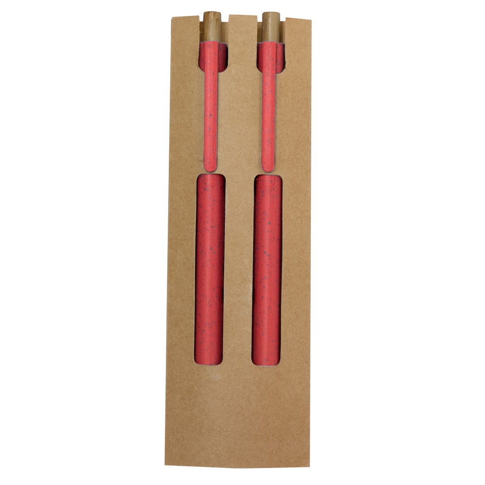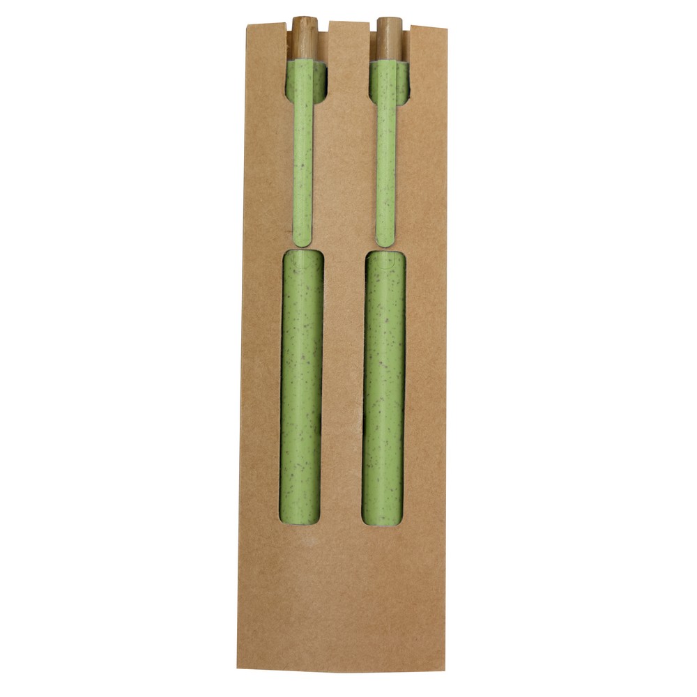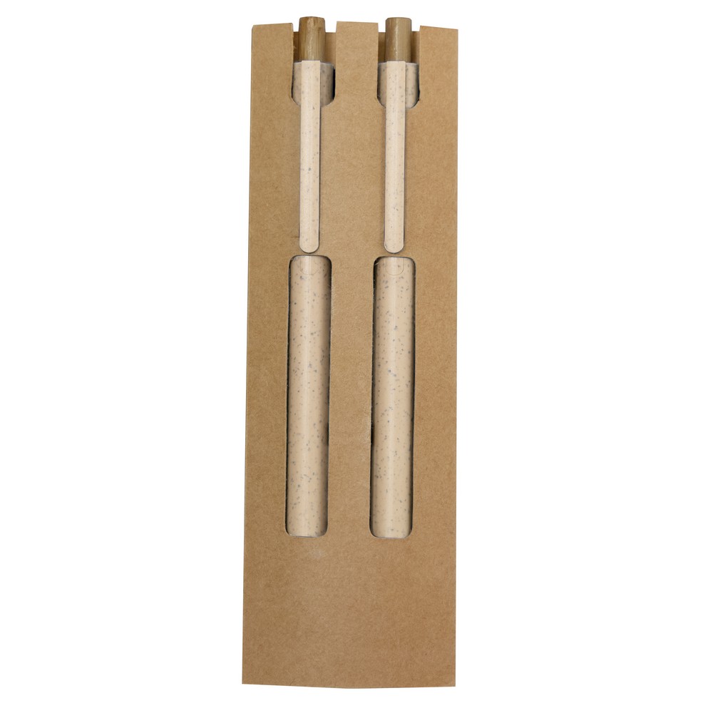 Zestaw piśmienniczy w etui z kartonu z recyklingu, długopis i „wieczny” ołówek ze specjalną wolnościerającą się końcówką, wkład długopisu w niebieskim kolorze, posiadają bambusowe przyciski, produkt wykonany ze słomy pszenicznej, ABS i bambusa