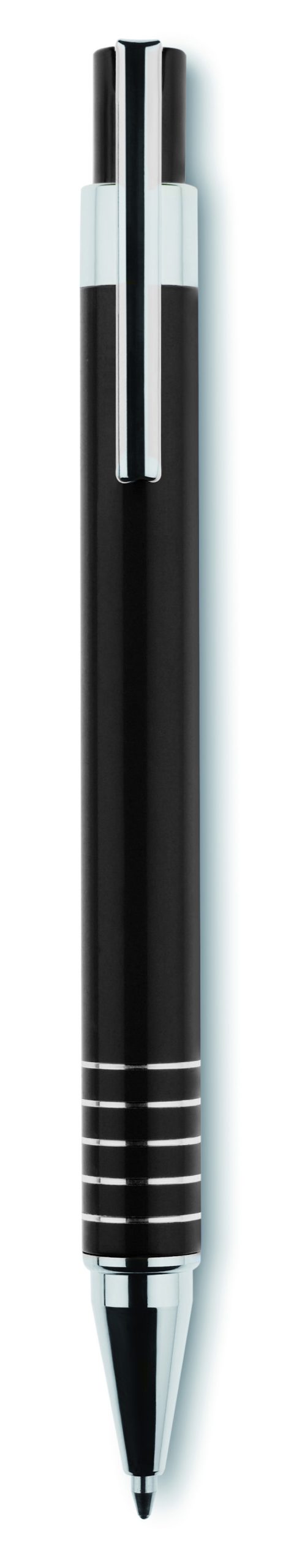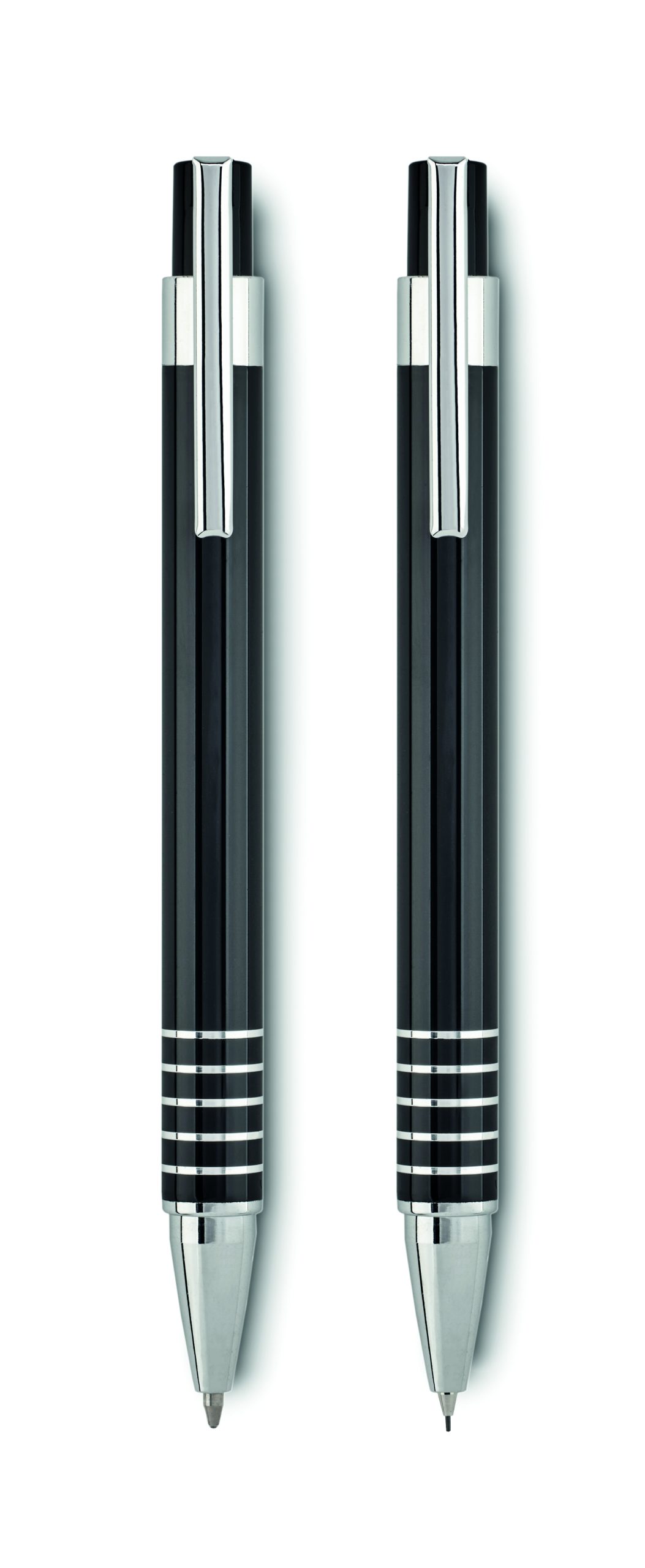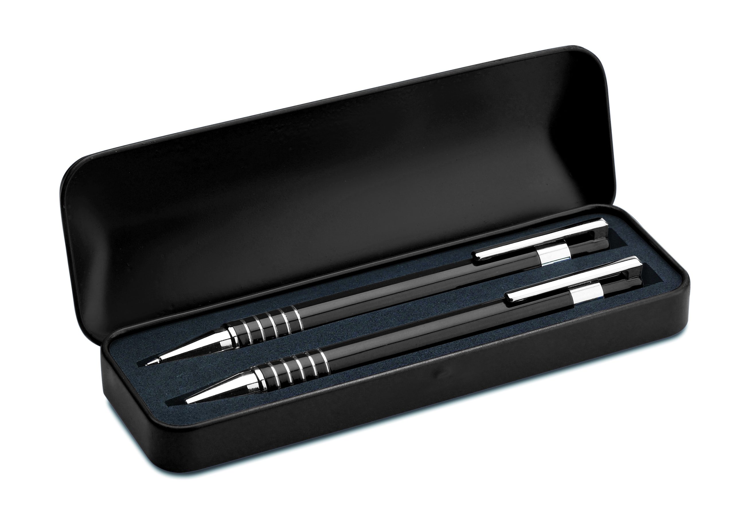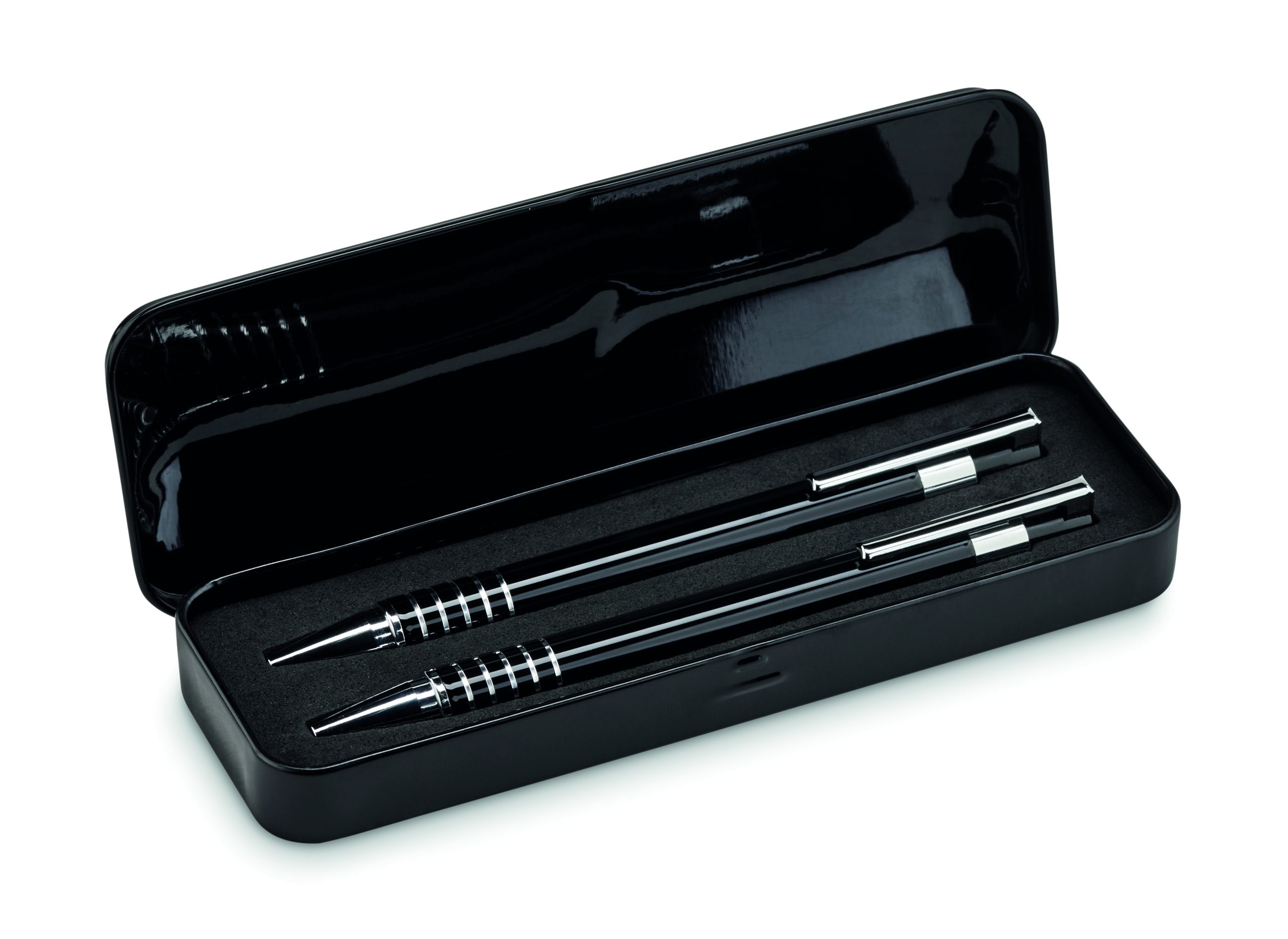 Aluminiowy zestaw do pisania: przyciskany długopis z niebieskim wkładem i mechaniczny ołówek, w dobranym kolorystycznie metalowym pudełku.