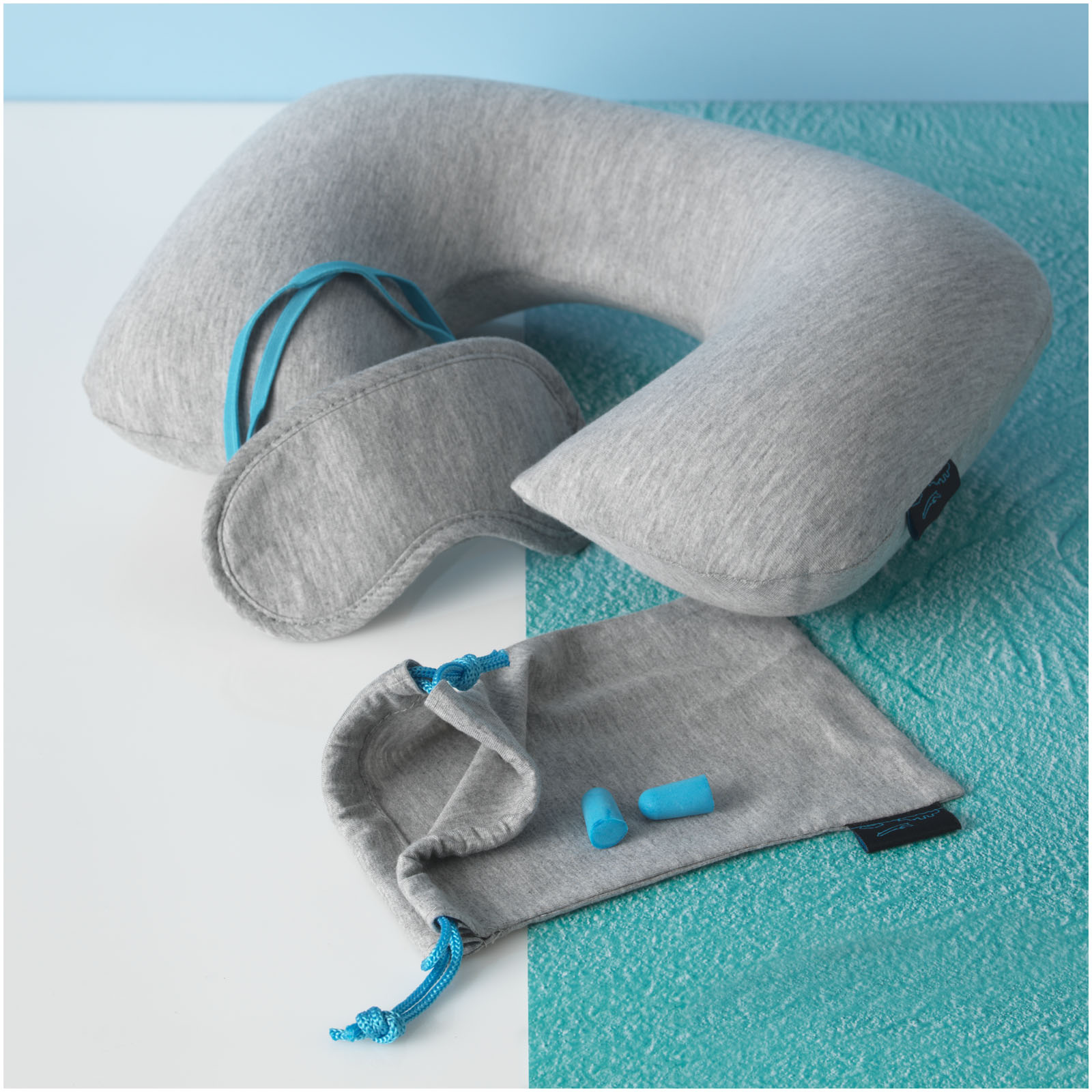Miękki i delikatny zestaw podróżny zawiera dmuchaną poduszkę z jasnoniebieskim zamkiem, maskę na twarz z jasnoniebieską gumką oraz jasnoniebieskie zatyczki do uszu. Zestaw jest spakowany w miękki pokrowiec zamykany jasnoniebieskim sznurkiem.