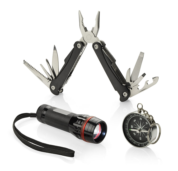 latarka 34 x 105 mm, multitool 105 x 45 x 23 mm, kompas⌀ 44 x 10 mm