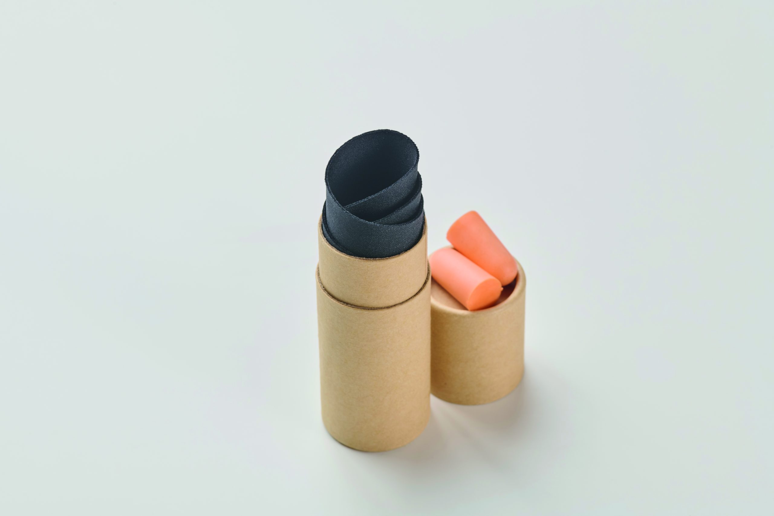 Zestaw podróżny zawierający elastyczną poliestrową maskę na oczy i zatyczki do uszu EVA. Zapakowane w papierowe pudełko.