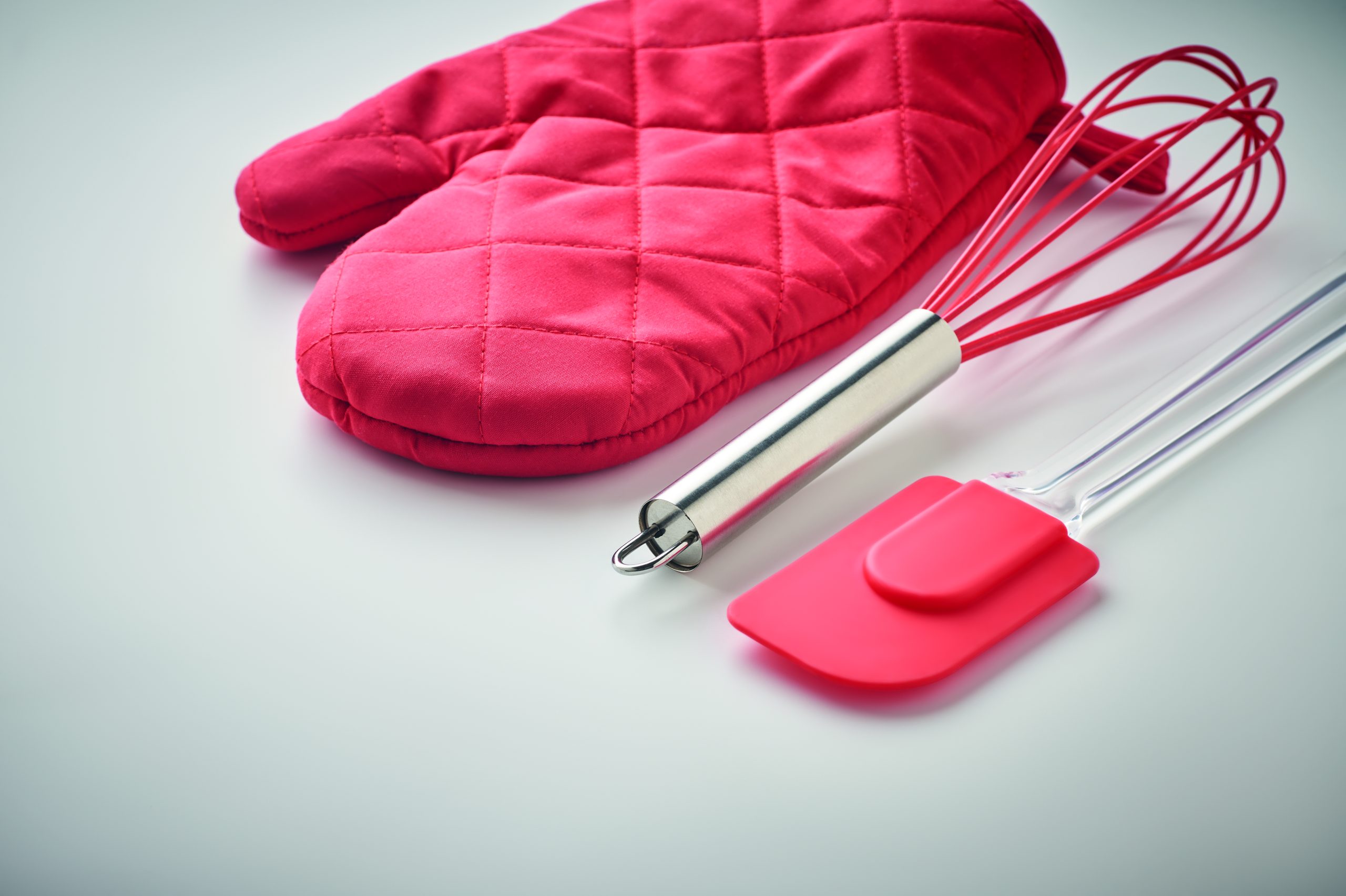 Zestaw przyborów do pieczenia. Zawiera polibawełnianą (95% poliestru i 5% bawełny) rękawicę kuchenną, trzepaczkę i silikonową szpatułkę.
