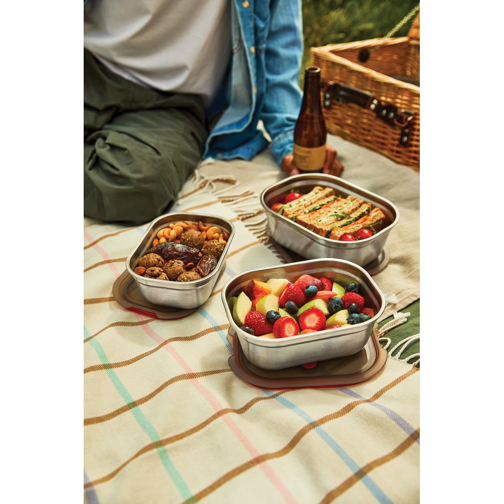 Zestaw pudełek śniadaniowych, w komplecie 3 pudełka w różnych rozmiarach (małe, średnie i duże), szczelne zamknięcia z blokadą, można myć w zmywarce i używać w piekarniku