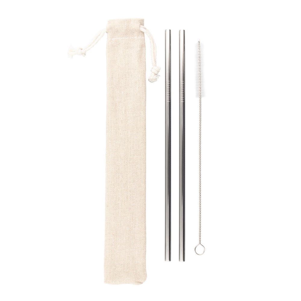 Zestaw 2 słomek wielokrotnego użytku, czyścik i bawełniany woreczek w komplecie, produkt wykonany ze stali nierdzewnej i bawełny