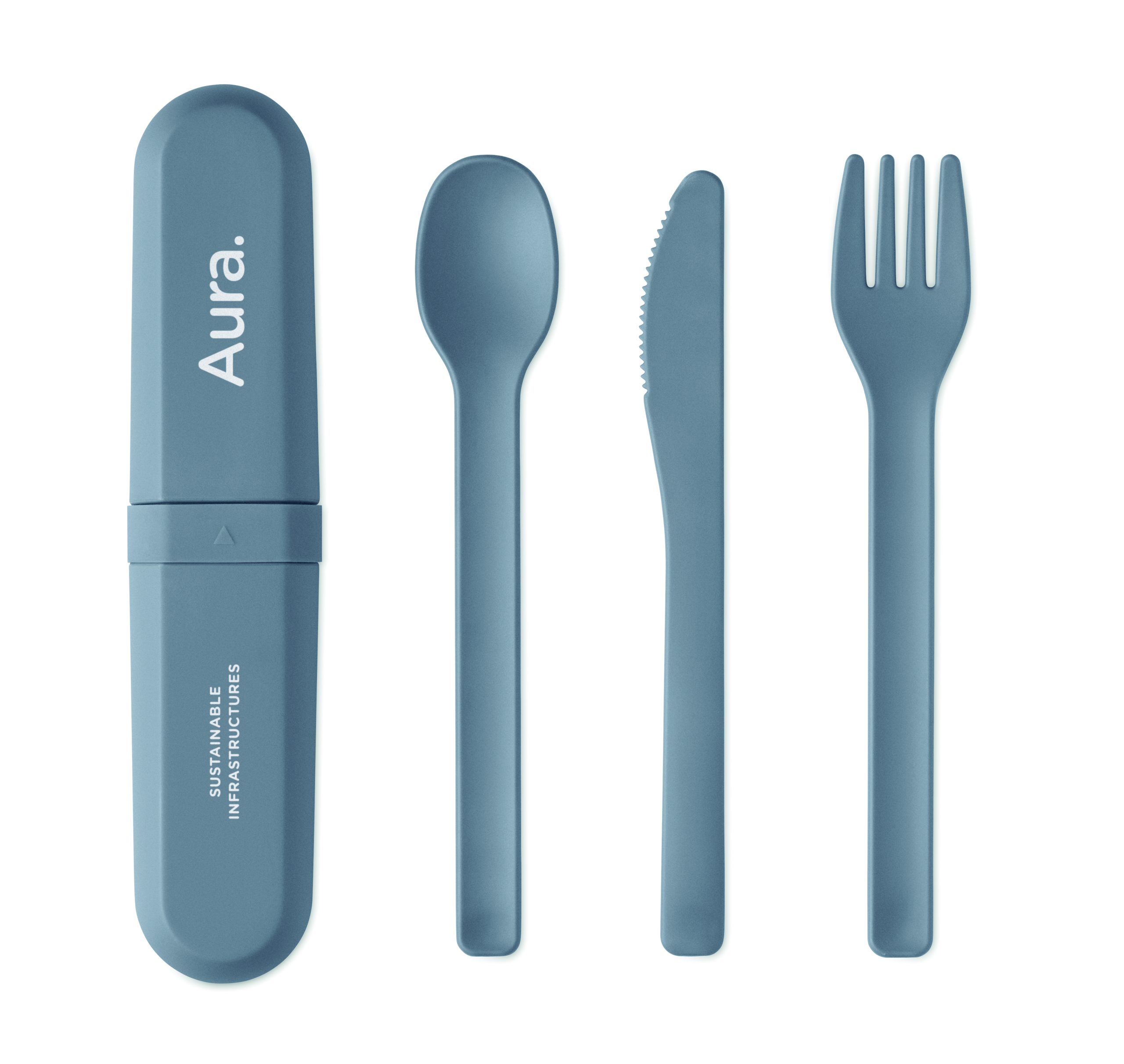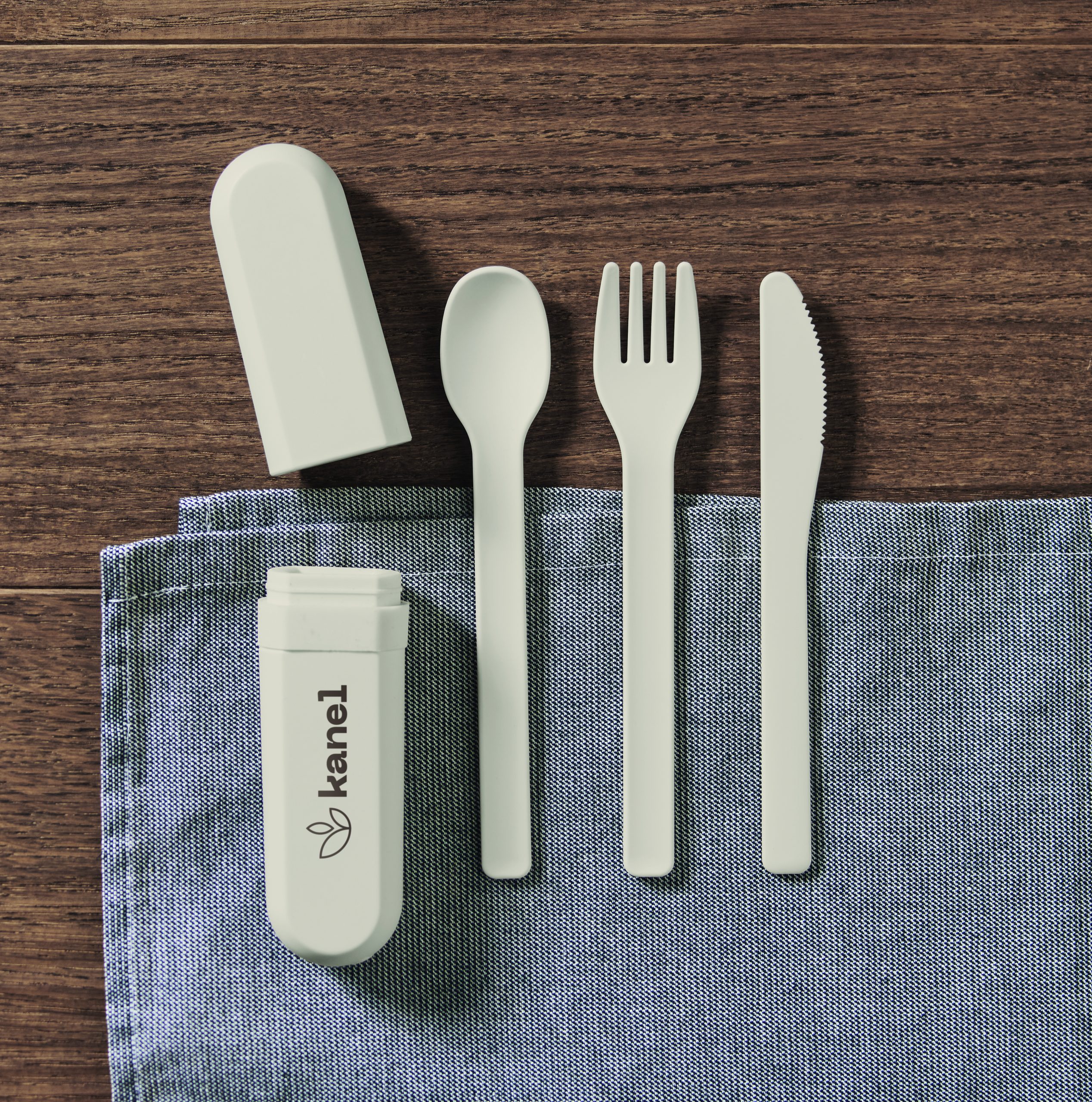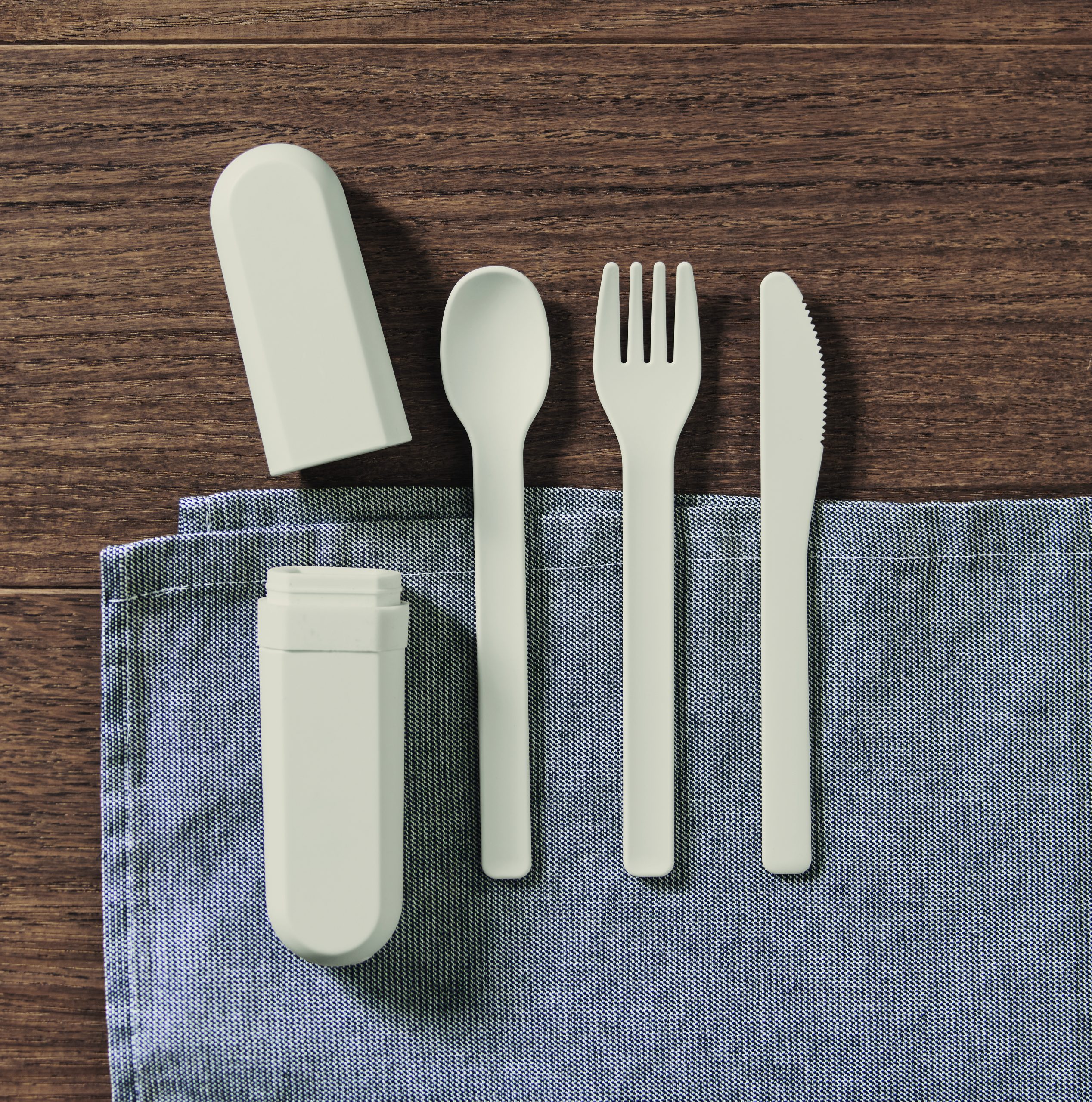 Zestaw sztućców wielokrotnego użytku z etui z kukurydzy PLA. Każdy zestaw zawiera widelec, nóż, łyżkę i praktyczne, przenośne etui na sztućce.