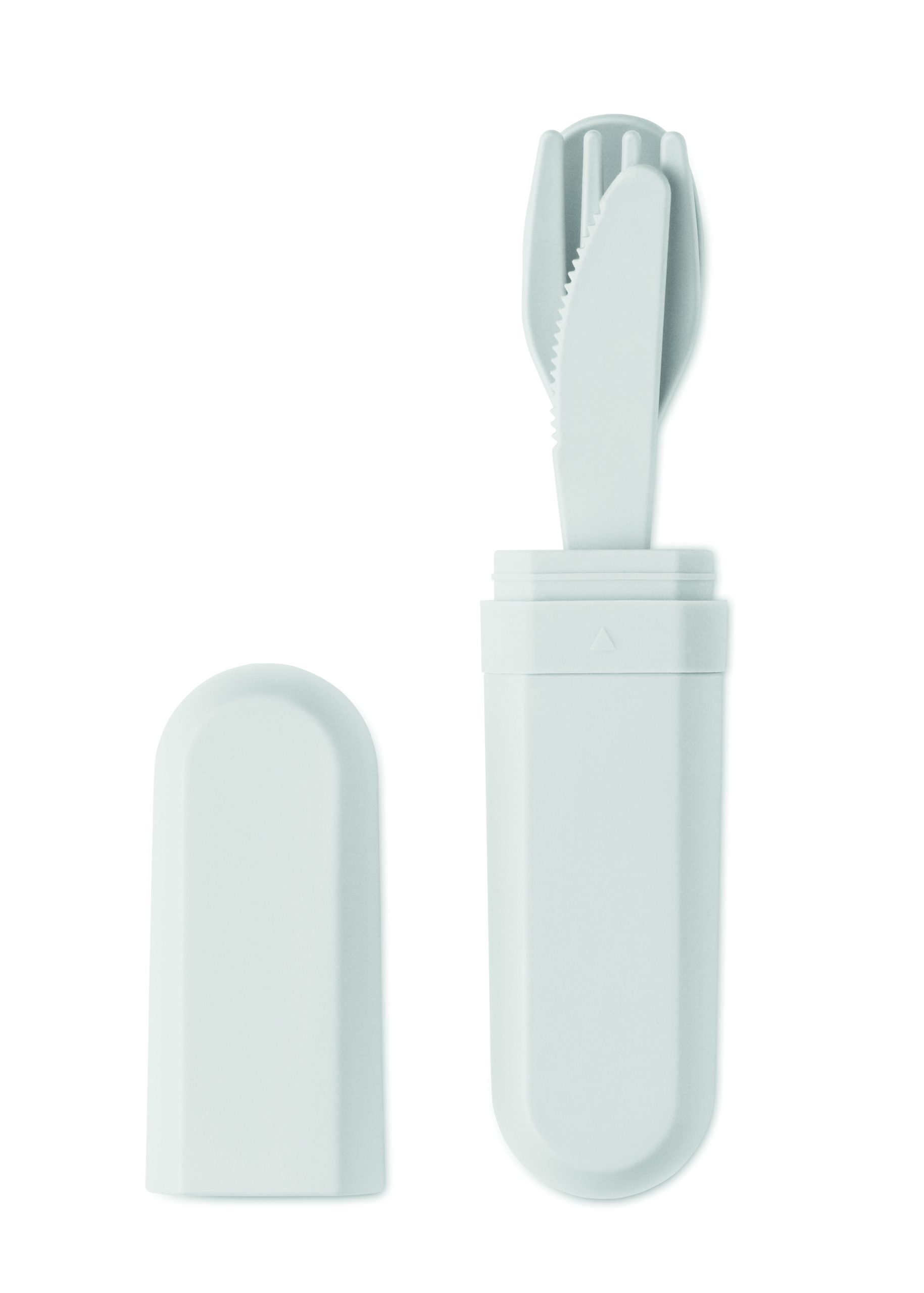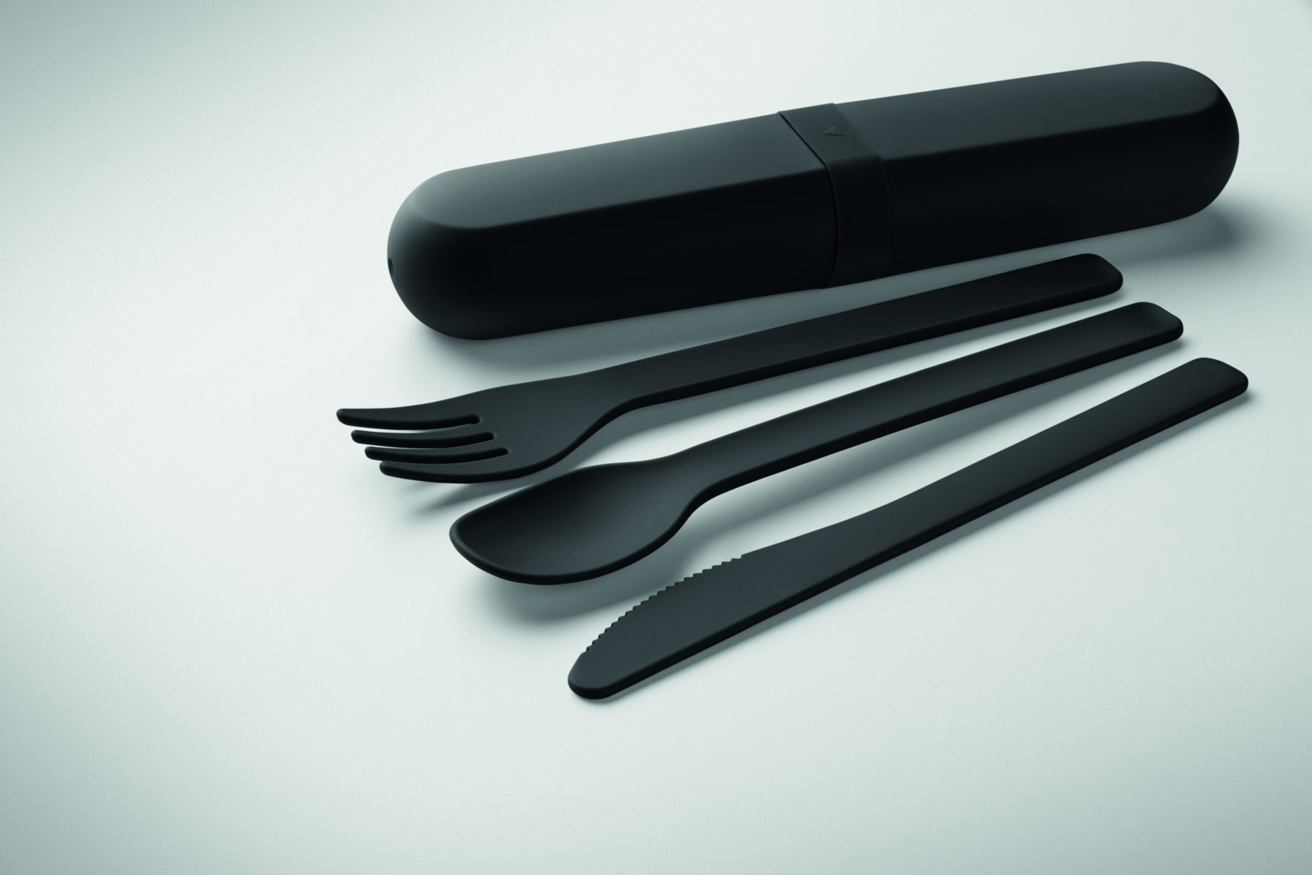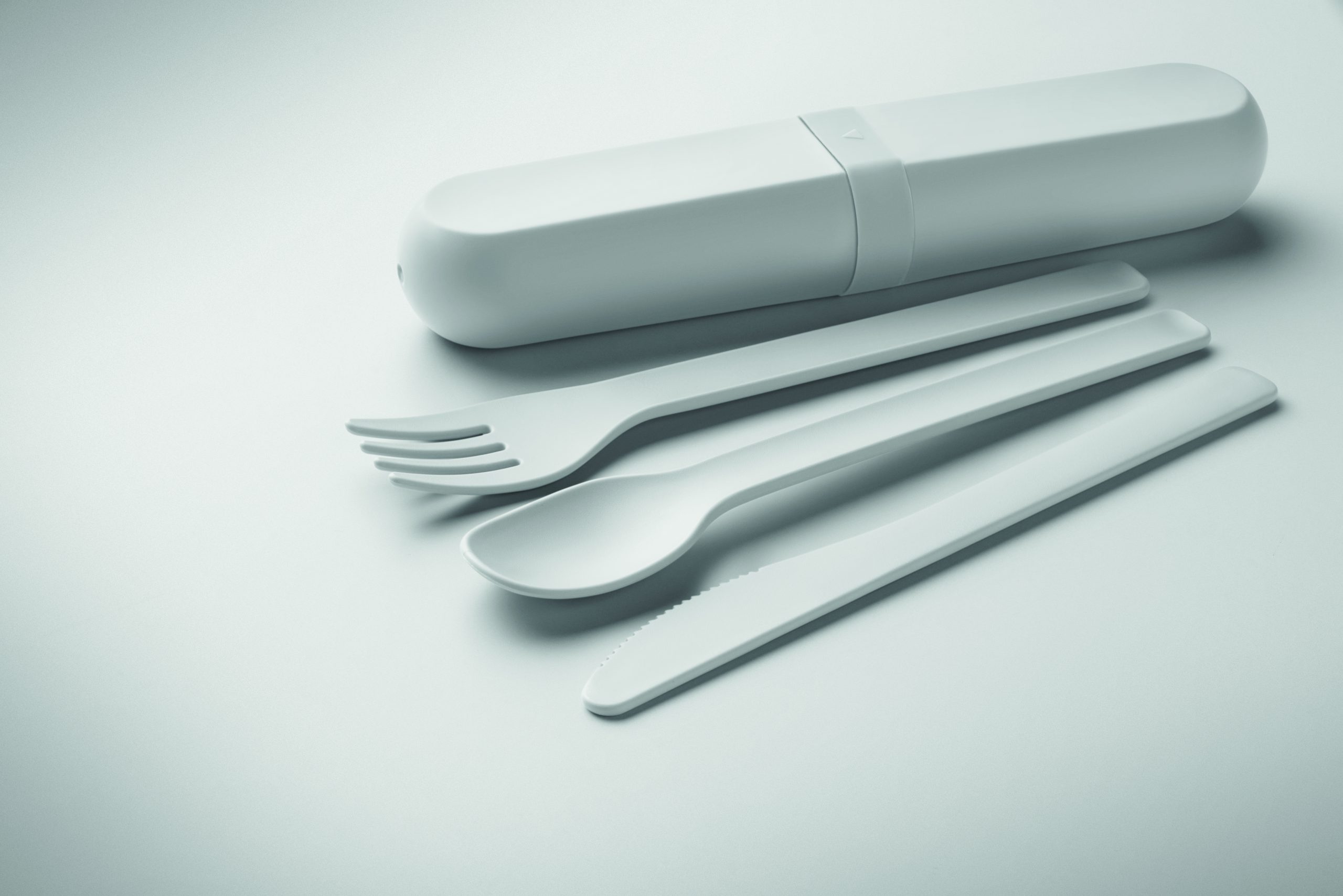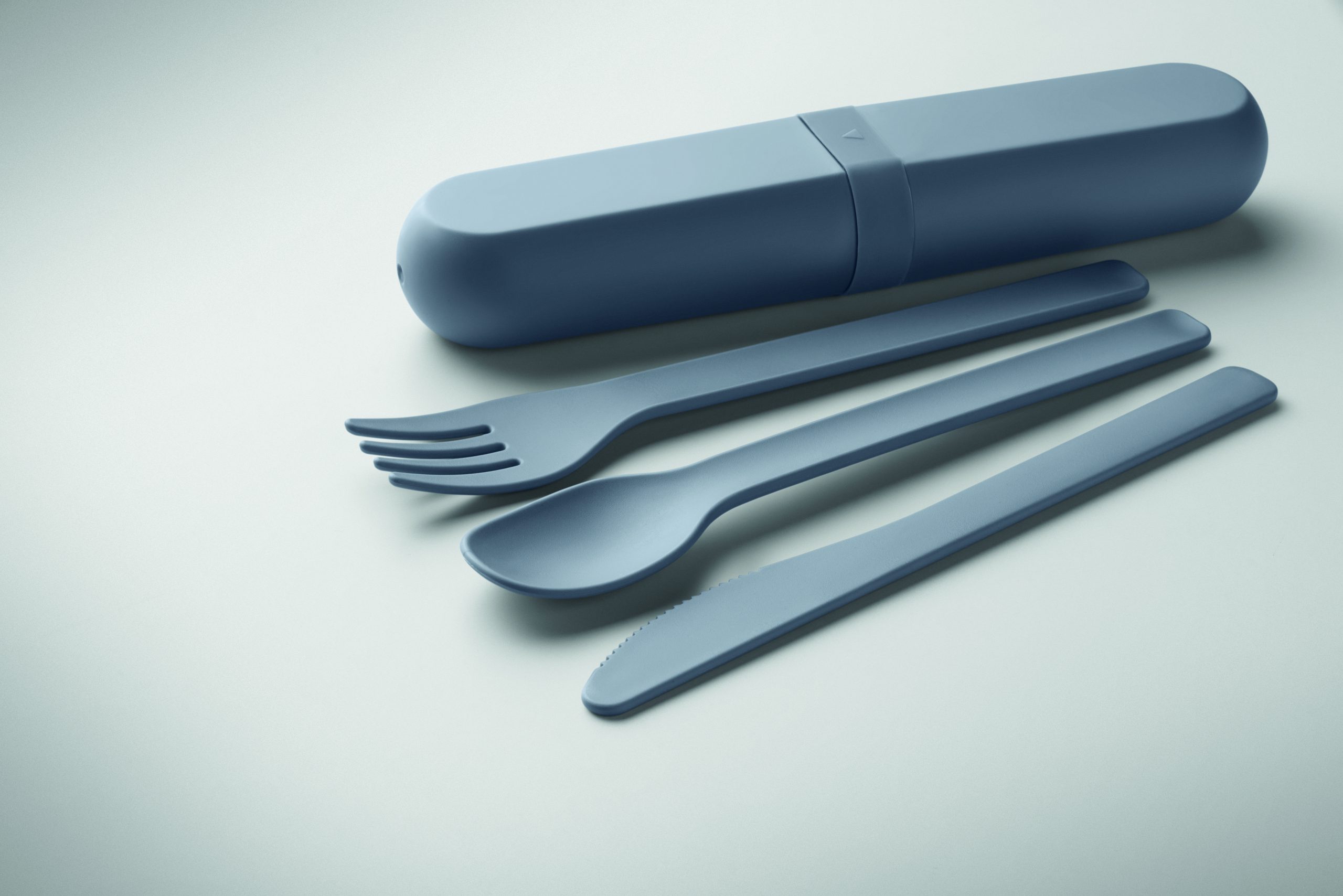 Zestaw sztućców wielokrotnego użytku z etui z kukurydzy PLA. Każdy zestaw zawiera widelec, nóż, łyżkę i praktyczne, przenośne etui na sztućce.