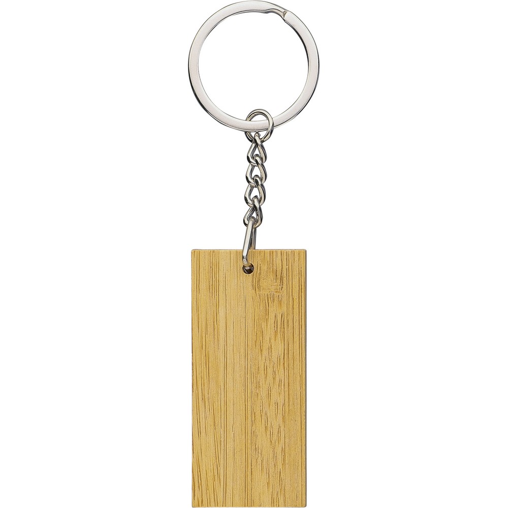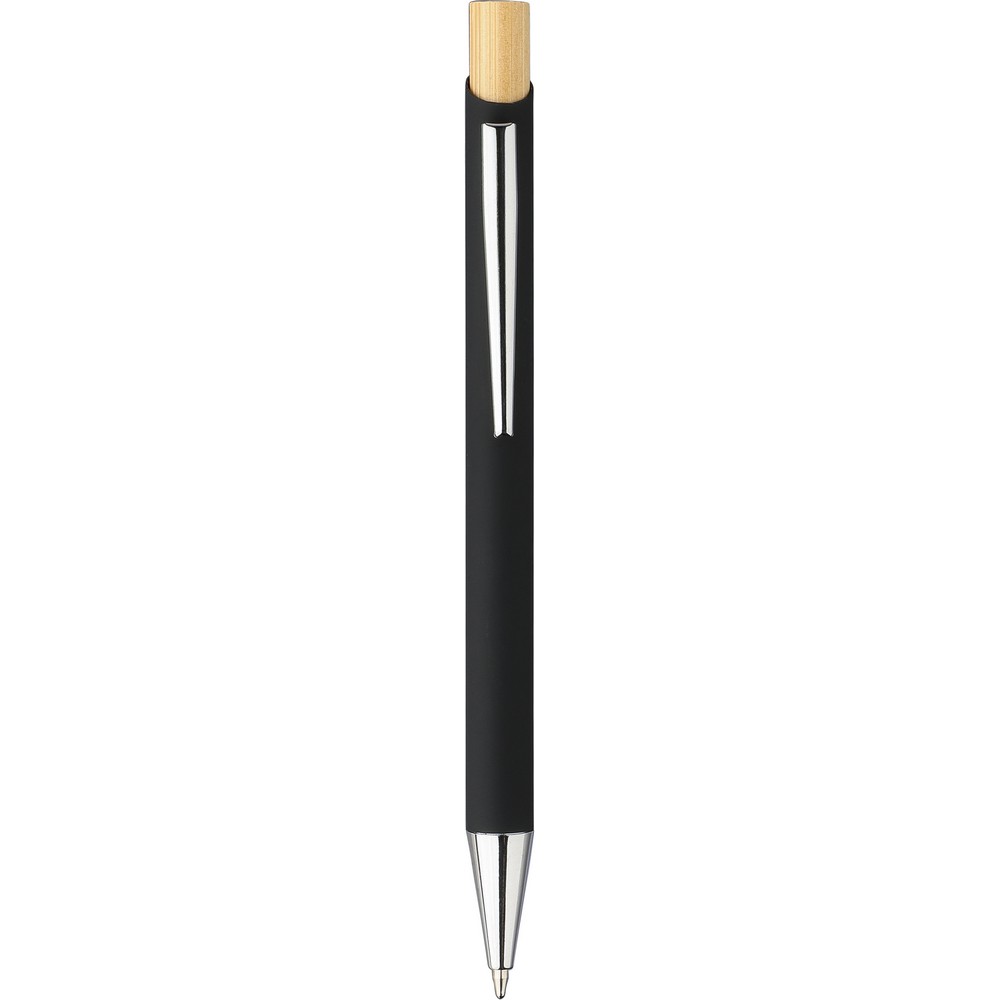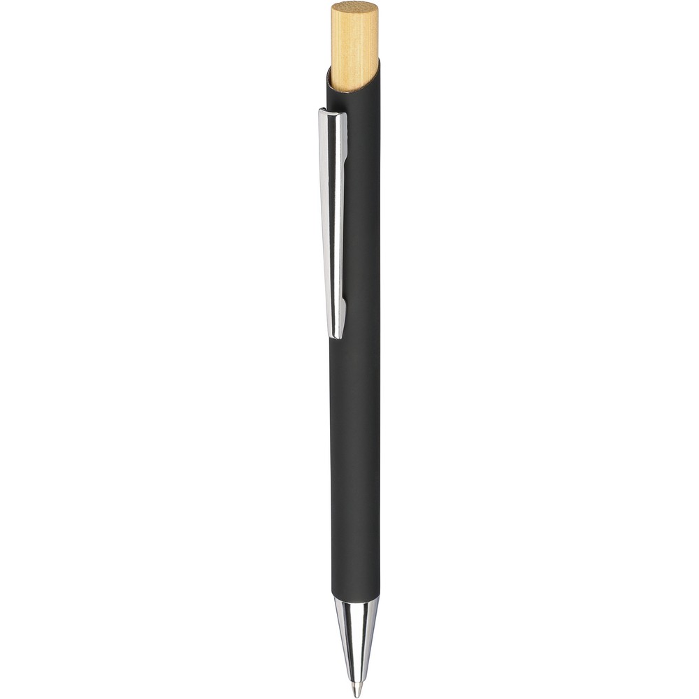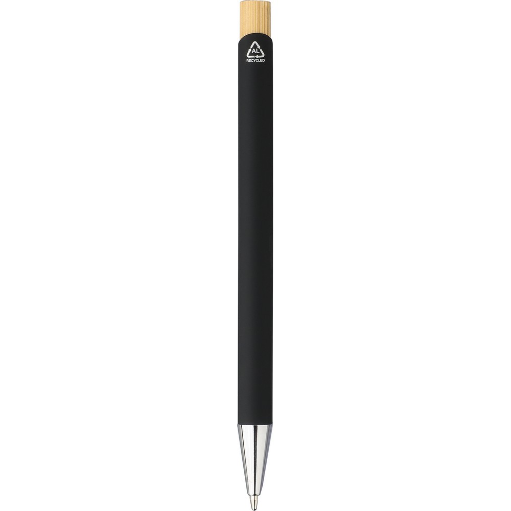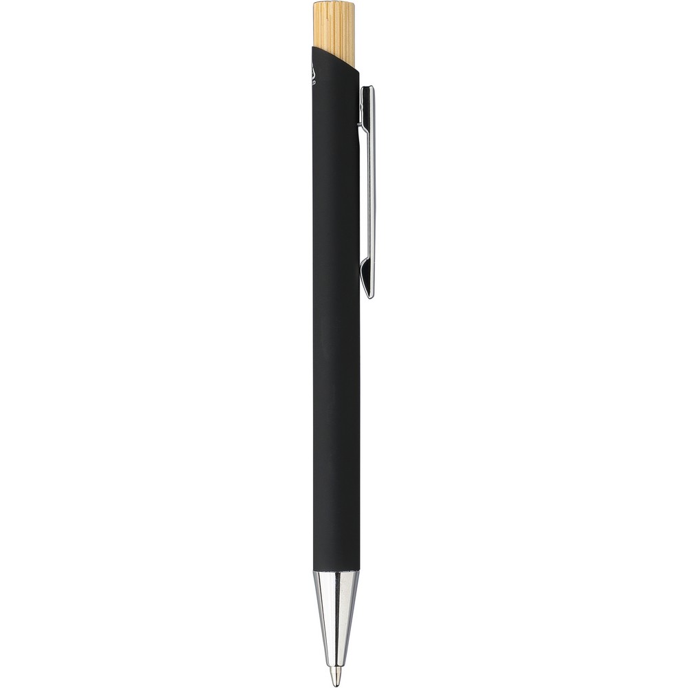 Zestaw upominkowy: długopis z przyciskiem i chromowaną, plastikową końcówką, wkład w niebieskim kolorze, prostokątny brelok, ikona recyklingu na obu produktach, zapakowane w kartonik kraftowy z aksamitną wyściółką, produkt wykonany z bambusa, ABS i metalu