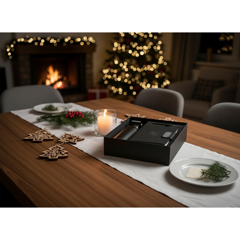 Zestaw upominkowy w ozdobnym pudełku: butelka termiczna ze stali nierdzewnej, podwójne ścianki ze stali nierdzewnej, długo utrzymuje temperaturę nie oddając jej na zewnątrz, wykonana w całości ze stali 304, uchwyt ułatwiający noszenie, długopis posiada wkład w niebieskim kolorze, notatnik 80 kartek w linie (70 g/m²), magnetyczne zamknięcie, grawerowana plakietka, tasiemka zakładkowa umożliwia wygodne zaznaczanie ostatniej strony lub ważniejszych notatek, ikona recyklingu na produkcie na wszystkich produktach, produkt wykonany z RPET