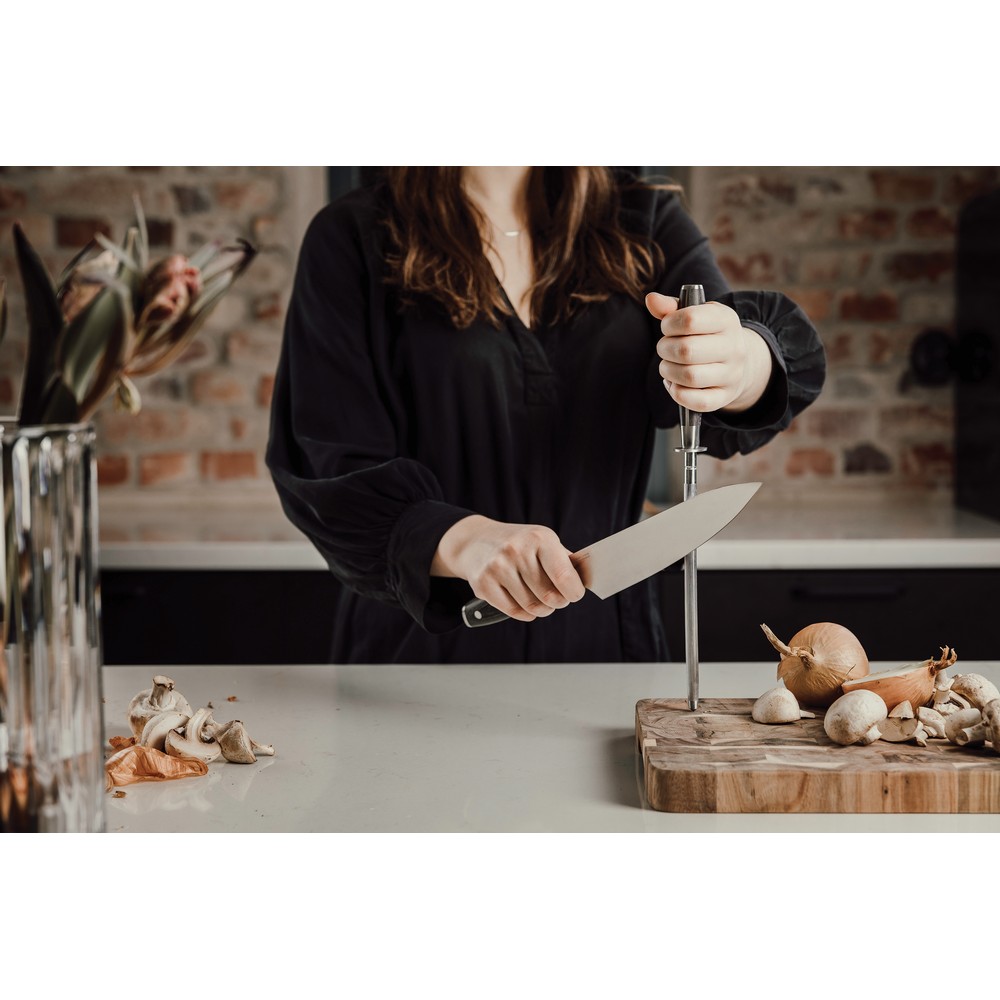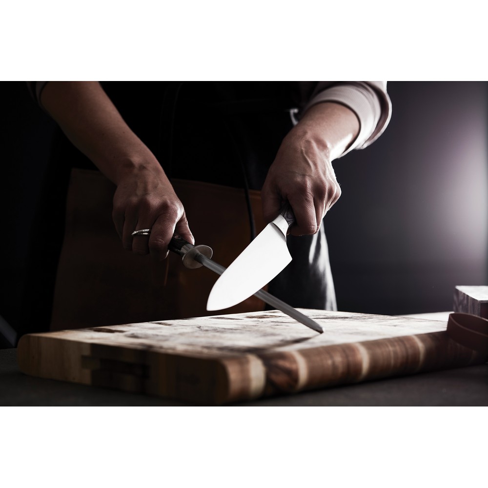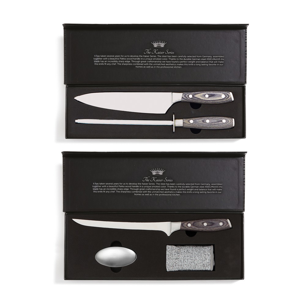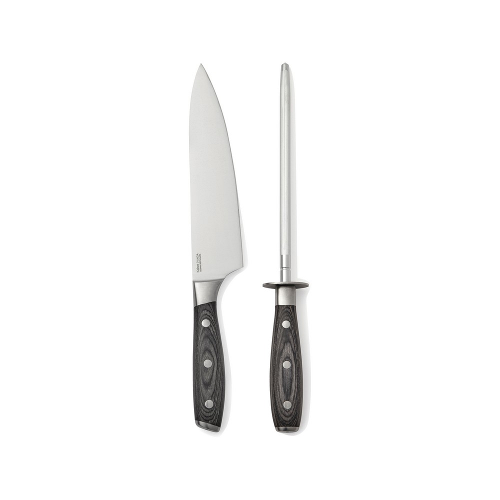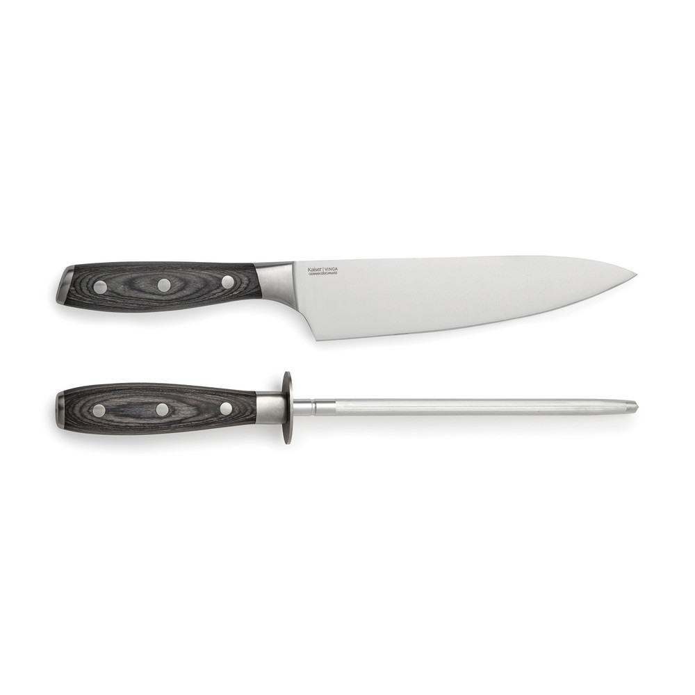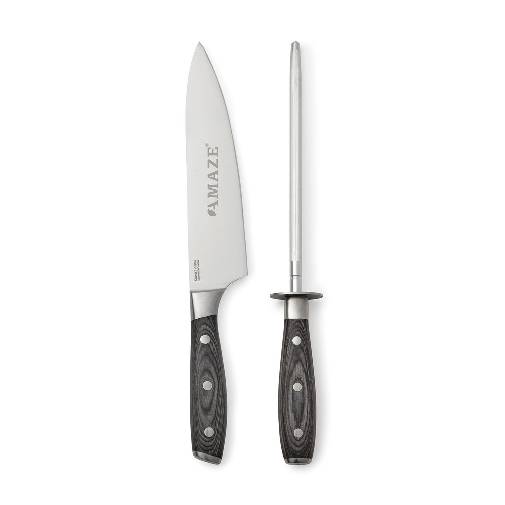 Zestaw nóż i ostrzałka, wykonane z niemieckiej stali X50CrMoV15, uchwyty z drewna pakka, nóż szefa kuchni 33 cm (ostrze 20 cm), ostrzałka 33 cm, w pudełku upominkowym