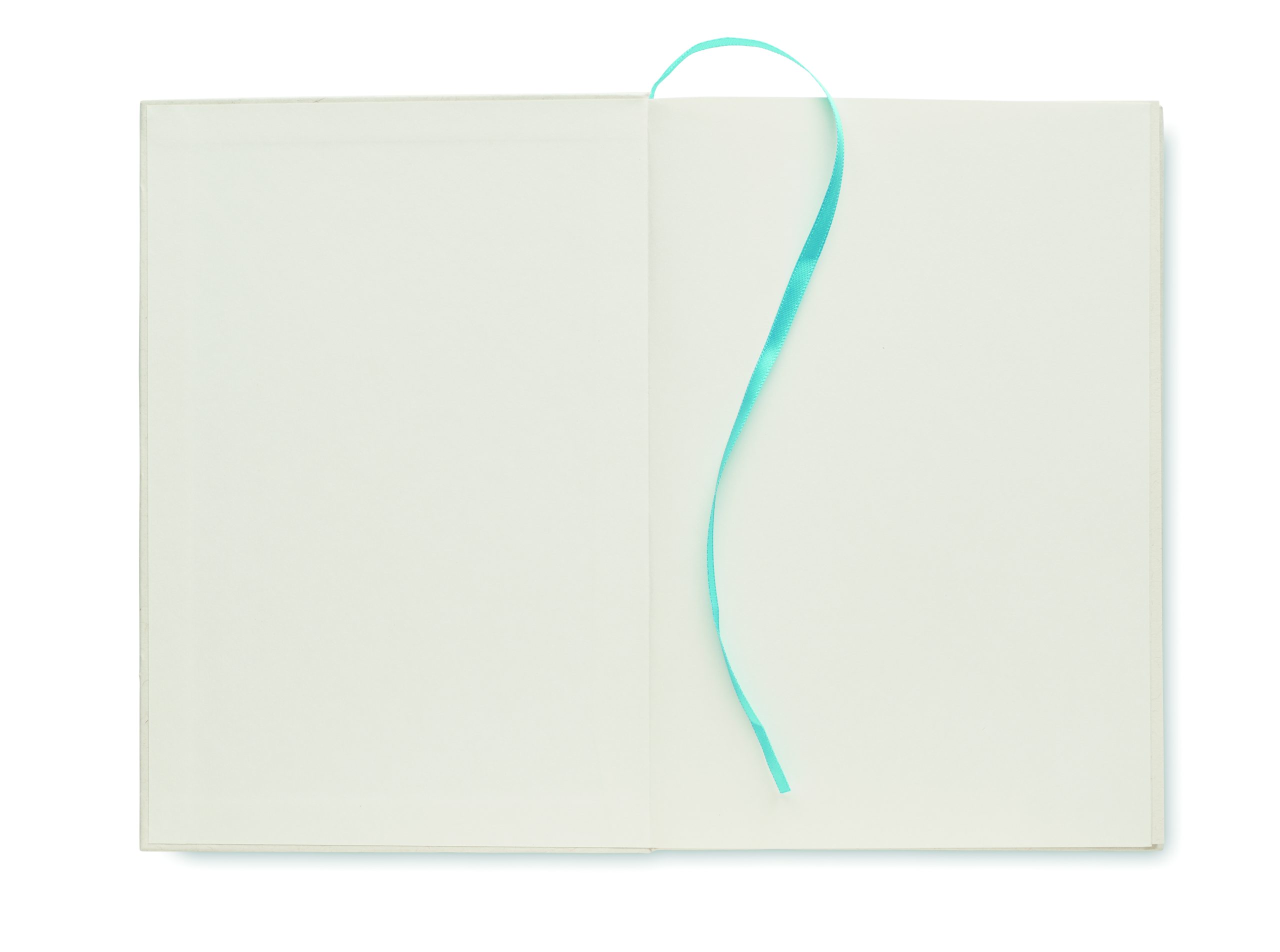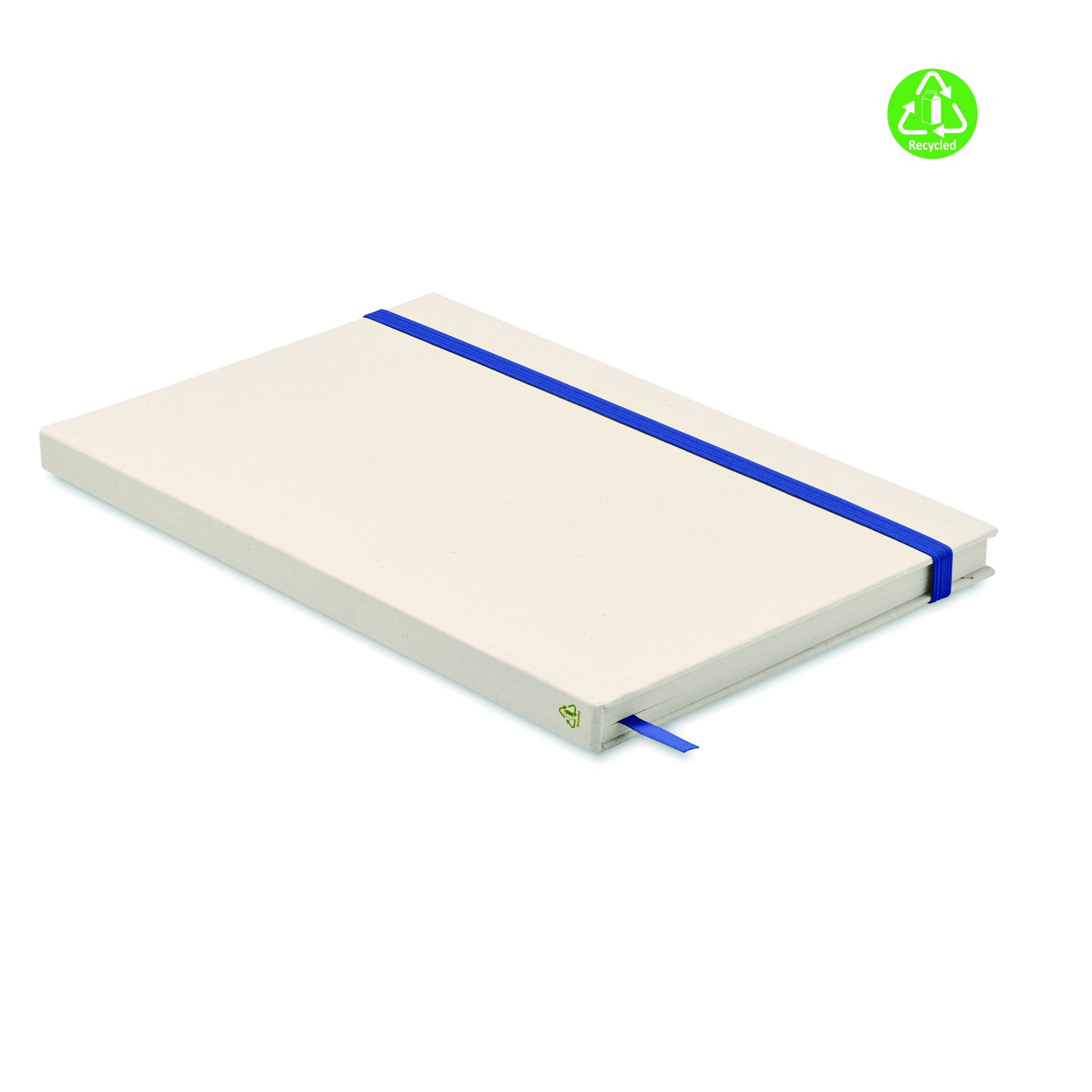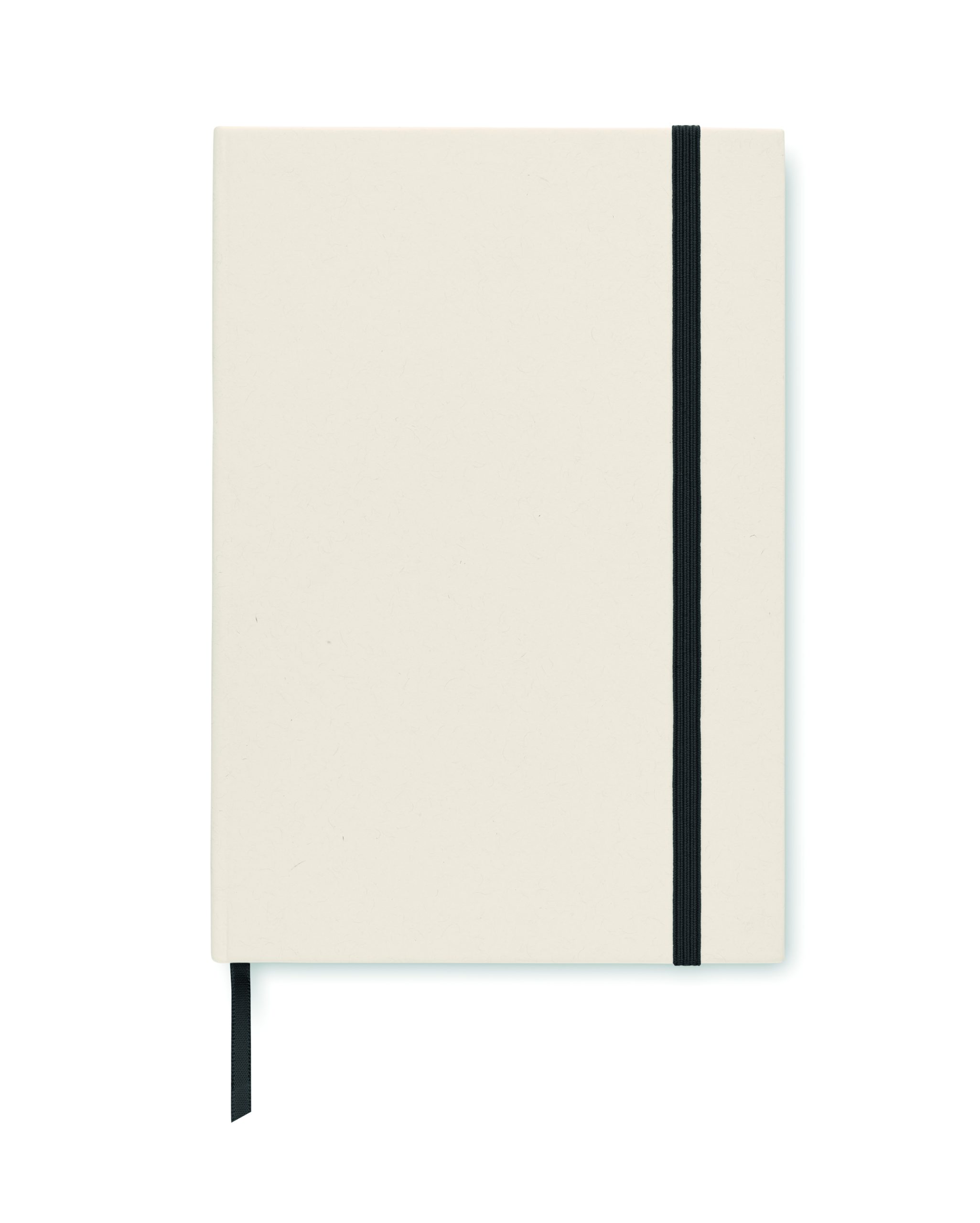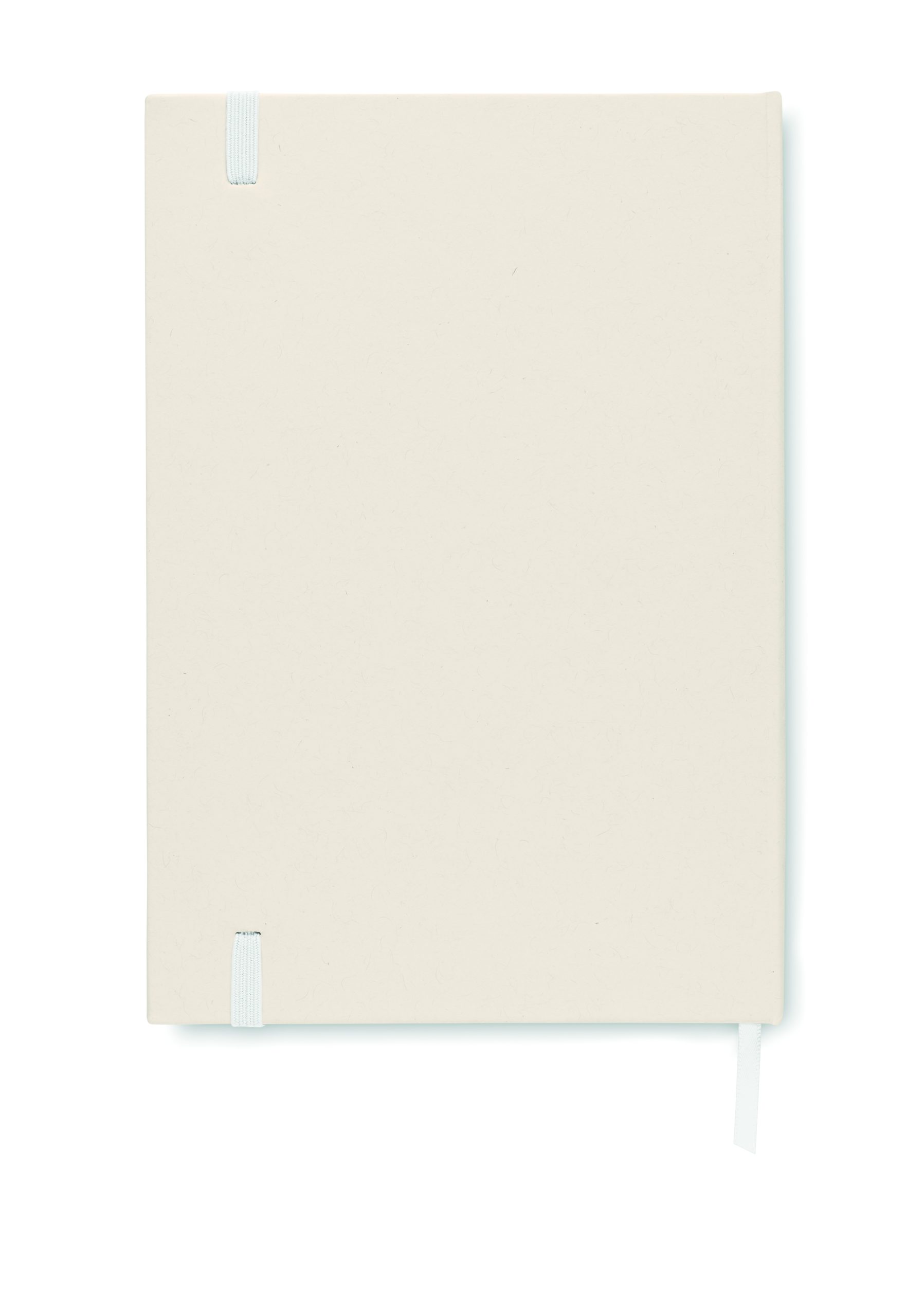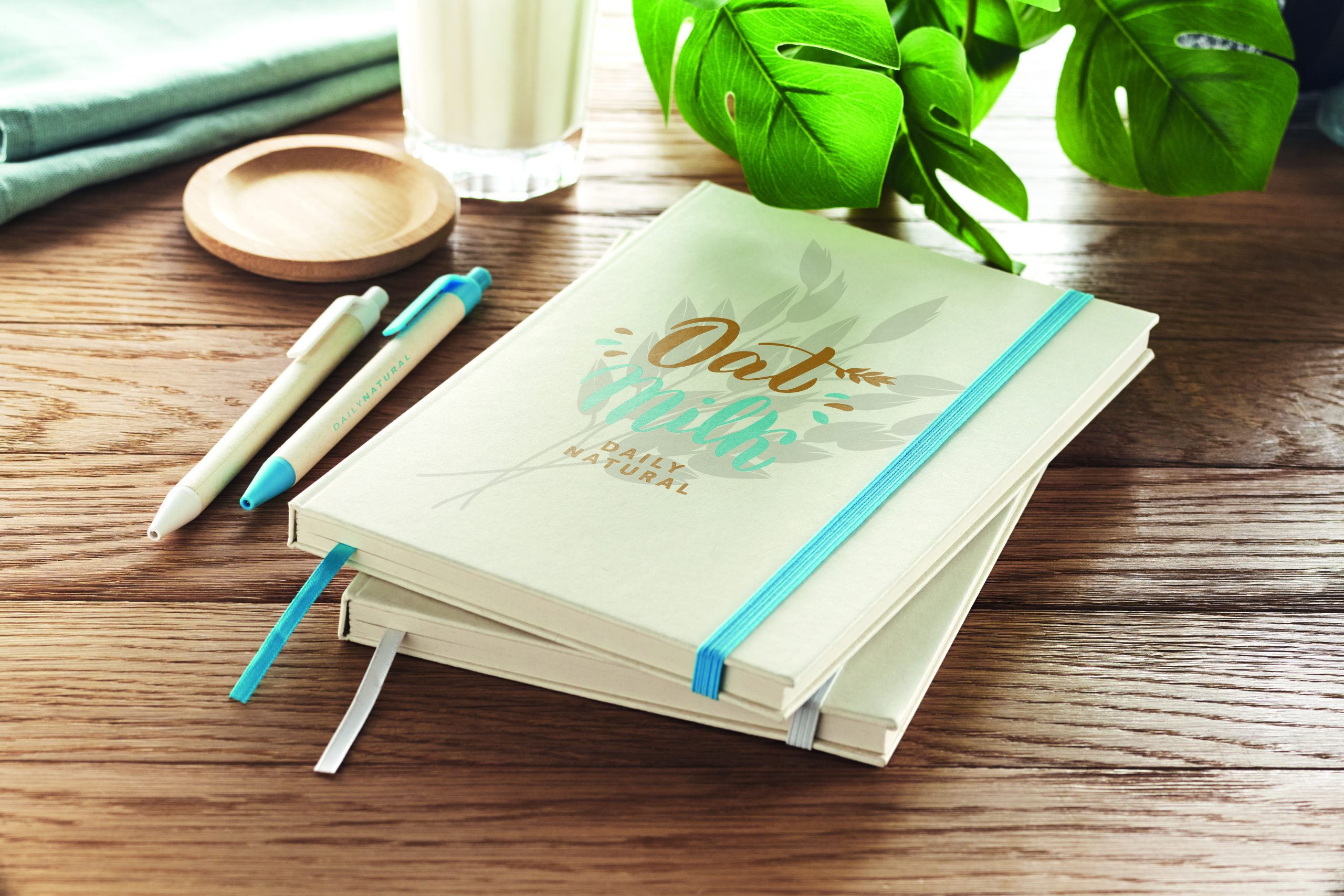 Zeszyt A5 z twardą okładką i 160 stronami w linie (80 kartek 80 g/m²) wykonany w 70% z kartonów po mleku i w 30% z papieru z recyklingu. Elastyczny pasek zamykający, zakładka z tasiemki.